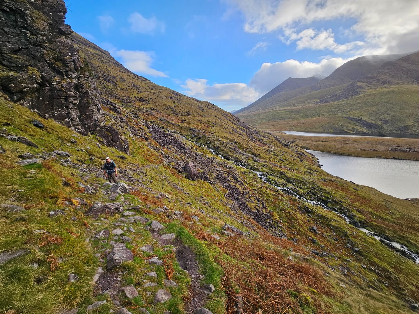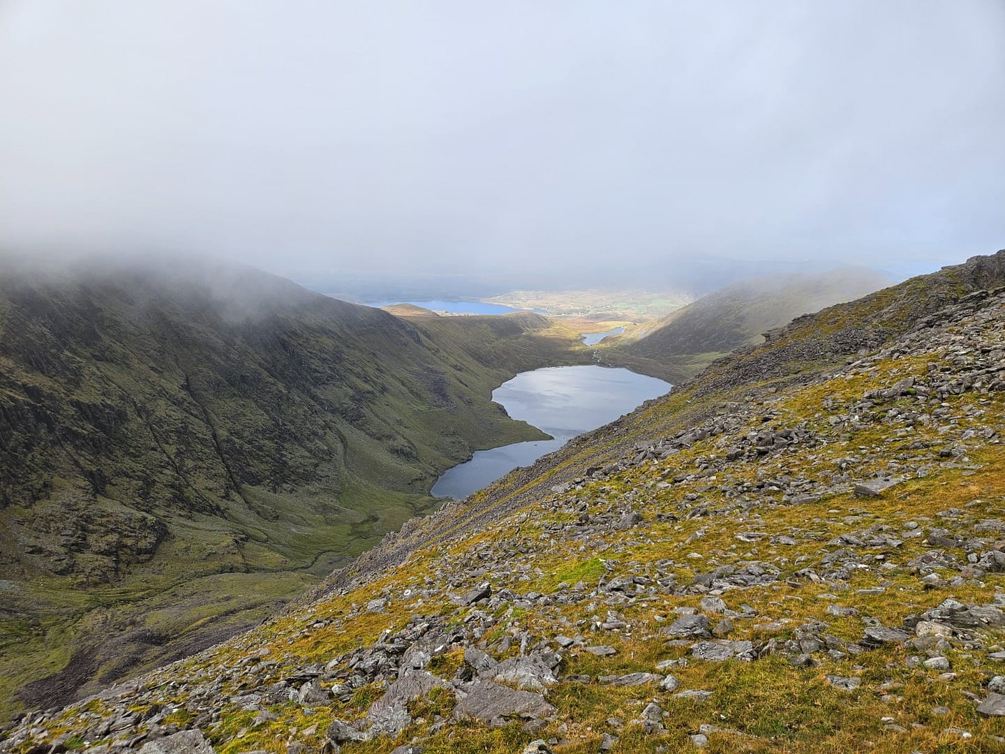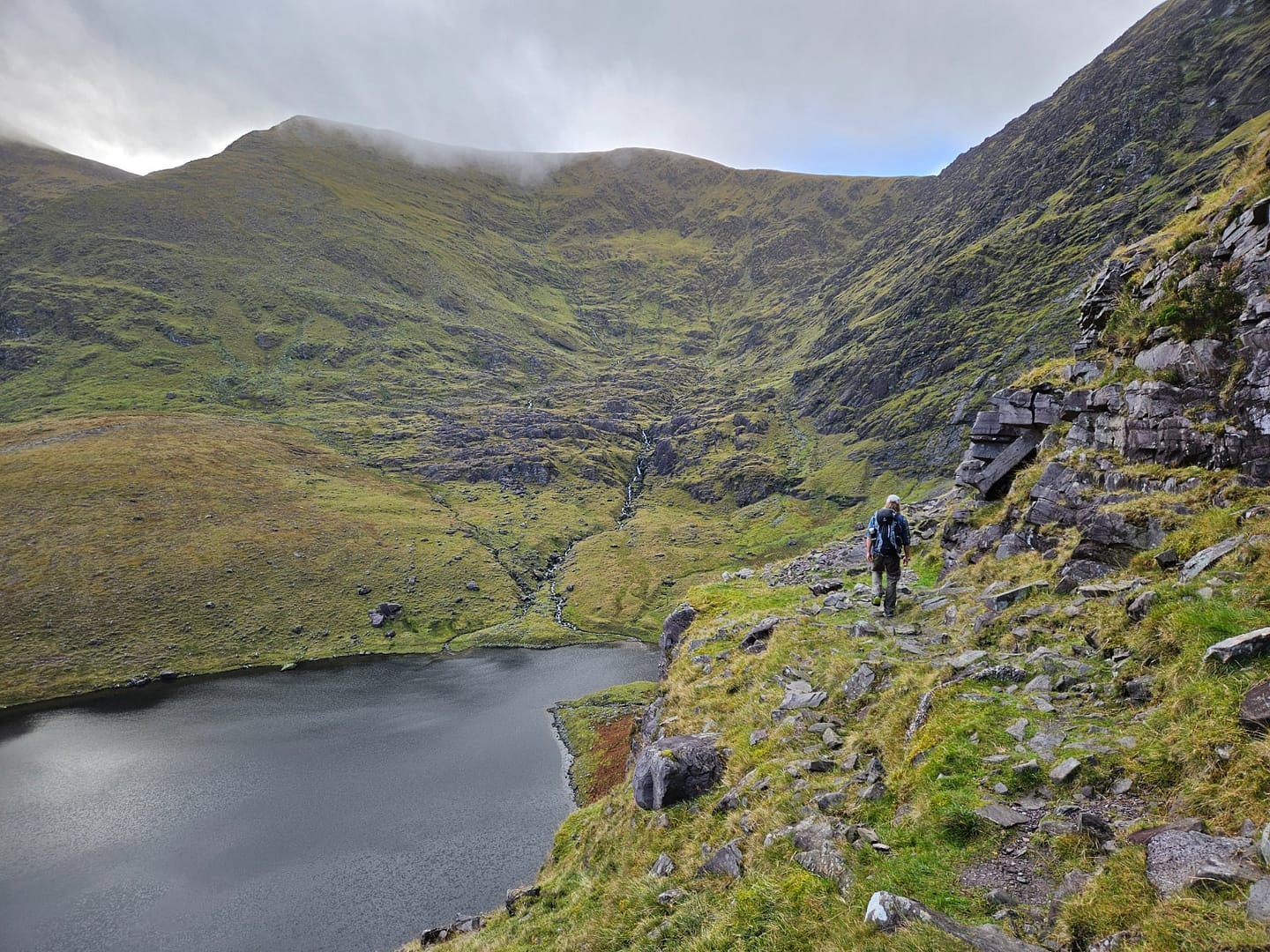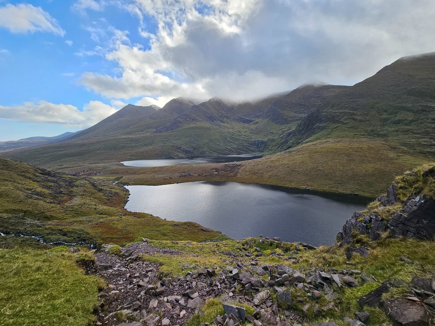 Auf 730 m Höhe erreichen wir einen weiteren See, von dem aus es steil durch eine Schuttrinne hinaufgeht. Der anspruchsvolle Aufstieg führt uns bis zum Grat zwischen den Gipfeln The Bones und Carrauntoohil. Von hier bieten sich spektakuläre Ausblicke auf weitere Seen – sofern die Wolken den Blick freigeben.