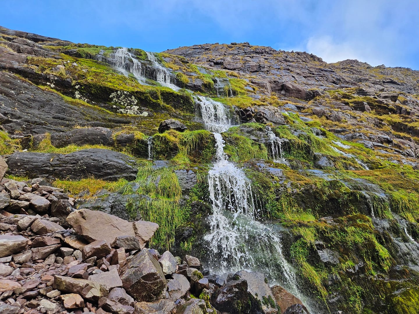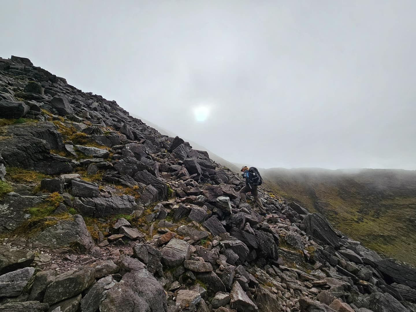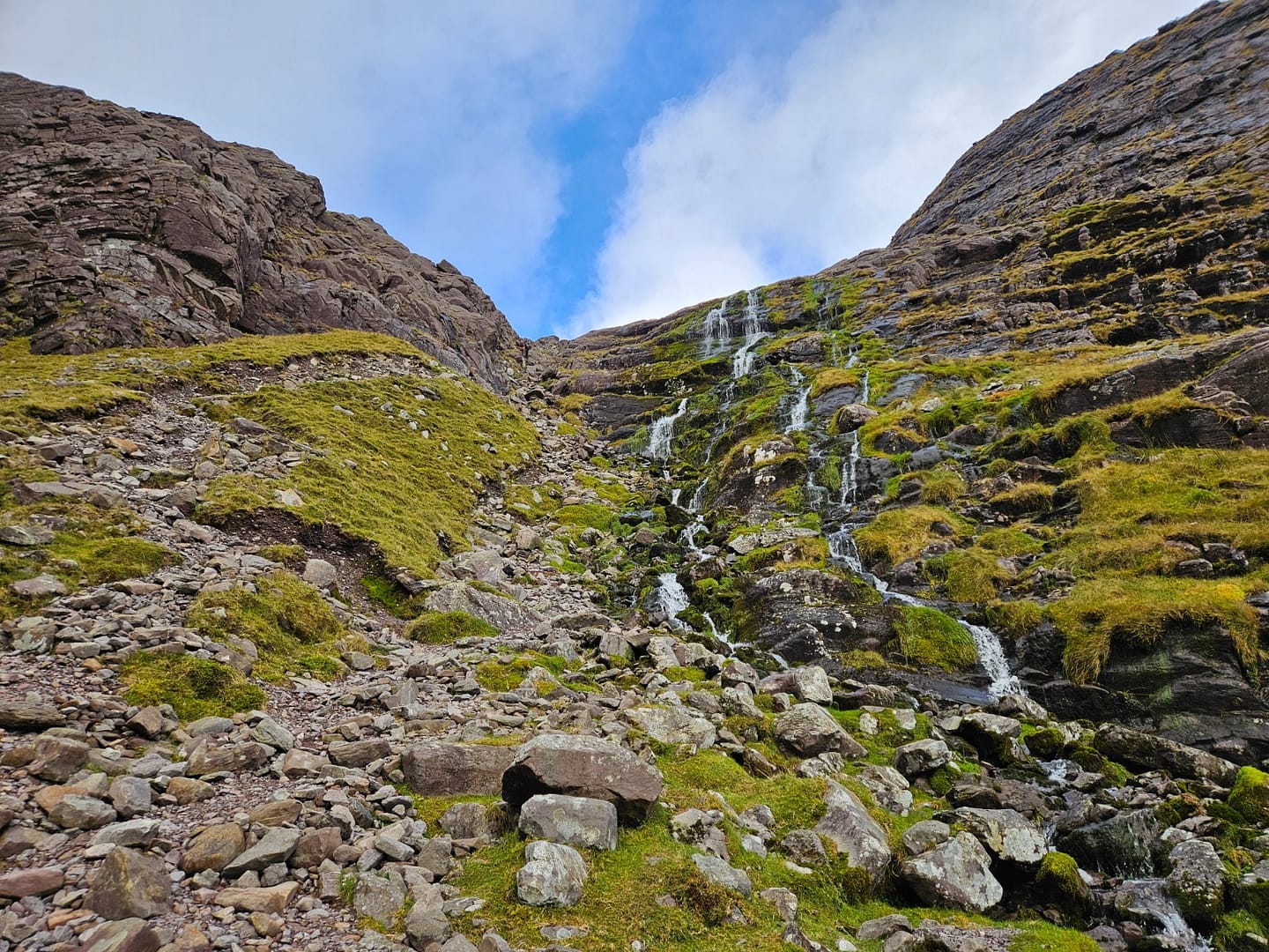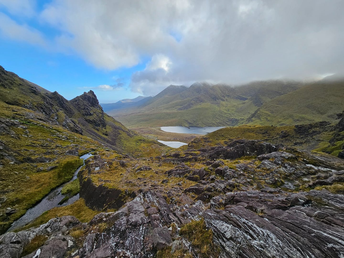 Auf 730 m Höhe erreichen wir einen weiteren See, von dem aus es steil durch eine Schuttrinne hinaufgeht. Der anspruchsvolle Aufstieg führt uns bis zum Grat zwischen den Gipfeln The Bones und Carrauntoohil. Von hier bieten sich spektakuläre Ausblicke auf weitere Seen – sofern die Wolken den Blick freigeben.