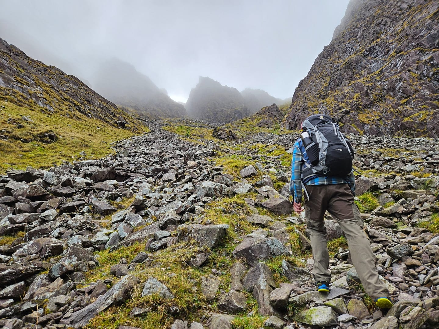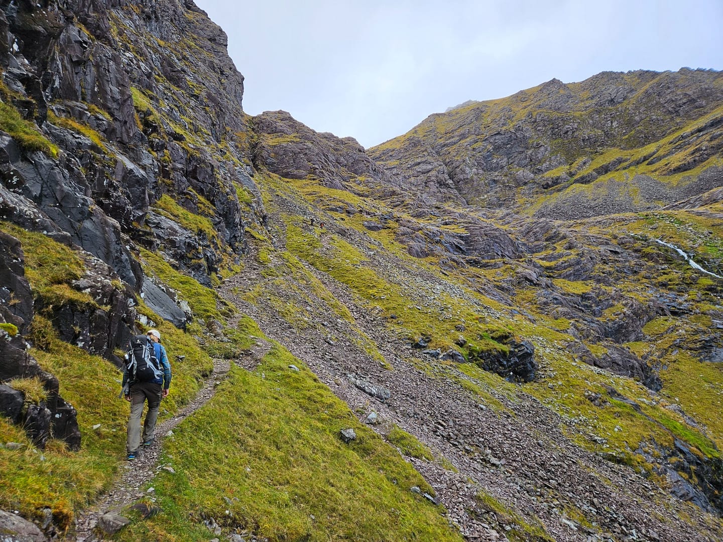 Vom Gipfel steigen wir in südöstlicher Richtung bis auf etwa 735 m ab. Anschließend geht es über die berüchtigte Teufelsleiter steil nordöstlich bergab. Diese „Leiter“ gleicht eher einem rutschigen Bachbett aus losem Geröll und erfordert höchste Konzentration. Eine alternative Route führt über den Gipfel Cnoc na Toinne. Unten angekommen, wandern wir zwischen zwei Seen hindurch zurück zum breiten Forstweg, auf dem unsere Tour begann.