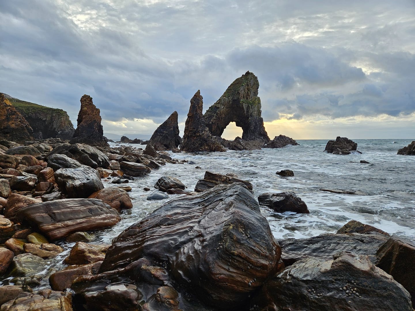 Unweit des kleinen Ortes Maghery erhebt sich ein beeindruckendes Naturdenkmal aus dem Atlantik: der Crohy Head Sea Arch (Felsbogen), auch bekannt als The Breeches oder Brístí – Irisch für „die Hosen“. Wer den 25 Meter hohen Felsbogen zum ersten Mal sieht, weiß warum: Die Form erinnert tatsächlich an ein Paar Hosenbeine, durch das das Meer hindurchfließt. Der Bogen besteht aus Quarzit, einem extrem harten Gestein, das vor über 600 Millionen Jahren aus uraltem Sand entstanden ist – geformt durch den Druck kollidierender Kontinentalplatten.