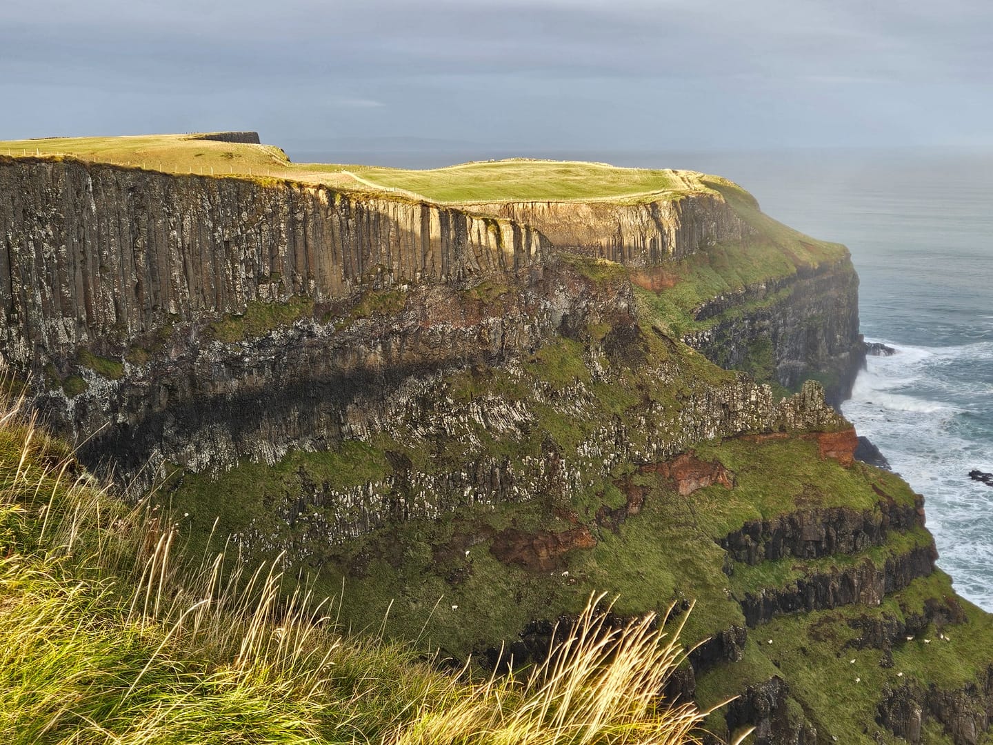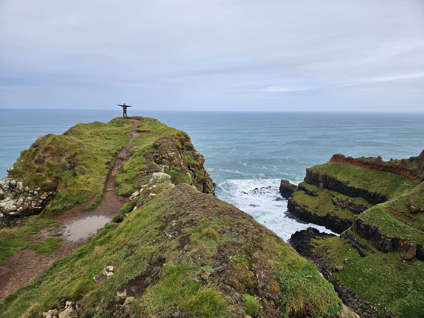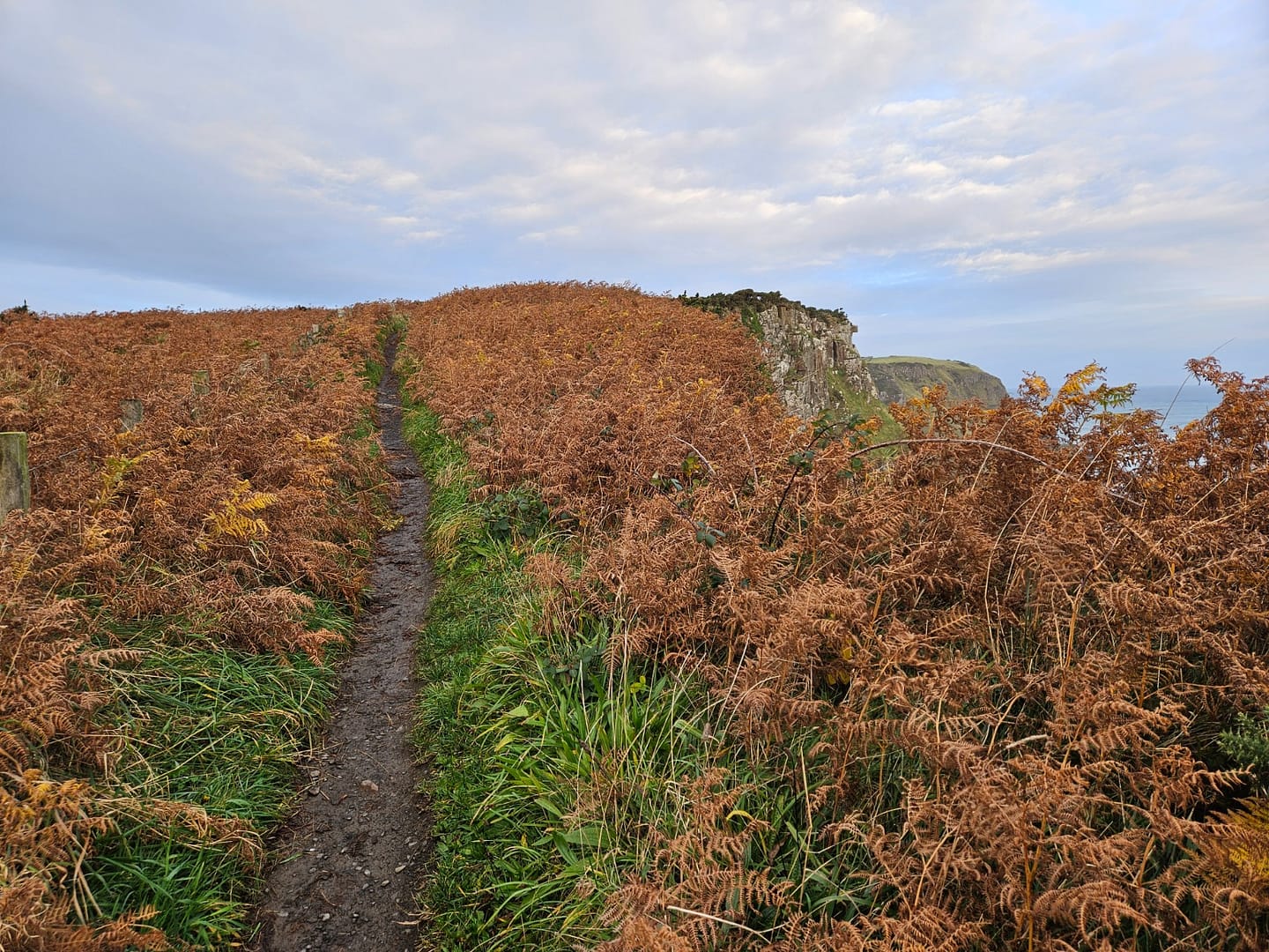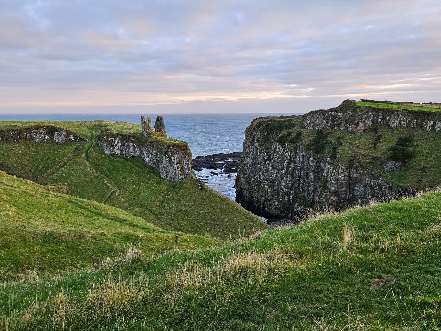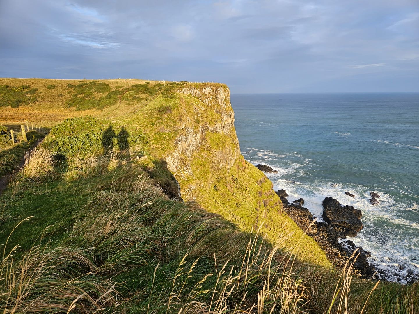 Unsere Tour startete am kleinen Parkplatz nahe den Überresten von Dunseverick Castle. Viel steht vom einst stolzen Bau nicht mehr, aber der Ort hat etwas Magisches – allein die Vorstellung, dass hier einst Könige residierten, verleiht dem Start einen besonderen Reiz. Start am Dunseverick Castle: Von dort aus folgten wir dem Causeway Coast Way, einem Abschnitt des längeren Ulster Way. Der Weg führt entlang der Steilküste, teils über Wiesen, teils auf festen Pfaden. Immer wieder öffnet sich der Blick auf das Meer, auf bizarre Felsformationen, schäumende Wellen und grüne Hügel, die sich sanft gegen den Horizont lehnen.