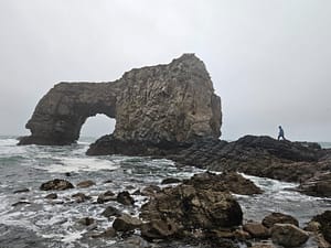 Es gäbe wohl eine Möglichkeit, über die Klippen hinüberzuklettern, um dennoch dorthin zu gelangen, aber wir haben uns bewusst dagegen entschieden. Die raue Brandung und das Spiel der Wellen waren auch so beeindruckend genug. Stattdessen haben wir die Zeit genutzt, um auf die vorgelagerten Felsen im Wasser zu klettern und einfach die Kraft des Atlantiks auf uns wirken zu lassen.