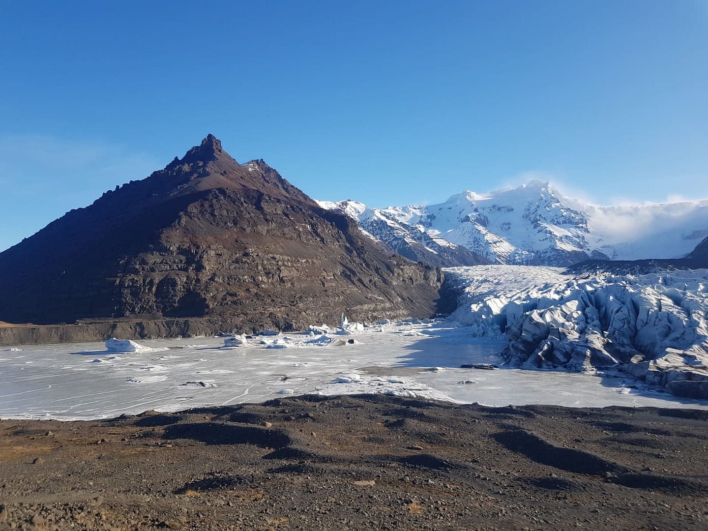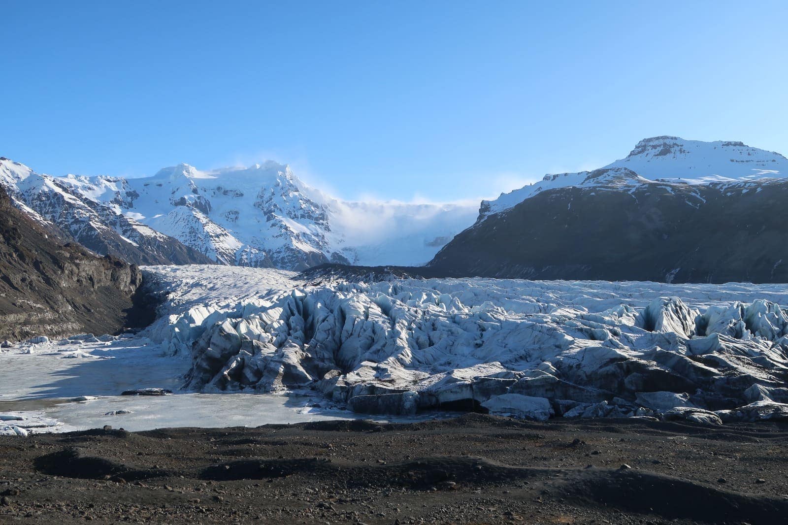 Es ist wirklich beeindruckend, an diesem Ort innezuhalten, die Ruhe zu genießen und die faszinierende Landschaft auf sich wirken zu lassen. Die Eismassen des Gletschers sind ständig in Bewegung, und die Landschaft verändert sich fortlaufend. Mit einem erstaunlichen Tempo von bis zu einem Meter pro Tag bewegt sich der Gletscher, ein faszinierendes Spektakel, das man nicht wirklich sieht aber hören kann: das leise Knistern und lauteres Knacken, während sich die Eisformationen langsam verschieben. In der Sonne strahlt das Eis des Gletschers in blendendem Weiß und schimmerndem Blau, durchzogen von dunklen Schichten, Relikten vergangener Vulkanausbrüche.