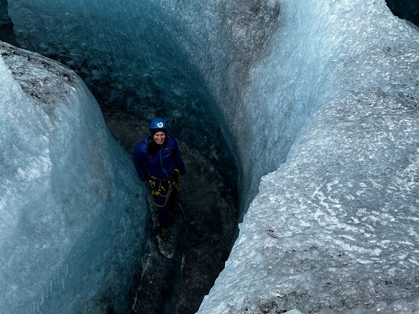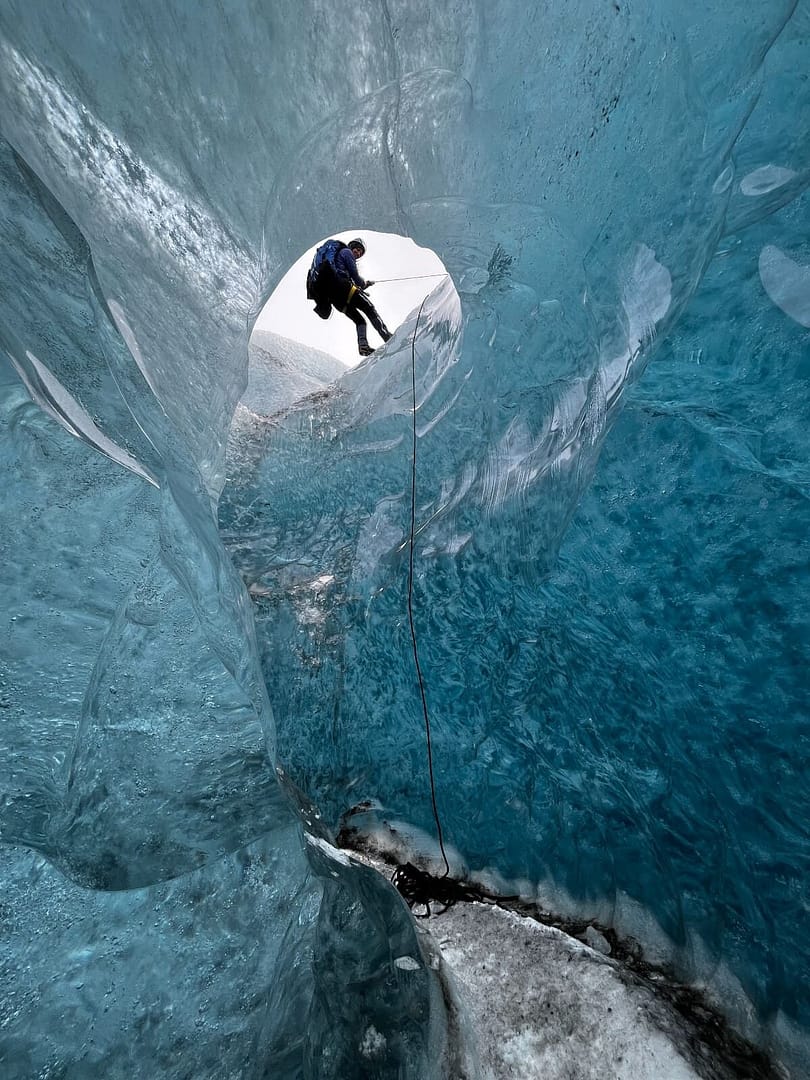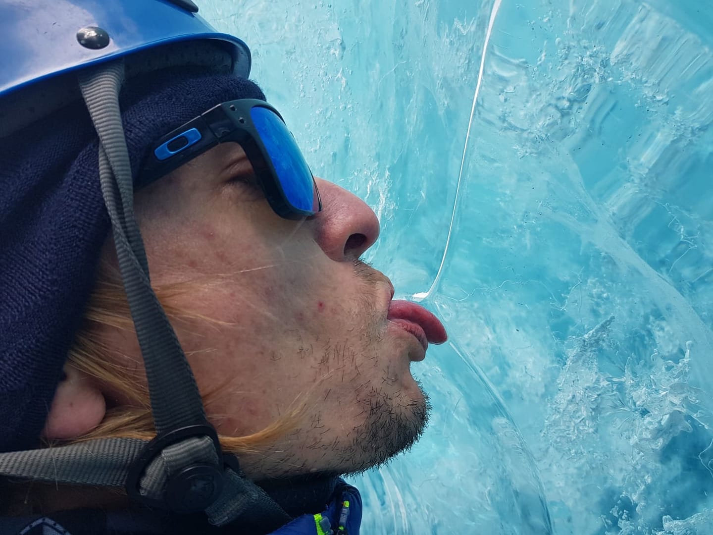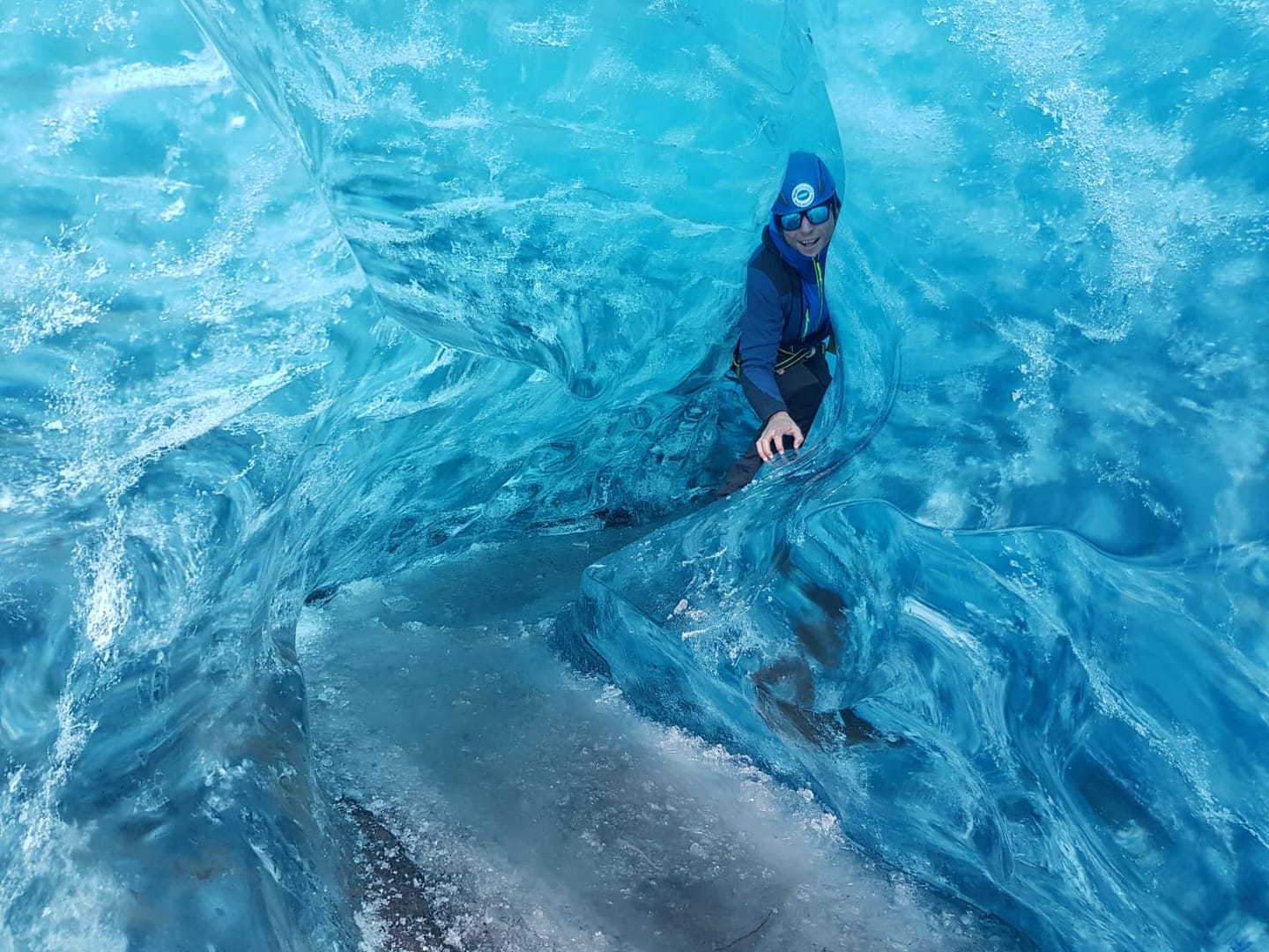 Besonders beeindruckend war das tiefblaue Eis in den Mühlen. Wenn das Sonnenlicht tiefer in das Eis eindringt, werden die warmen Farben absorbiert und hauptsächlich blaues Licht wird zurückreflektiert. Das Ergebnis? Eine atemberaubende, tiefe blaue Farbe, die Gletscher so einzigartig macht. Die Dicke des Gletschereises verstärkt die Intensität dieser blauen Farbe zusätzlich.