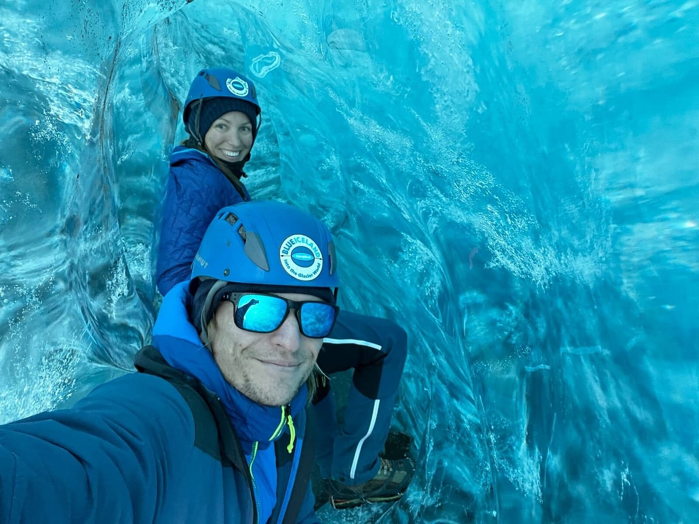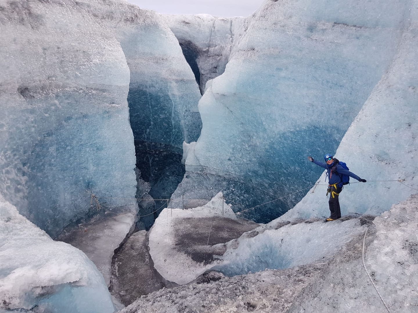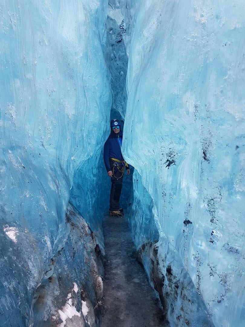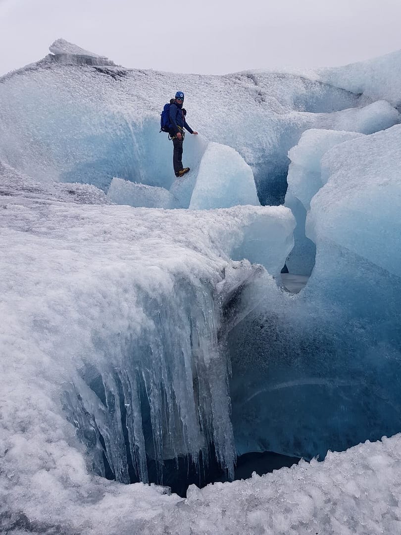 Besonders beeindruckend war das tiefblaue Eis in den Mühlen. Wenn das Sonnenlicht tiefer in das Eis eindringt, werden die warmen Farben absorbiert und hauptsächlich blaues Licht wird zurückreflektiert. Das Ergebnis? Eine atemberaubende, tiefe blaue Farbe, die Gletscher so einzigartig macht. Die Dicke des Gletschereises verstärkt die Intensität dieser blauen Farbe zusätzlich.