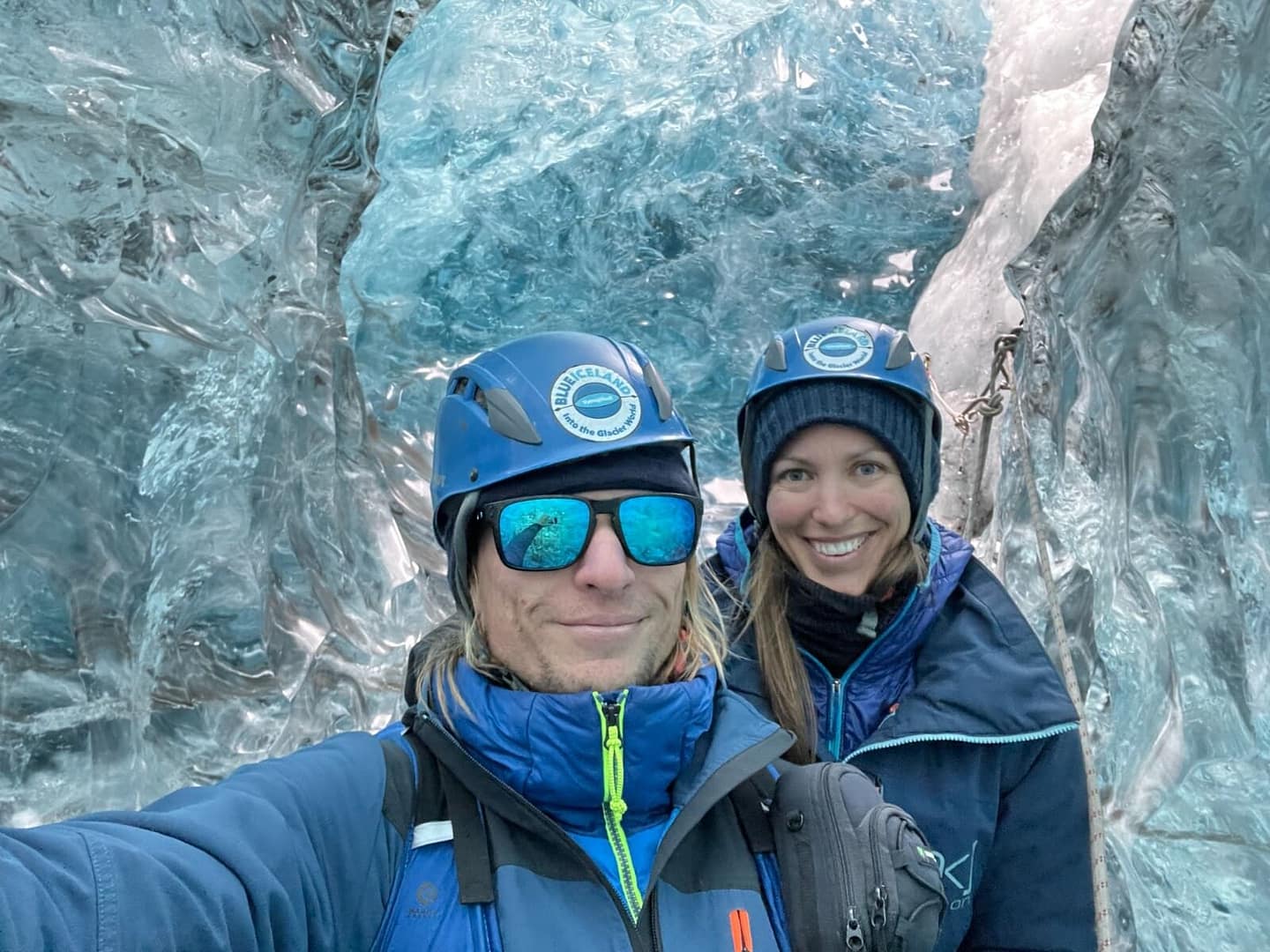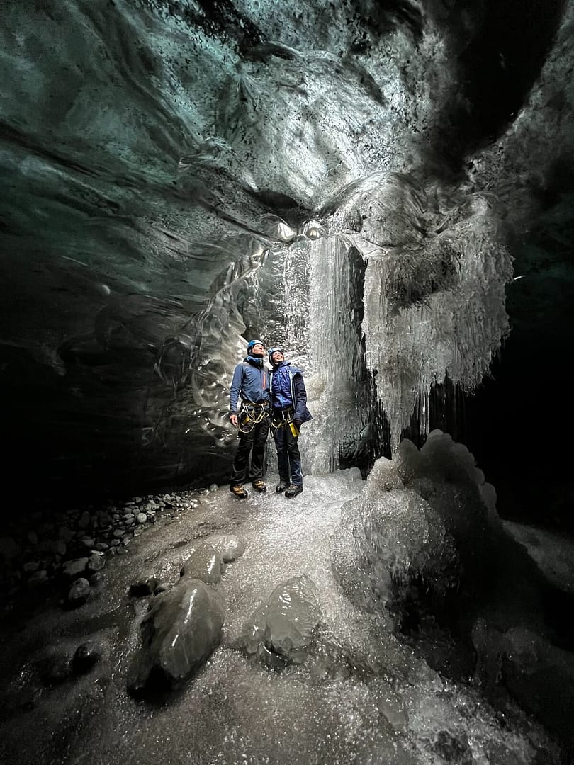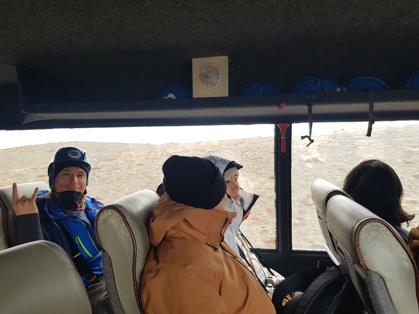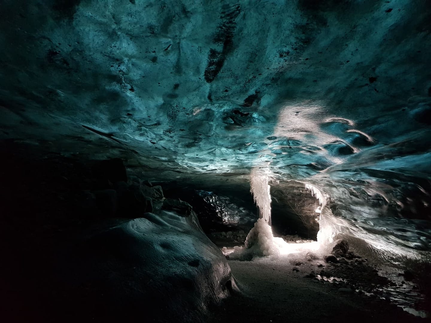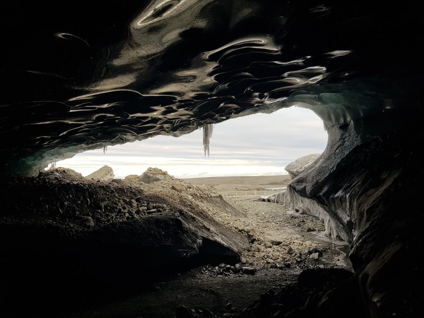 Zum Abschluss erkundeten wir noch eine Eishöhle. Die Höhle war zwar nicht besonders groß, aber dennoch beeindruckend. Zuerst gingen wir ein paar in das Eis gehauene Stufen hinab und standen in einer Art „Vorraum“. Das war schon faszinierend! Dann ging es, mit Handylicht ausgerüstet und halb gebückt, durch einen Gang. Am Ende schalteten wir das Licht aus, und die Decke leuchtete in einem strahlenden Blau. WOW! (Die Bilder geben es nicht so gut wieder). Es war wirklich spannend, dies mitzuerleben. Obwohl wir uns die Höhle etwas größer vorgestellt hatten, genossen wir das Erlebnis in vollen Zügen.