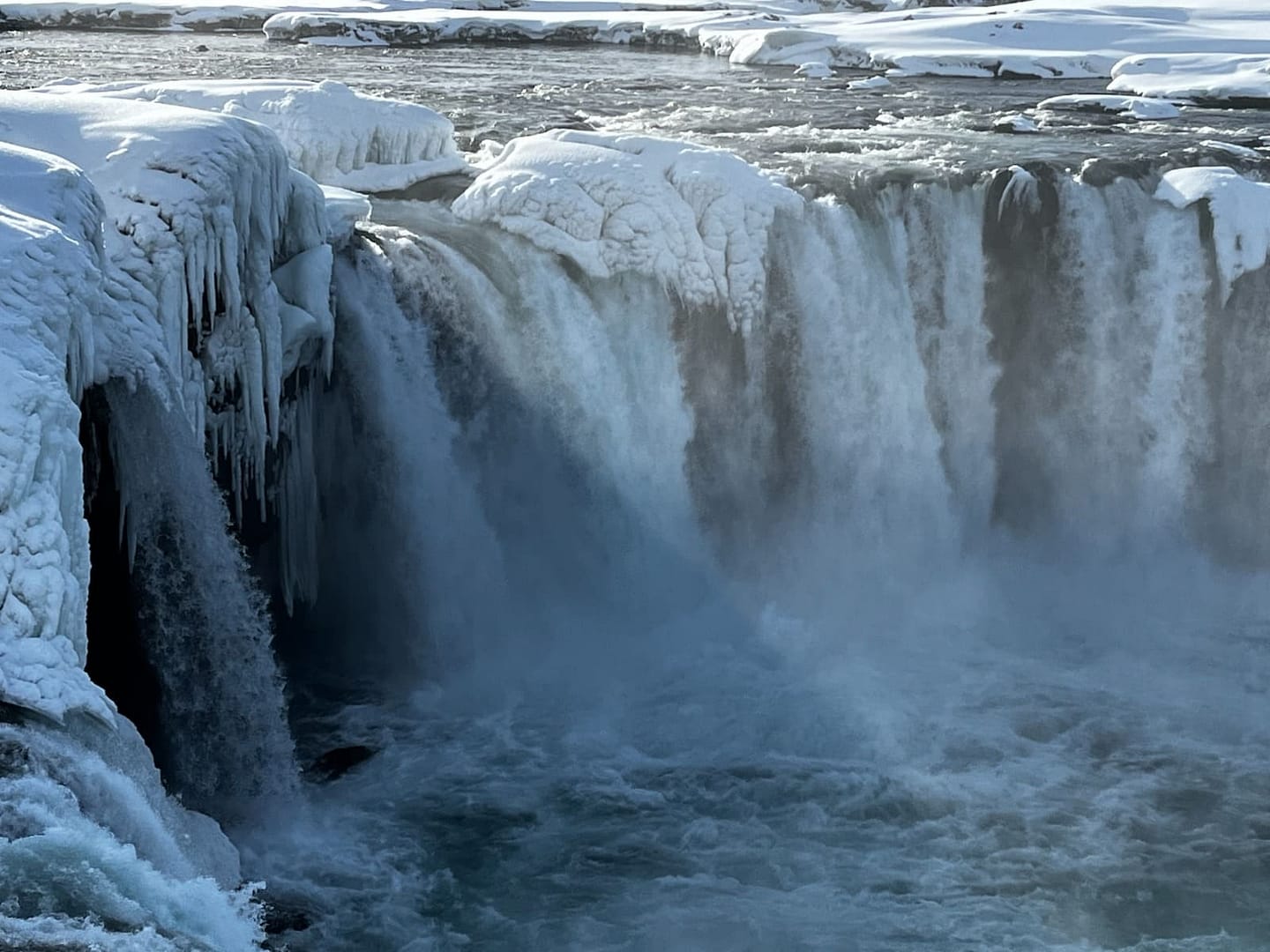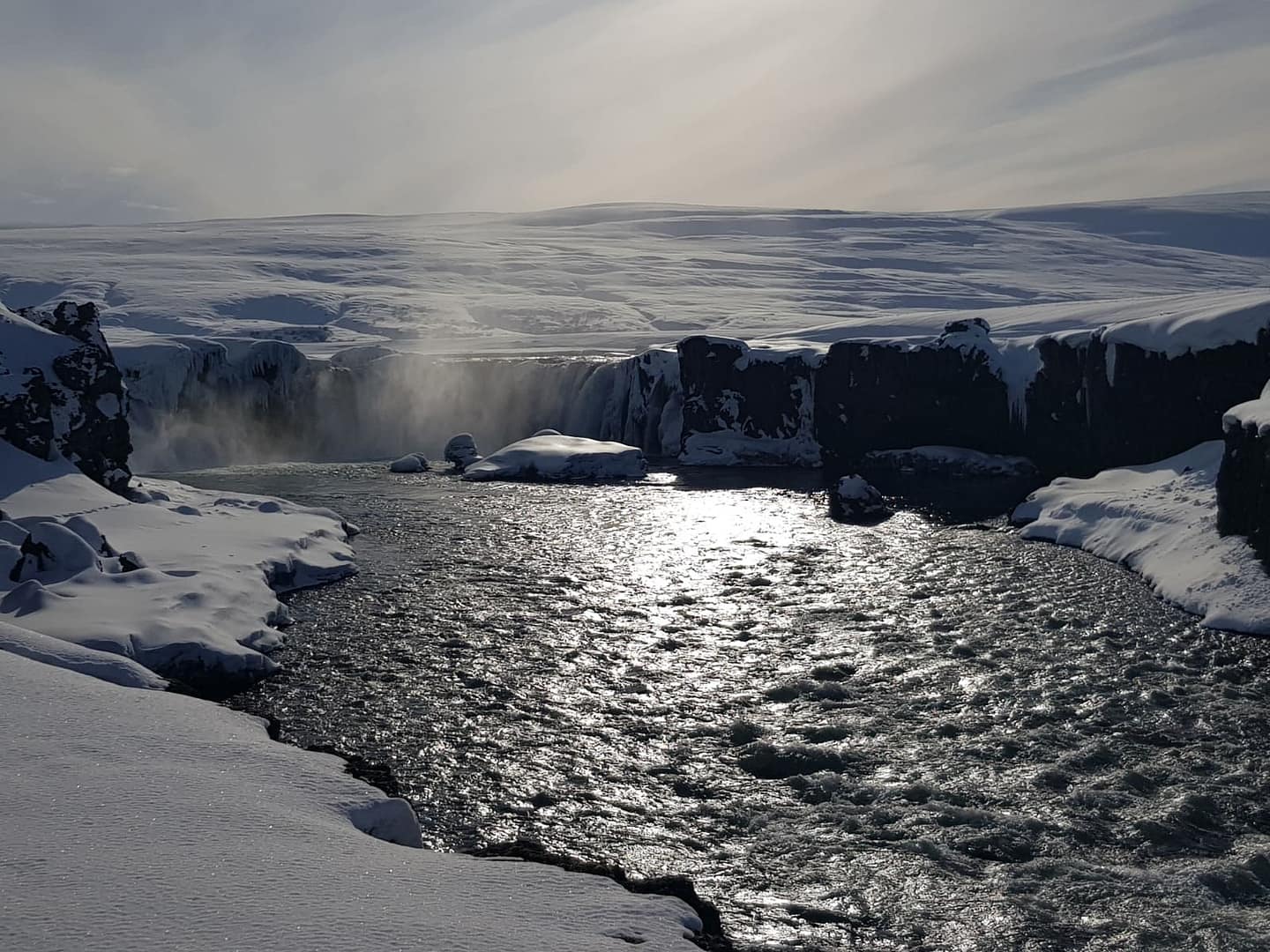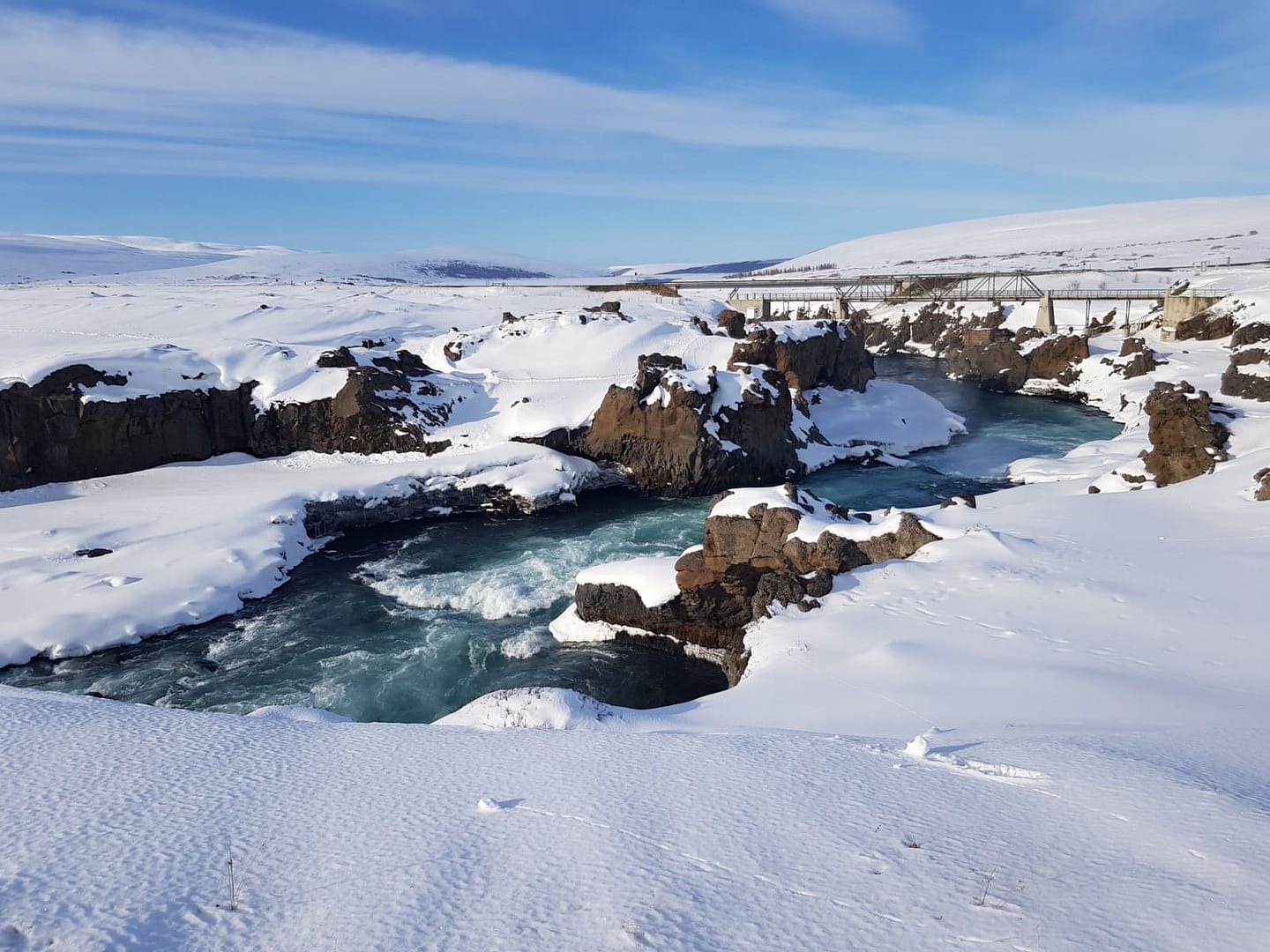Vom Parkplatz gehen wir über markierte Wege, relativ flach und einfach zu gehen, zum Wasserfall. Es gibt immer wieder Aussichtspunkte von denen man einen beeindruckenden Blick auf den Goðafoss hat. Der Wasserfall stürzt über einer Breite von 158 m, die von Felsen unterbrochen wird, etwa 11 m, in einem weiten Bogen in die Tiefe. Seine halbkreisförmige Kante verleiht ihm eine majestätische Erscheinung, besonders wenn das Wasser in die Tiefe stürzt und dabei Regenbögen im feinen Sprühnebel entstehen. Der Fluss Skjálfandafljót, der den Wasserfall speist, ist einer der größten Flüsse Islands.