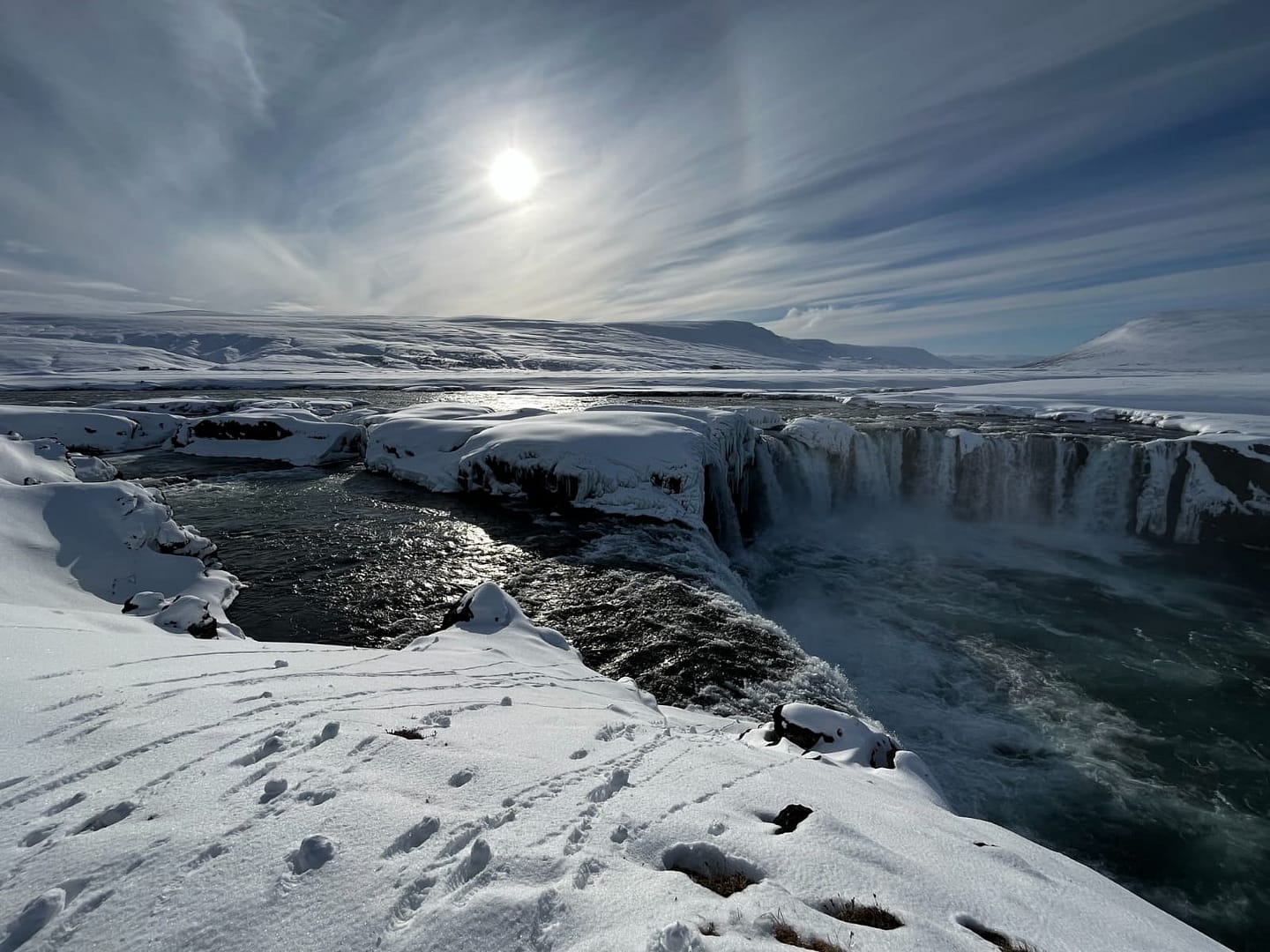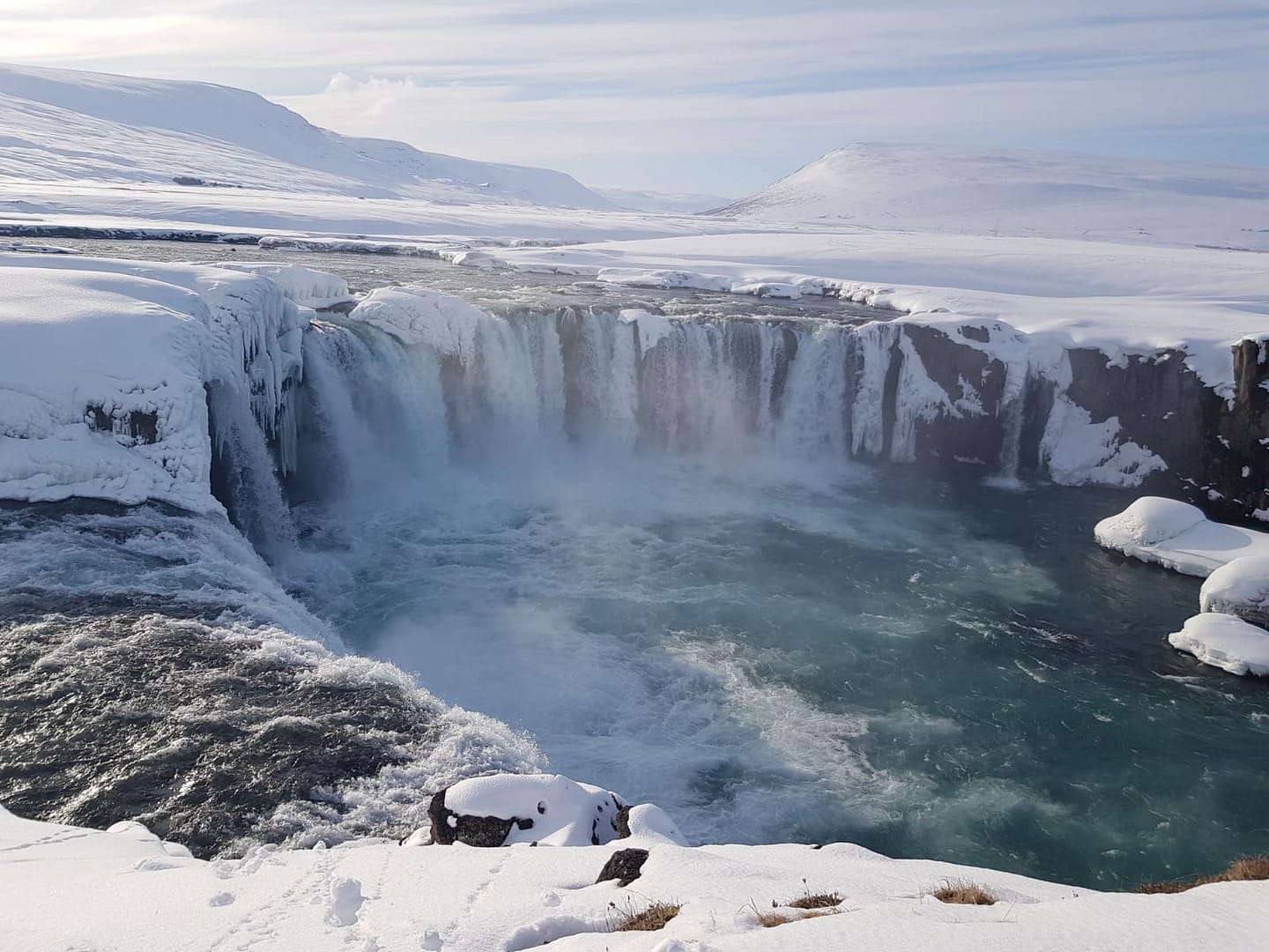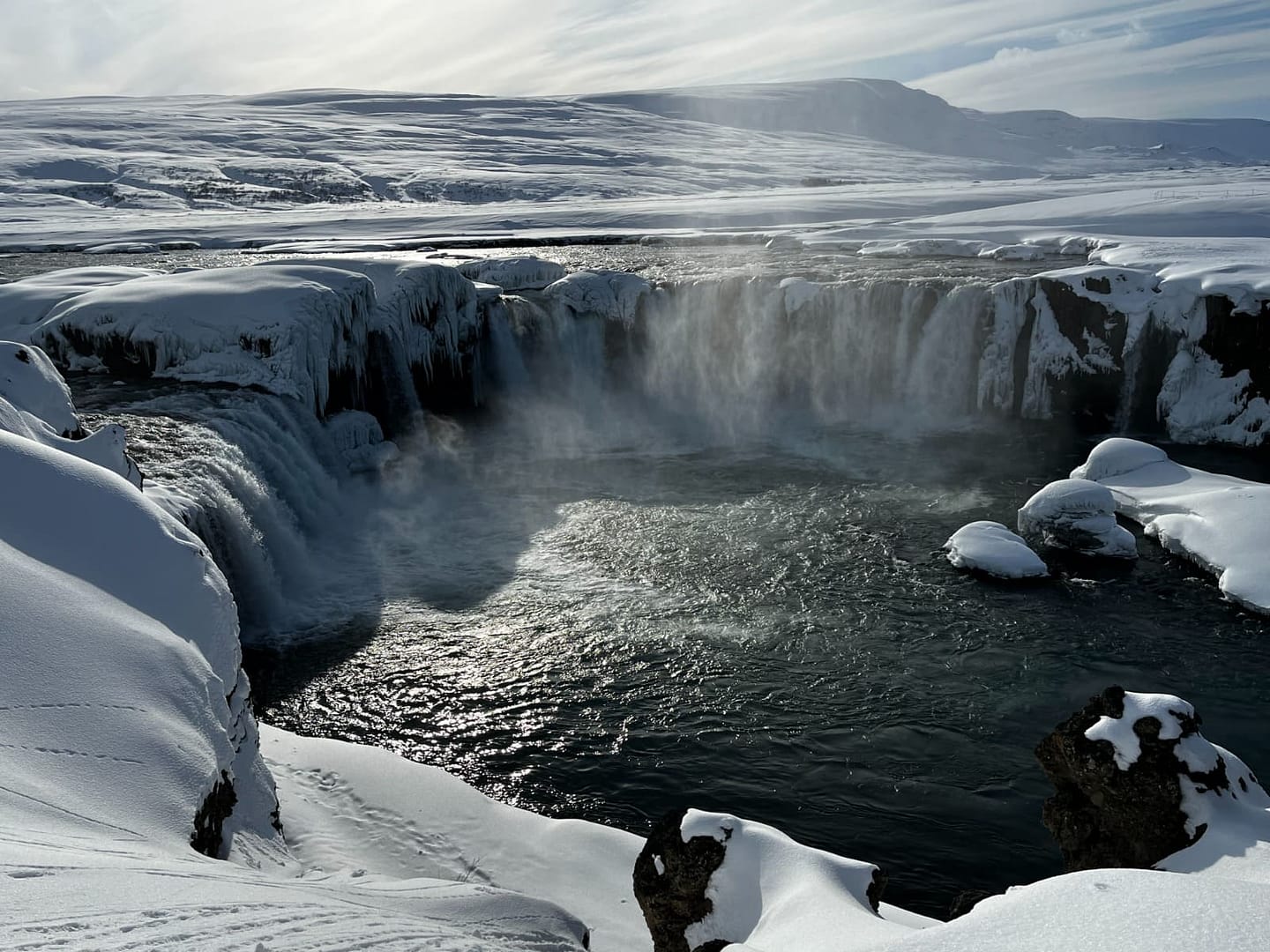 Vom Parkplatz gehen wir über markierte Wege, relativ flach und einfach zu gehen, zum Wasserfall. Es gibt immer wieder Aussichtspunkte von denen man einen beeindruckenden Blick auf den Goðafoss hat. Der Wasserfall stürzt über einer Breite von 158 m, die von Felsen unterbrochen wird, etwa 11 m, in einem weiten Bogen in die Tiefe. Seine halbkreisförmige Kante verleiht ihm eine majestätische Erscheinung, besonders wenn das Wasser in die Tiefe stürzt und dabei Regenbögen im feinen Sprühnebel entstehen. Der Fluss Skjálfandafljót, der den Wasserfall speist, ist einer der größten Flüsse Islands.