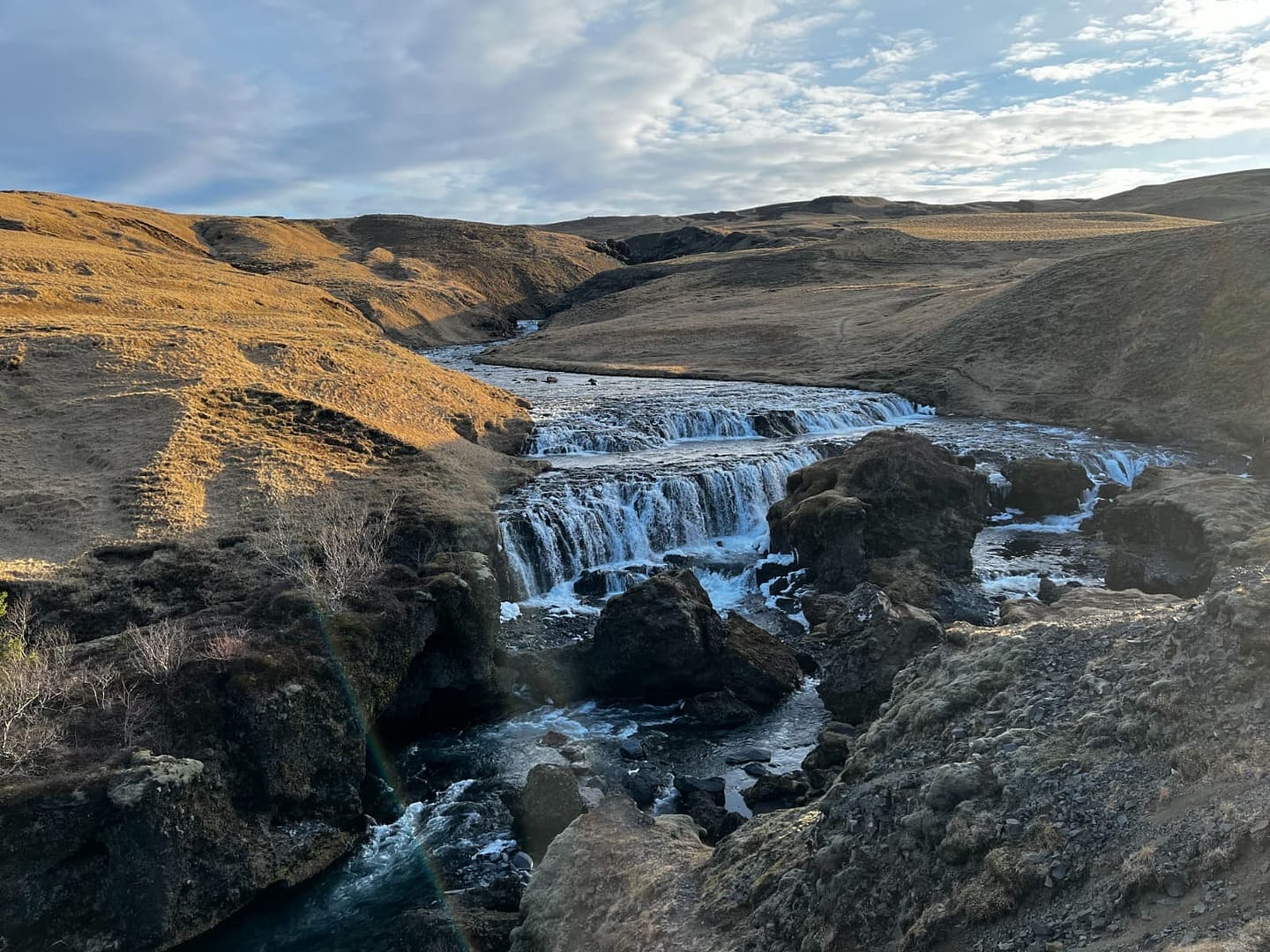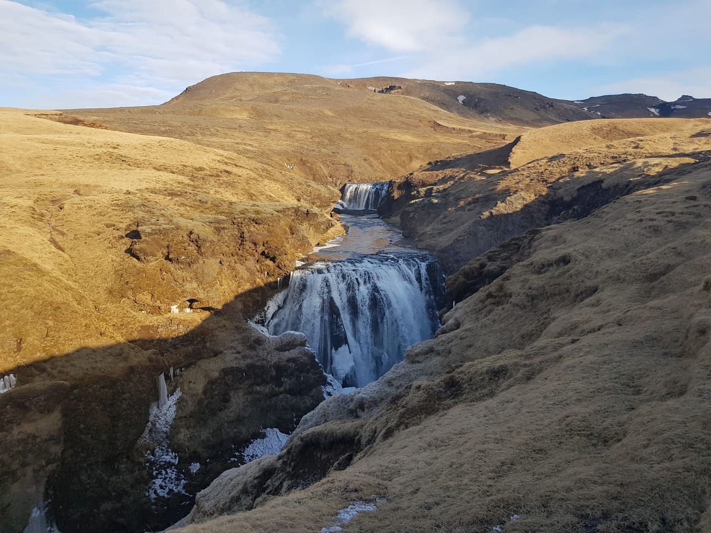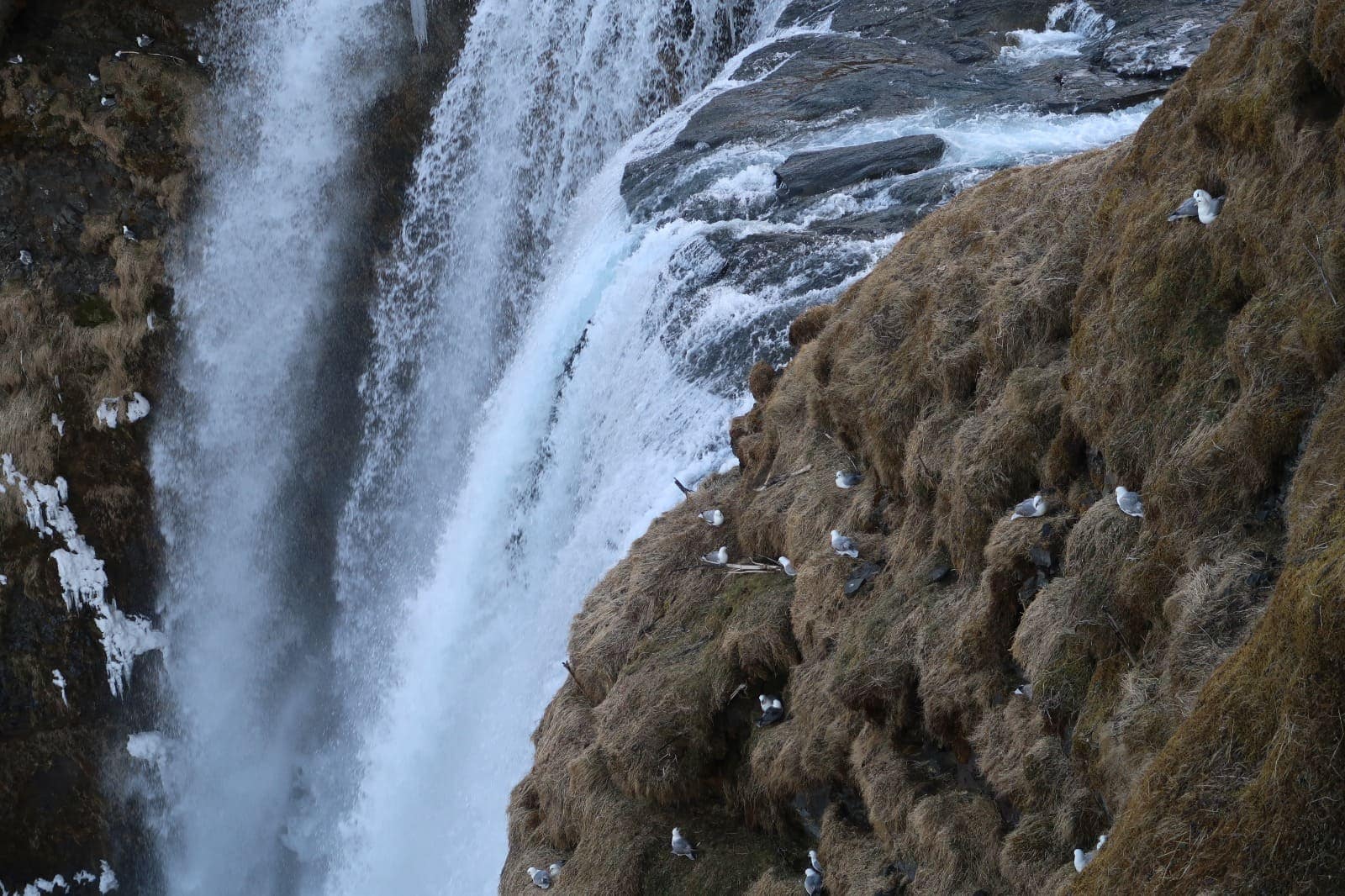 Der bekannteste ist wohl der Skógafoss, direkt am Anfang, den man noch vom Parkplatz aus bestaunen kann. Auf einer Höhe von 60 Metern und eine Breite von 25 Metern rauscht das Wasser herunter. Rund um den Wasserfall finden viele Möwen ihr Zuhause und scheinen sich im feinen Sprühnebel ausgesprochen wohl zu fühlen. Über eine Treppe mit über hundert Stufen gelangt man zu einer Aussichtsplattform, von der aus man einen atemberaubenden Blick bis hin zum Meer genießen kann.