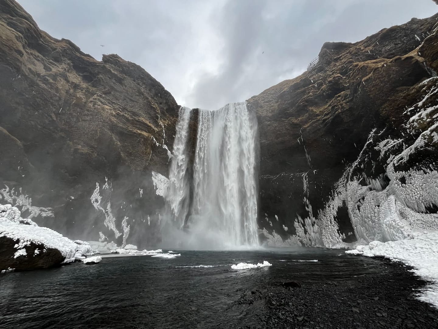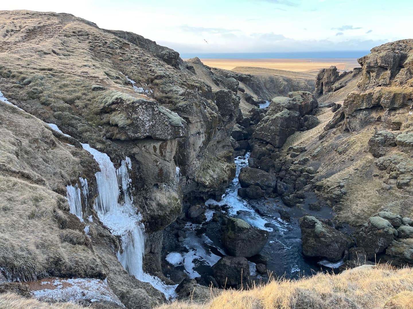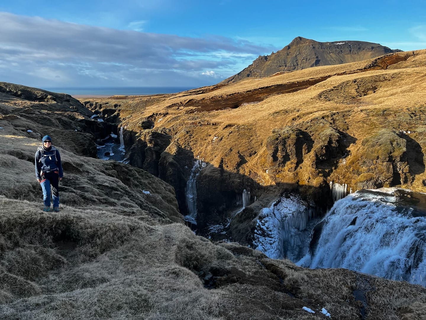 Der bekannteste ist wohl der Skógafoss, direkt am Anfang, den man noch vom Parkplatz aus bestaunen kann. Auf einer Höhe von 60 Metern und eine Breite von 25 Metern rauscht das Wasser herunter. Rund um den Wasserfall finden viele Möwen ihr Zuhause und scheinen sich im feinen Sprühnebel ausgesprochen wohl zu fühlen. Über eine Treppe mit über hundert Stufen gelangt man zu einer Aussichtsplattform, von der aus man einen atemberaubenden Blick bis hin zum Meer genießen kann.