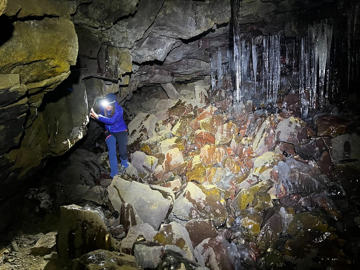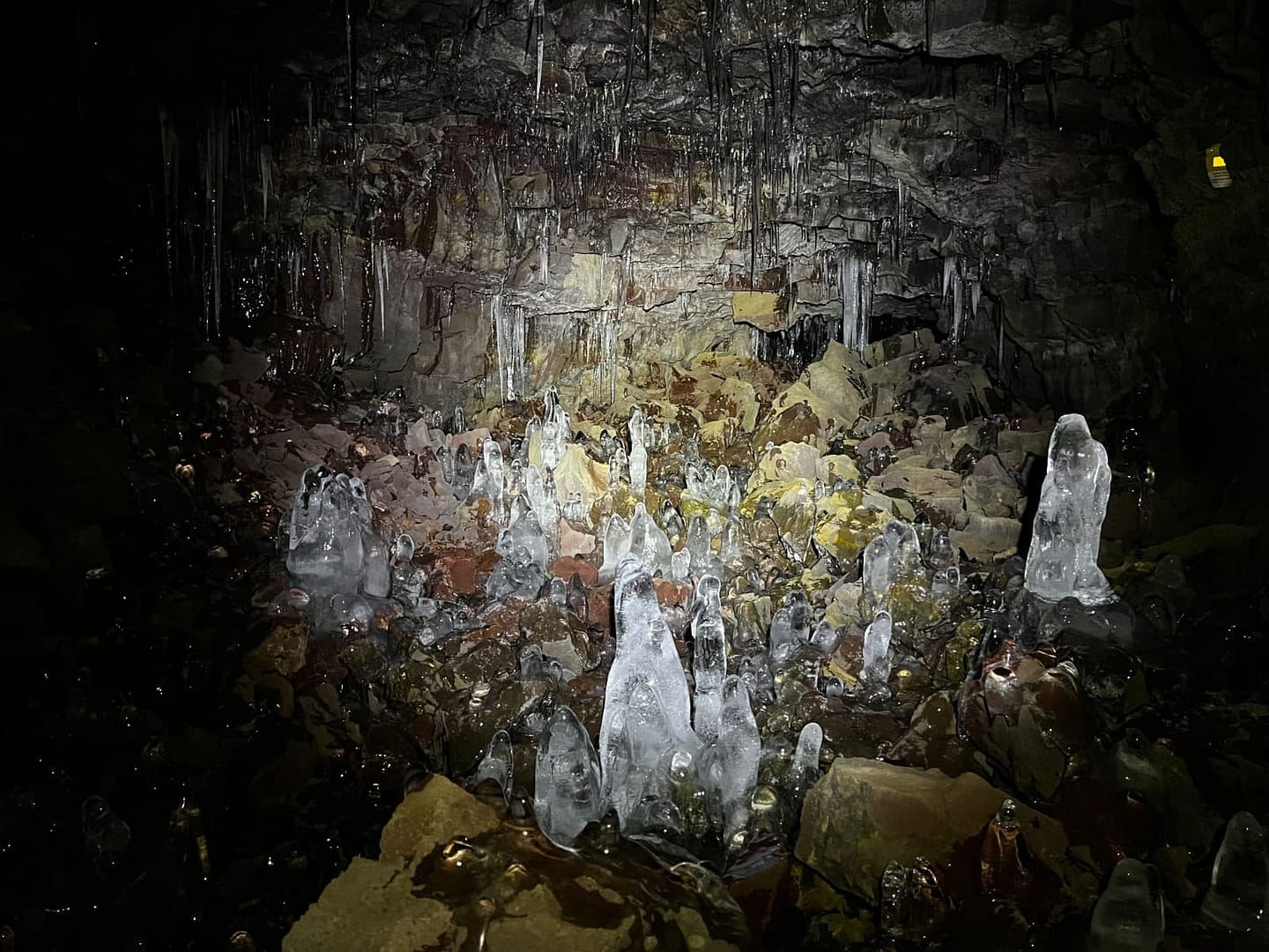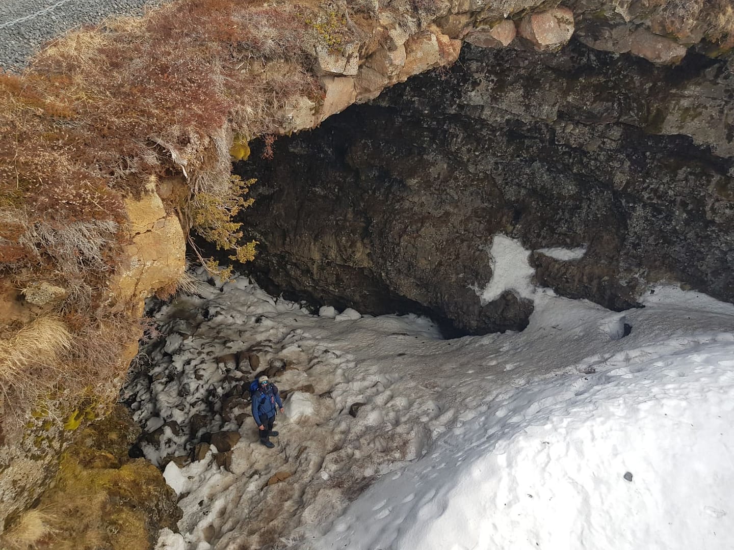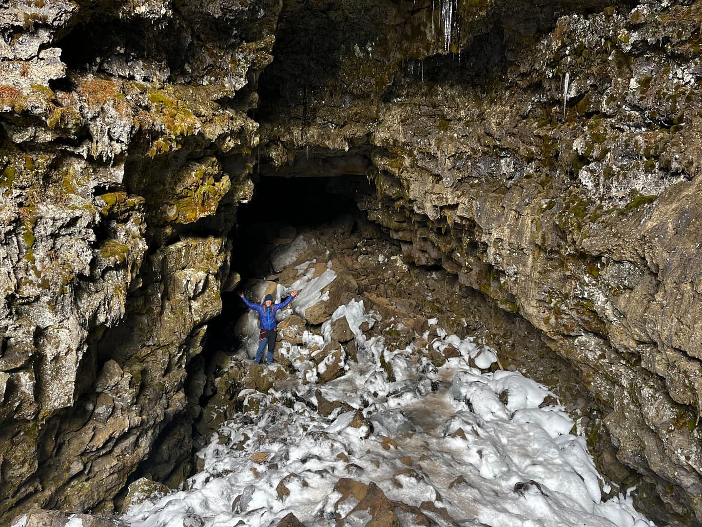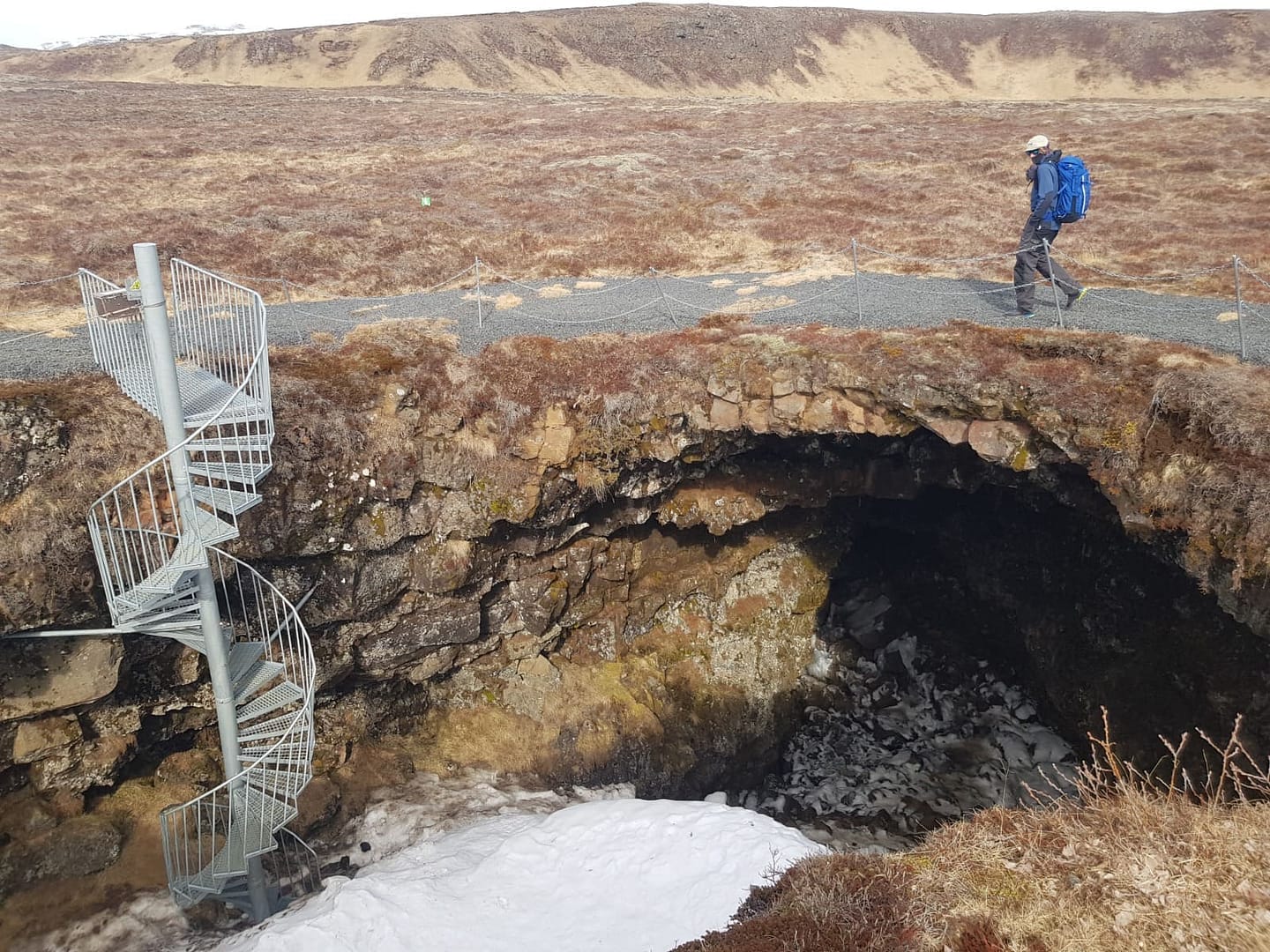 Vom Parkplatz aus sind es etwa 400 Meter bis zum Eingang der Lavahöhle. Über eine nicht mehr ganz so gut erhaltene Wendeltreppe steigt man in die Tiefe hinab. Zuerst erkundeten wir den Tunnel nach Norden. Es gibt keinen ‚künstlichen‘ Pfad – in den meisten Abschnitten muss man über Felsen bzw. bei uns eher Eis klettern.