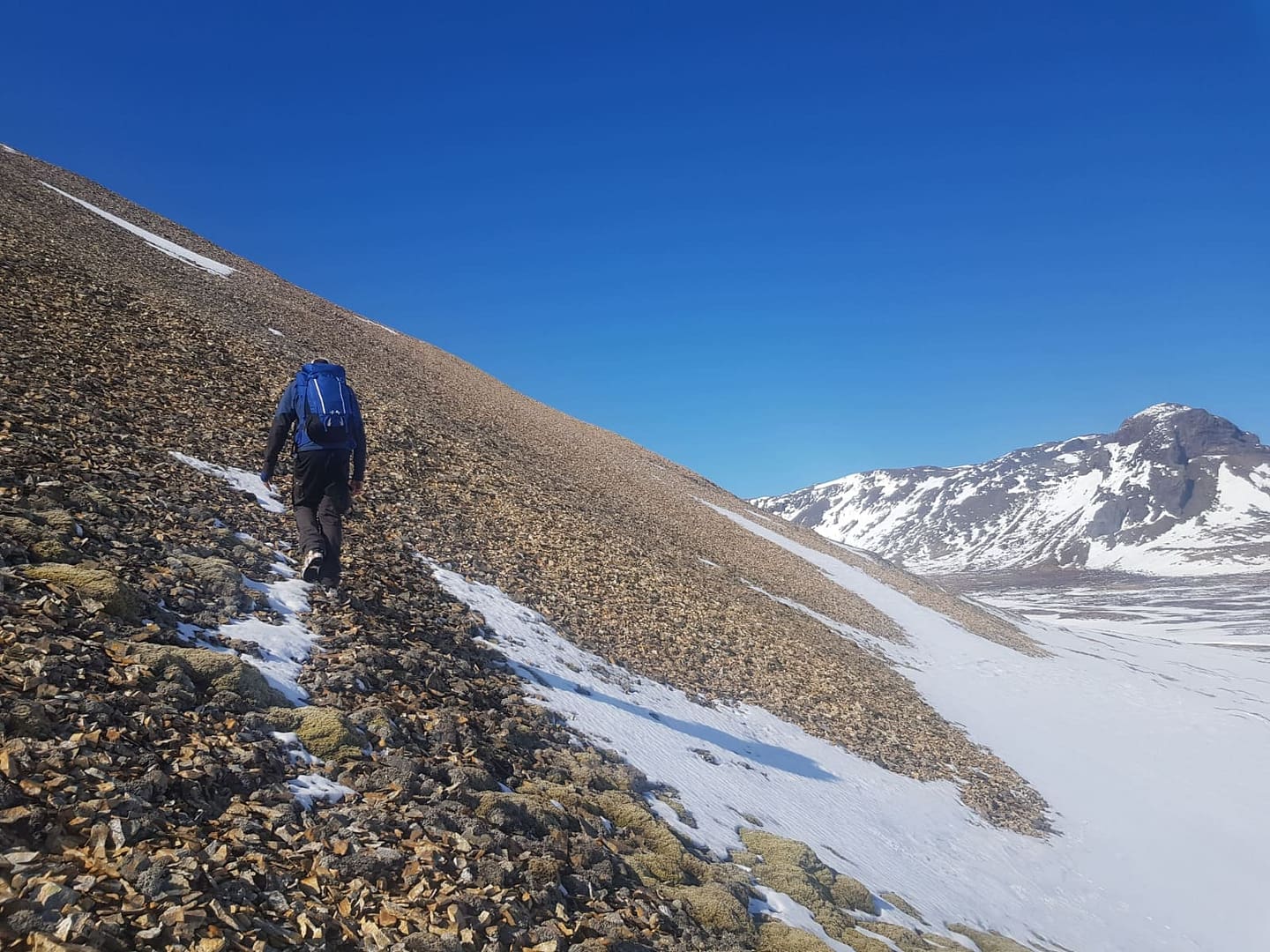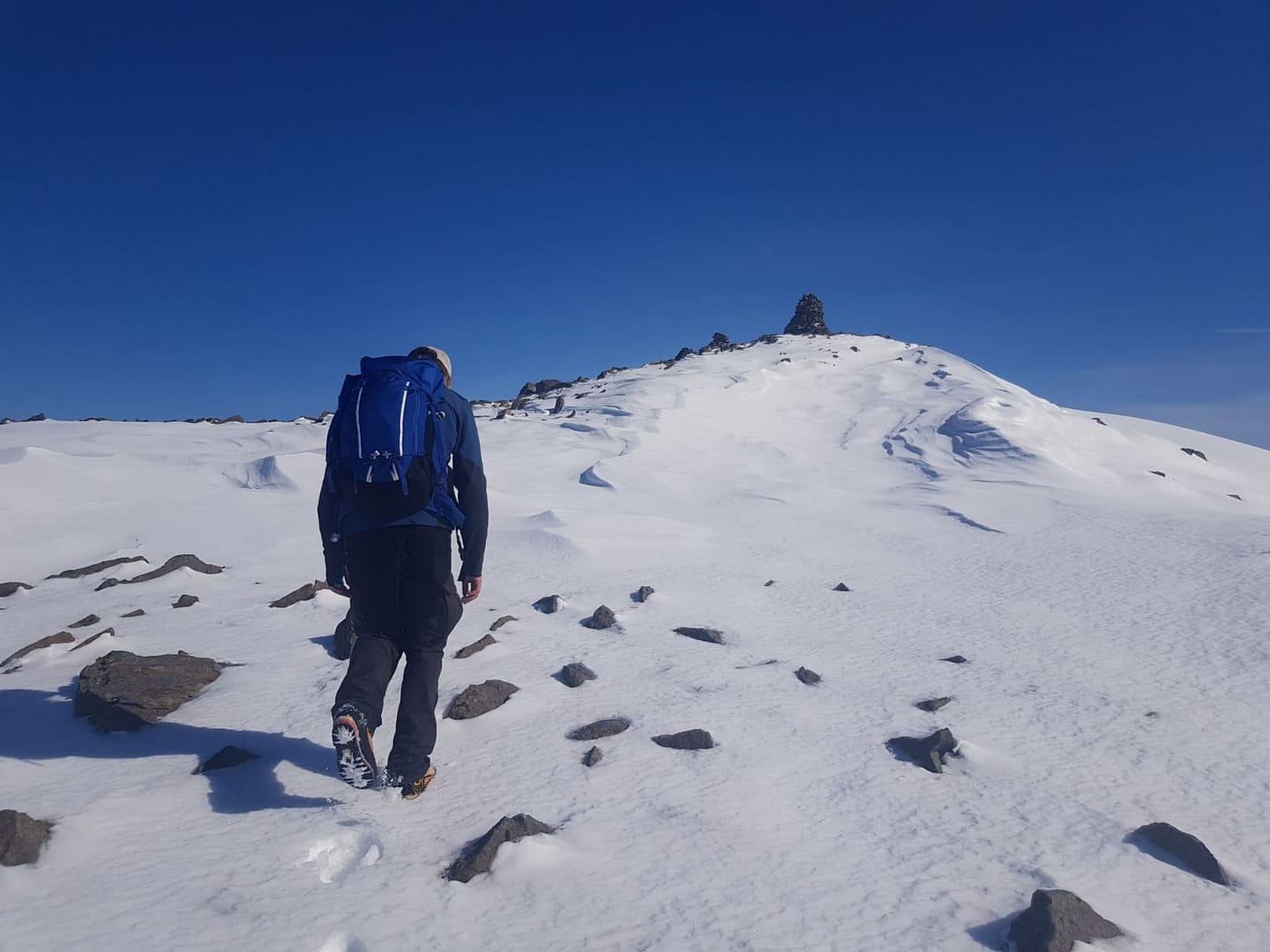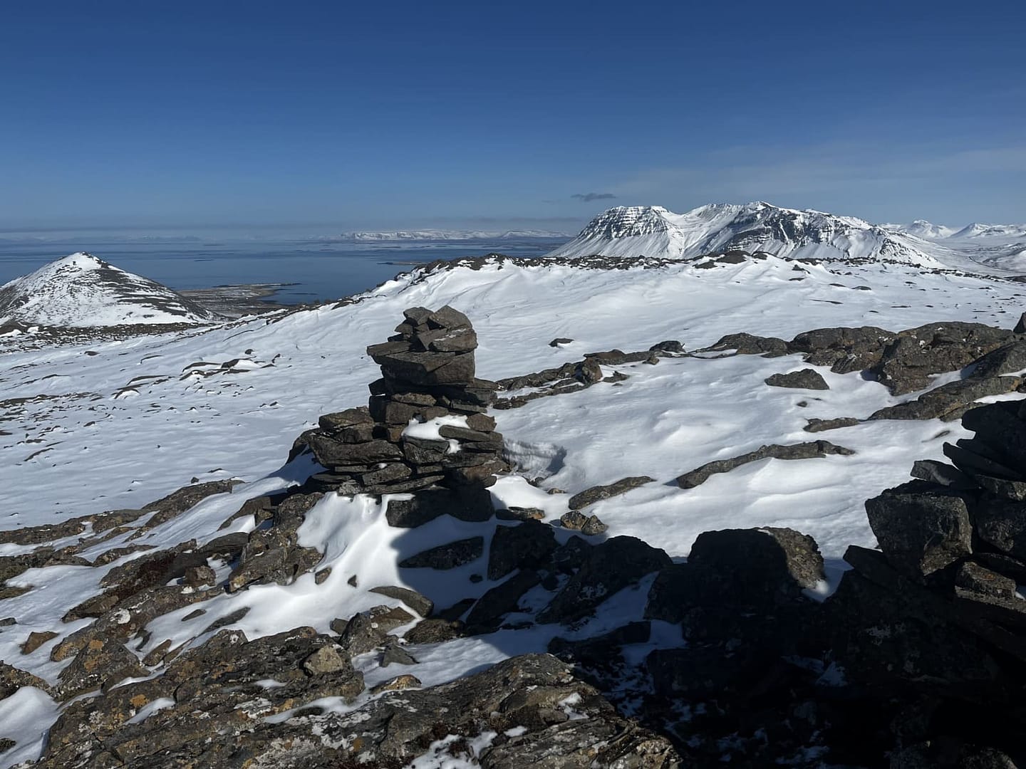 Schon während des Aufstiegs eröffnet sich uns ein atemberaubendes Panorama, und wir kosten die Stille und das großartige Wetter in vollen Zügen aus. Für etwa einen Kilometer setzen wir unseren Weg in südwestlicher Richtung in sanfter Steigung fort. Dann, auf 110 Höhenmetern, geht es über einen steilen Hang in südöstlicher Richtung weiter, bis wir schließlich den Aussichtspunkt erreichen, der durch einen Steinmann markiert ist.