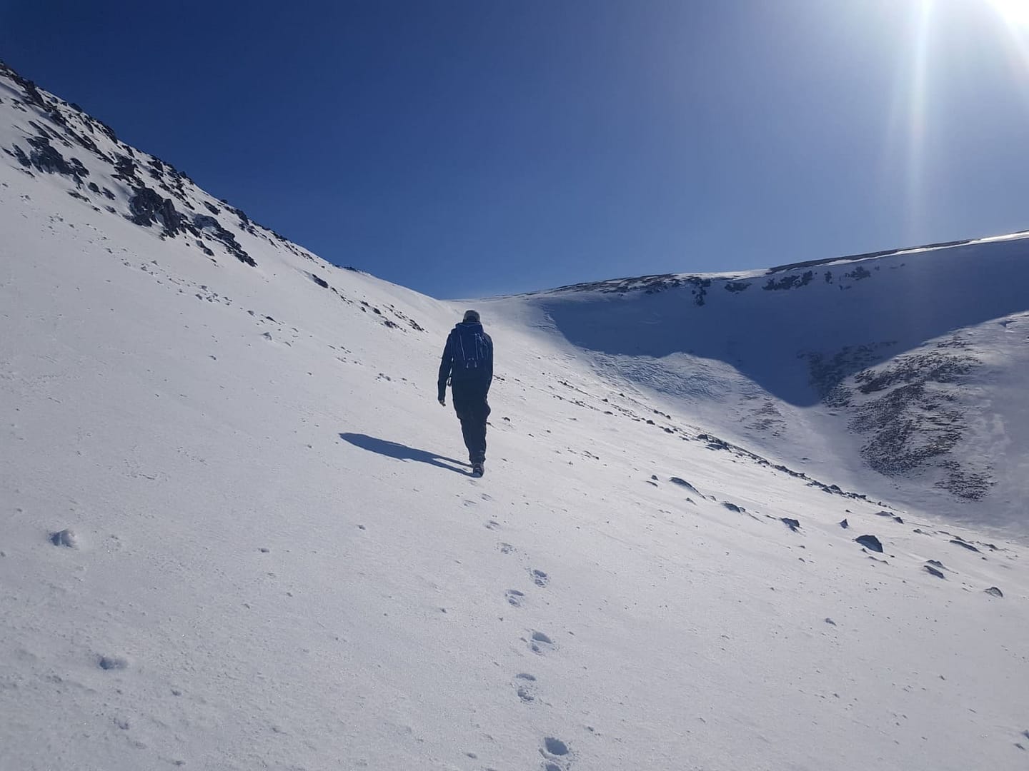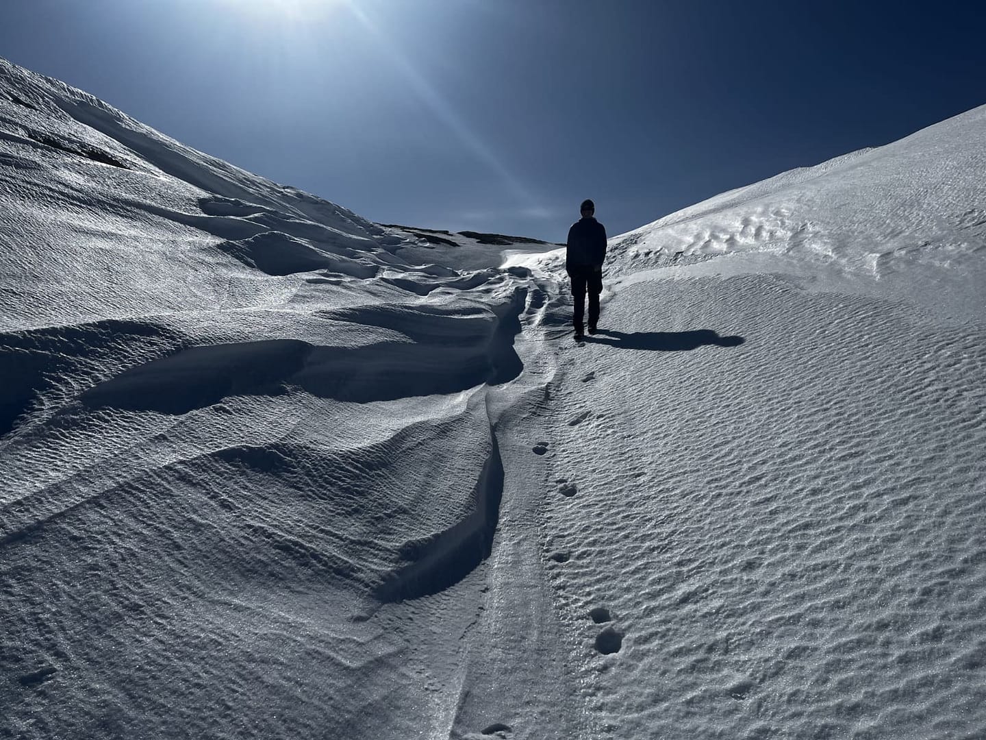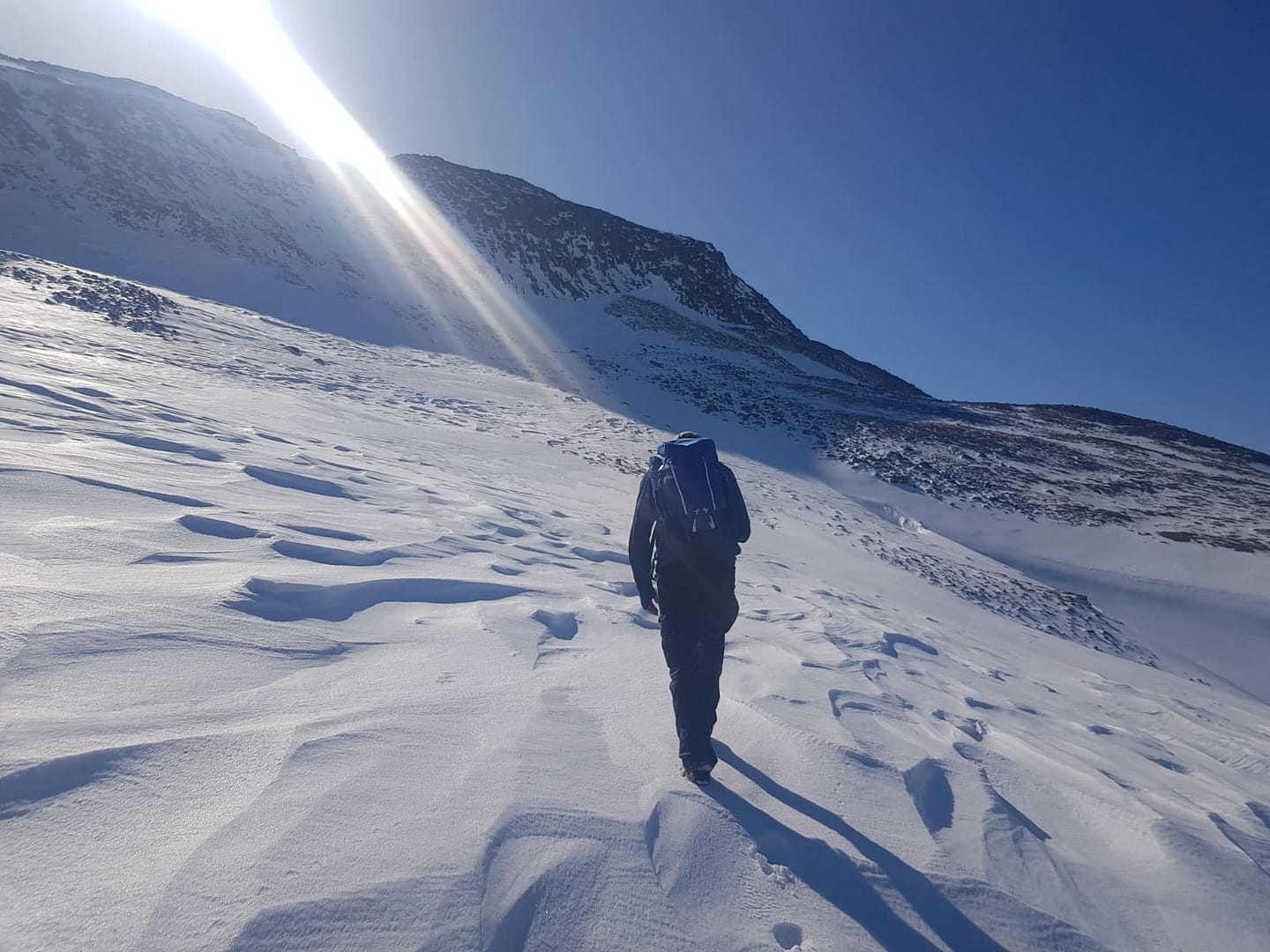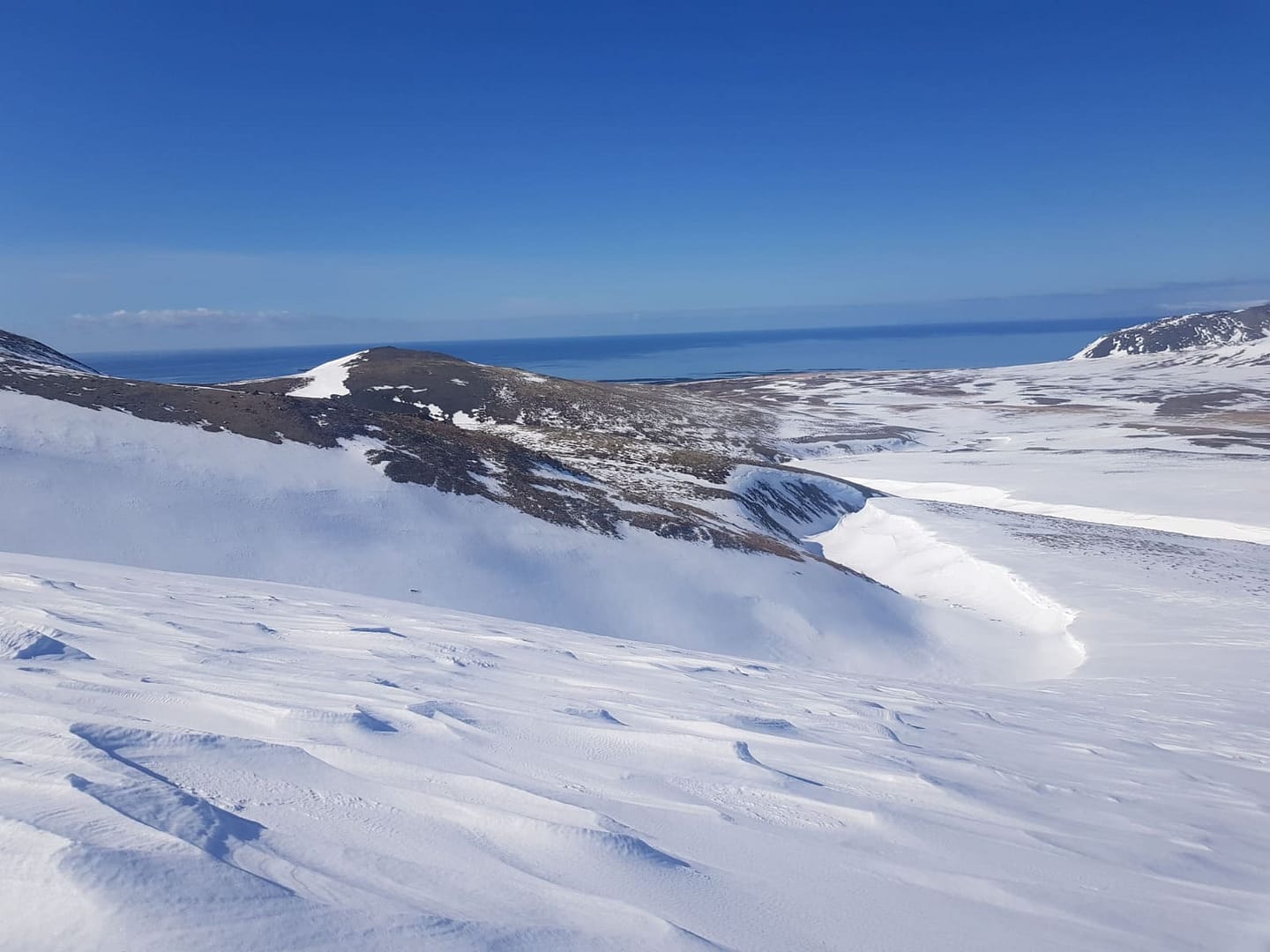 Schon während des Aufstiegs eröffnet sich uns ein atemberaubendes Panorama, und wir kosten die Stille und das großartige Wetter in vollen Zügen aus. Für etwa einen Kilometer setzen wir unseren Weg in südwestlicher Richtung in sanfter Steigung fort. Dann, auf 110 Höhenmetern, geht es über einen steilen Hang in südöstlicher Richtung weiter, bis wir schließlich den Aussichtspunkt erreichen, der durch einen Steinmann markiert ist.