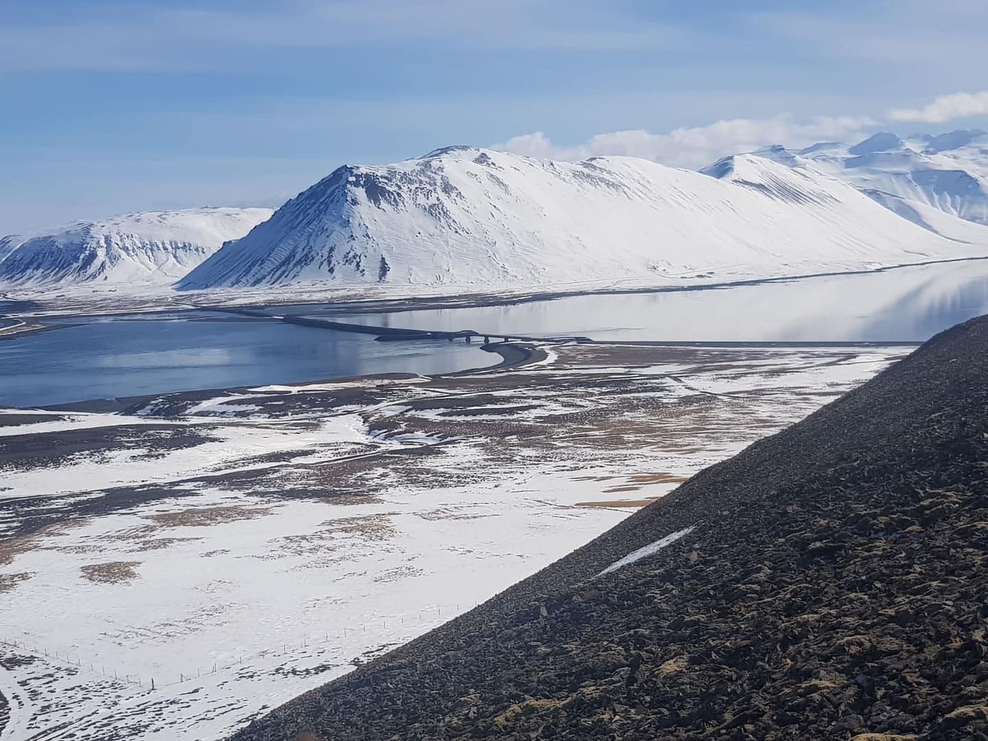 Von der Parkbucht aus führt unser Weg westwärts, durch das Gelände hin zum Berg. Dabei überqueren wir den Hjarðarbólsá Bach und stoßen kurz darauf auf einen Feldweg. Etwa 700 Meter weiter, nehmen wir Anlauf über einen Geröllhaufen von extremer Lockerheit – eine Herausforderung, die jedes Trittgeräusch wie das Zerbrechen von Glas erscheinen lässt. Glücklicherweise ist dieser Abschnitt des Aufstiegs schnell überwunden, und fortan wird der Boden wieder solider.