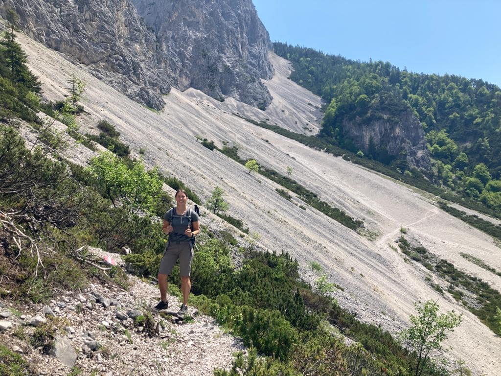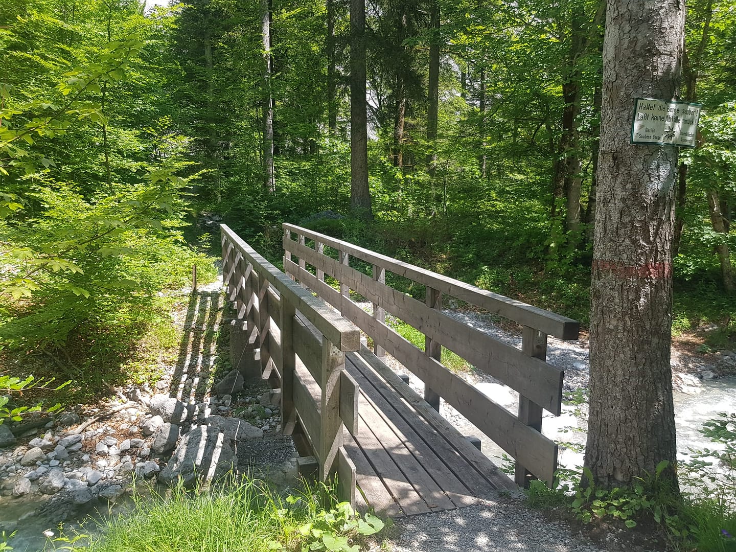 Vom Parkplatz kann man entweder über die Fahrstraße oder wie wir über einen schmalen Pfad, dem Fluchtsteig, welcher ein Stück mit einem Stahlseil gesichert ist aufsteigen. Nach ca. 2,8 km kommen wir zur 2.ten Ladhütte, ein Knotenpunkt, wo viele Touren angeschrieben sind, so auch der Klettersteig. Es geht rechts über den Halltalbach und direkt kurz danach nach links durch ein ausgetrocknetes Bachbett und auf dem Steig hinauf zum Wandfuß mit dem Einstieg. Einer der tollsten Momente war, dass eine Gams beim Einstieg unter uns „geklettert“ ist. 🙂