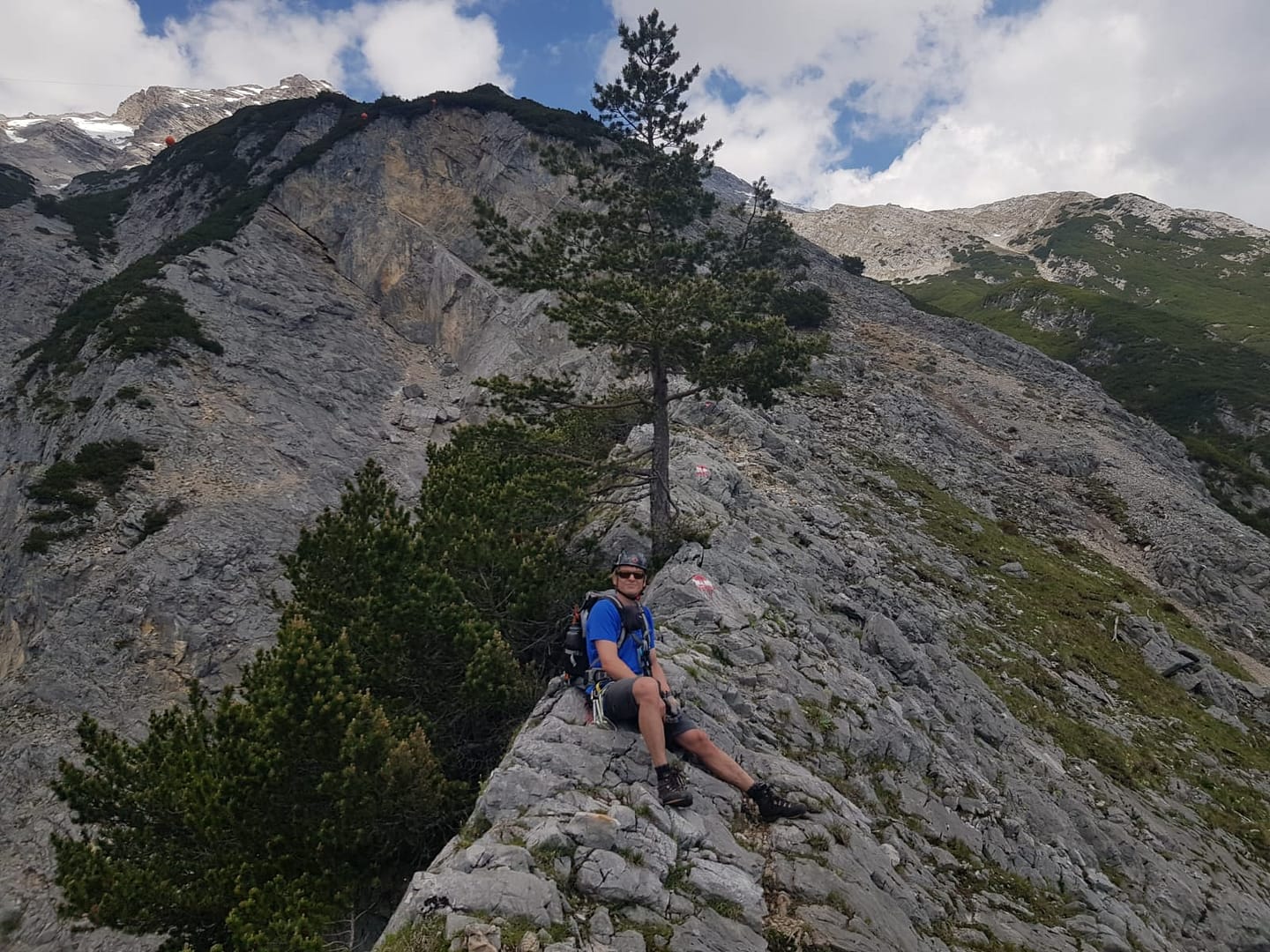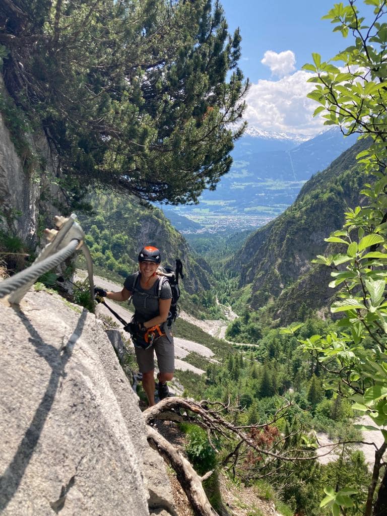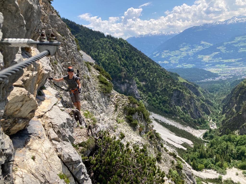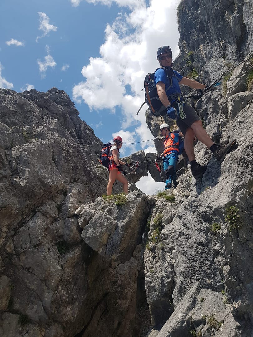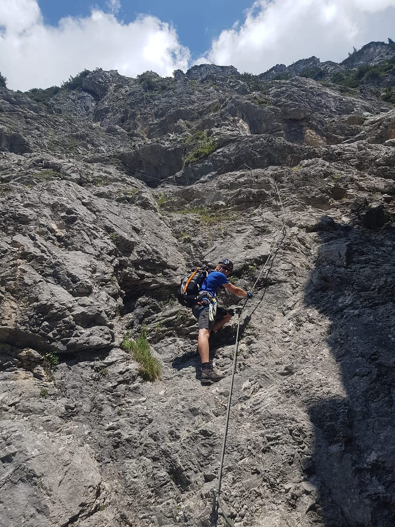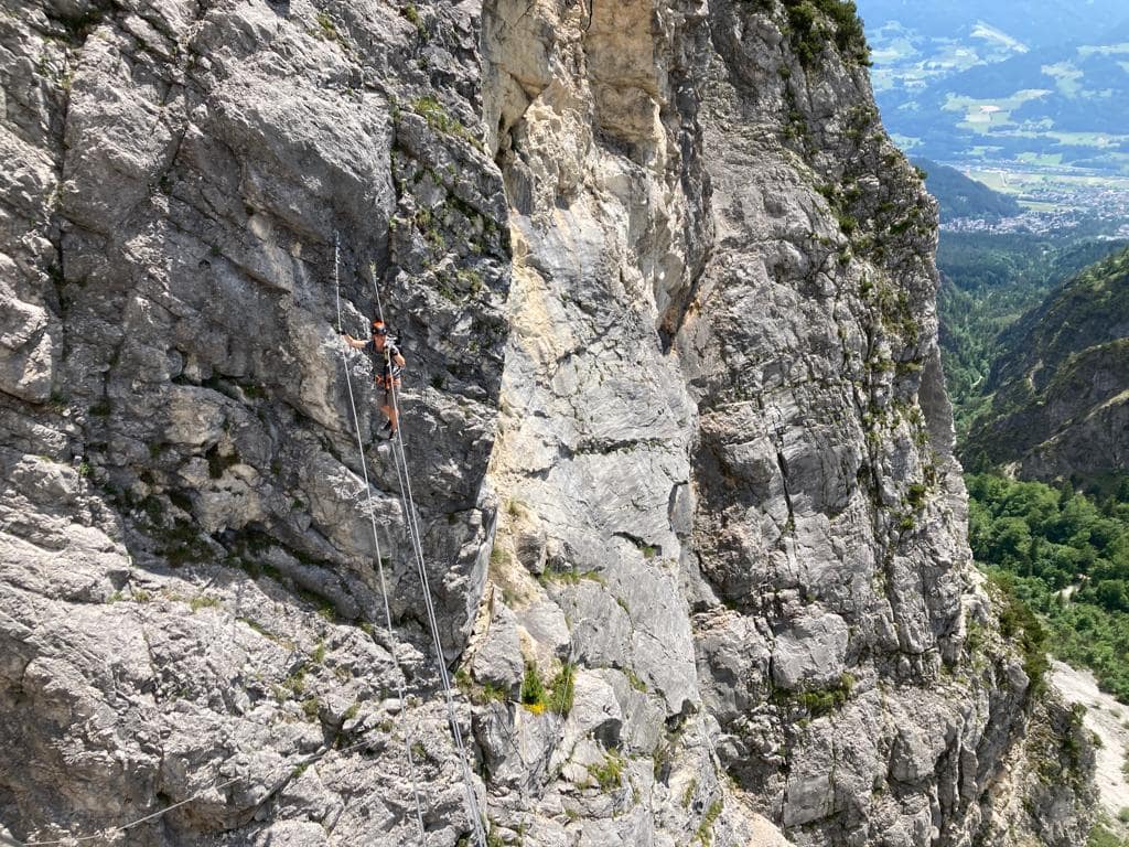 Der Fels scheint nicht immer ganz kompakt zu sein, aber wenn man am nächsten Tag die Bettelwurfüberschreitung macht, kann man sich nicht beschweren, dort ist es wirklich sehr brüchig. Es gibt eine Seilbrücke, die man aber auch untenrum gesichert umgehen kann. Ich persönlich mag Seilbrücken, aber diese fand ich komisch angelegt, so dass das linke, obere Seil ein bisschen im Weg hing.