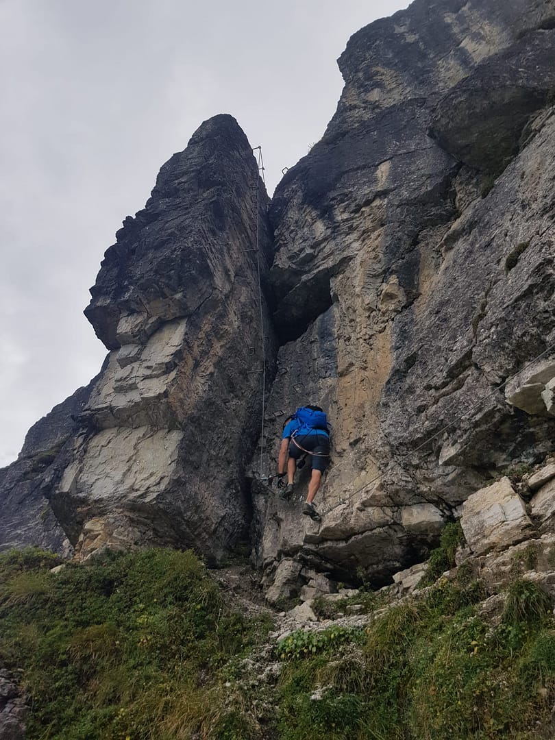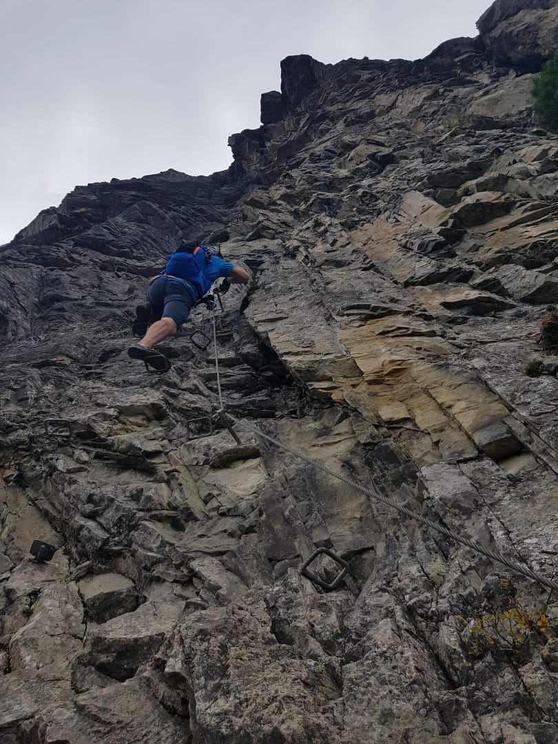 Was ich aber mitgeben möchte: Ich fand den Klettersteig nicht wirklich schön, teilweise sogar gruslig. Viele Stahlklemmen und Sicherungen waren stark verbogen, Überbleibsel von rausgerissenen Stahlklemmen sind noch sichbar und offenbar ist der Fels auch nicht so fest/stabil, denn hier und da sieht man frische Steinstürze. Die Aussicht vom Steig ist trotzdem zu genießen und lenkt einbissen vom Gruselfaktor ab.