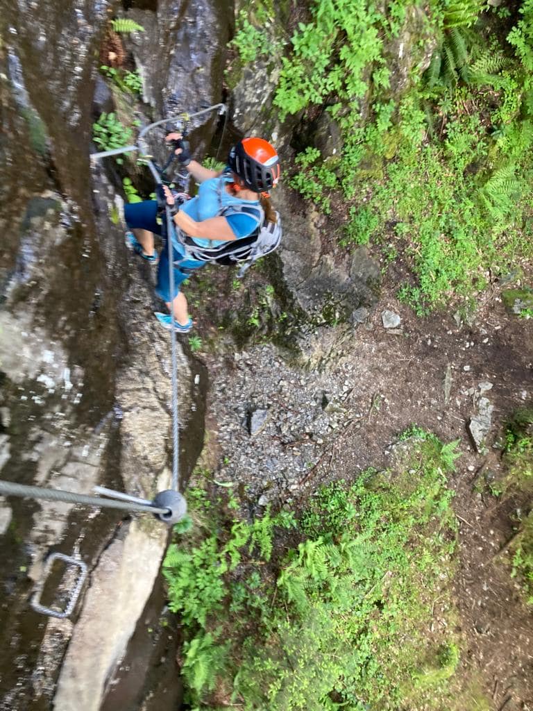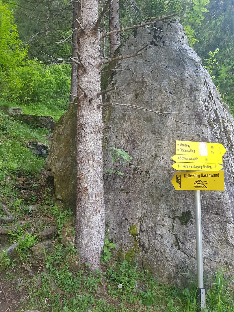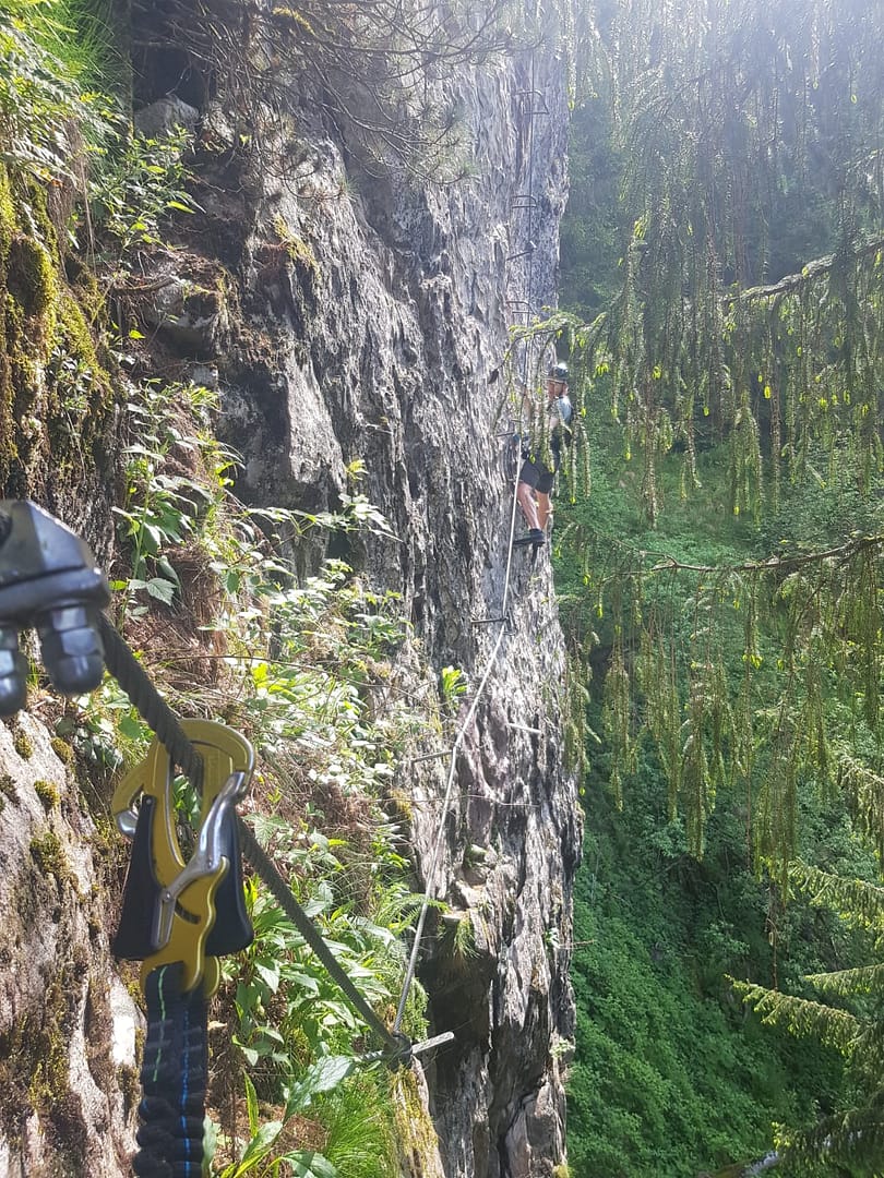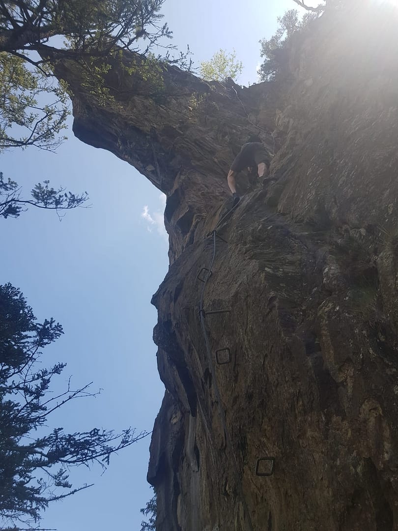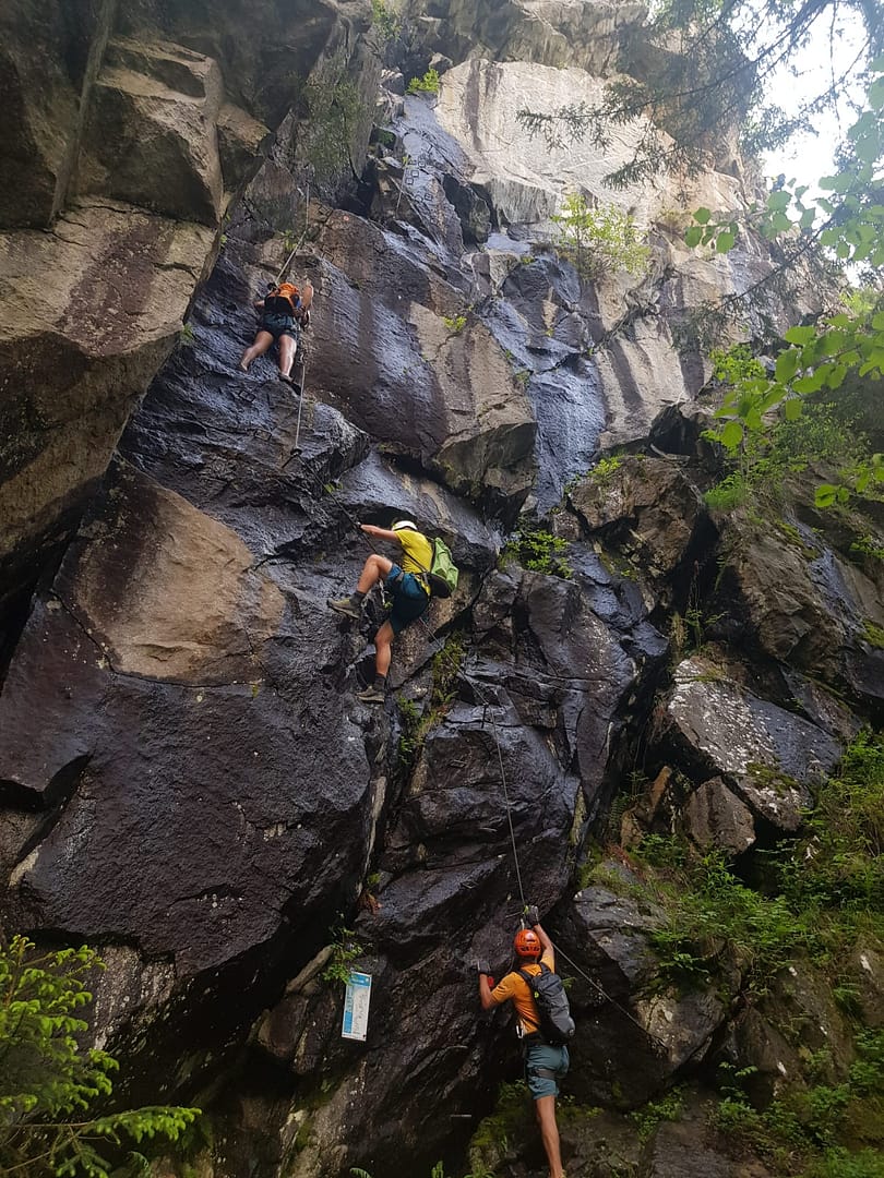 Vom Parkplatz erreicht man den sehr gut ausgeschilderten Klettersteig in weniger als in 10 Minuten. Im Wald steigt man direkt zu den schon sichtbaren Felsen rauf. Der Anfang hatte es schon in sich, es war sehr nass und moosig, so dass der erste Abschnitt vom Steig sehr rutschig war. Danach kam zum Glück eine Querung die leichter war, wo wir unsere nassen Sohlen am Fels trockenreiben konnten.