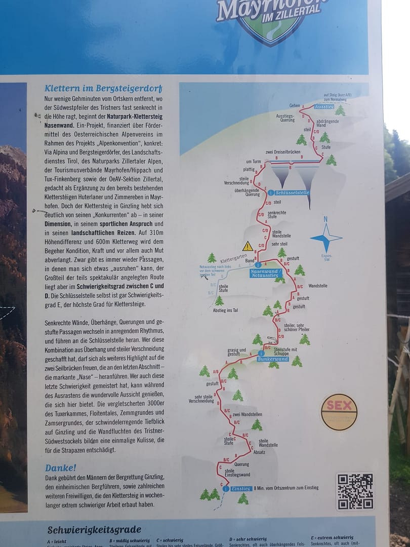Nach den Floitentritten hat man die Möglichkeit über einen Notausstieg den Klettersteig zu verlassen, wenn einem die Kraft ausgegangen ist. Denn jetzt beginnt der zweite schwierige Teil mit der Schlüsselstelle. Die Schlüsselstelle selbst ist mit E bewertet, der höchste Grad für Klettersteige, hier wurde aber noch eine eigens angelegte Alternative geschraubt, die diese Stelle umgeht. Kurz habe ich in Erwähnung gezogen diese zu nehmen, denn ich habe den Klettersteig schon in meinen Armen gemerkt. Nach der Schlüsselstelle, eine Kombination aus Überhang und steiler Verschneidung, kann man sich auf das nächste Highlight freuen, die zwei Seilbrücken.