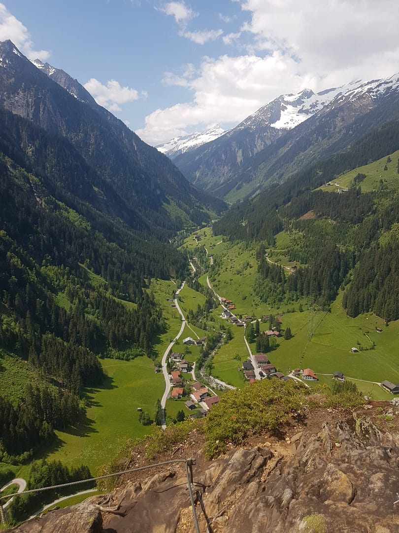 Oben angekommen hat man einen fantastischen Ausblick auf die vergletscherten 3000er des Tuxerkammes, Zemmgrundes und Zamsergrundes. Auch der Blick ins Tal ist beeindruckend und birgt eine tolle Kulisse. Der Abstieg erfolgt rechtshaltend auf einen gut ausgetretenen Pfad, welcher teilweise noch versichert ist (A/B) bis zum Normalweg und runter nach Ginzling.