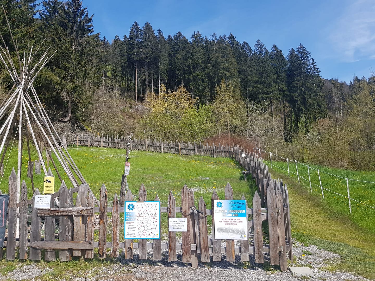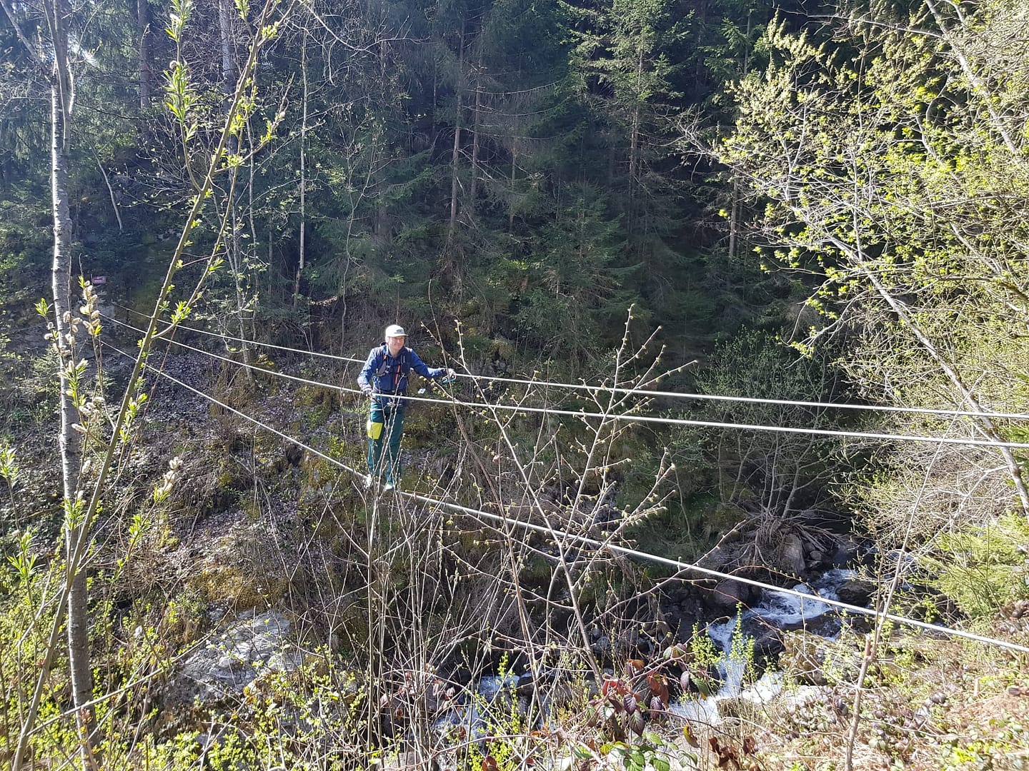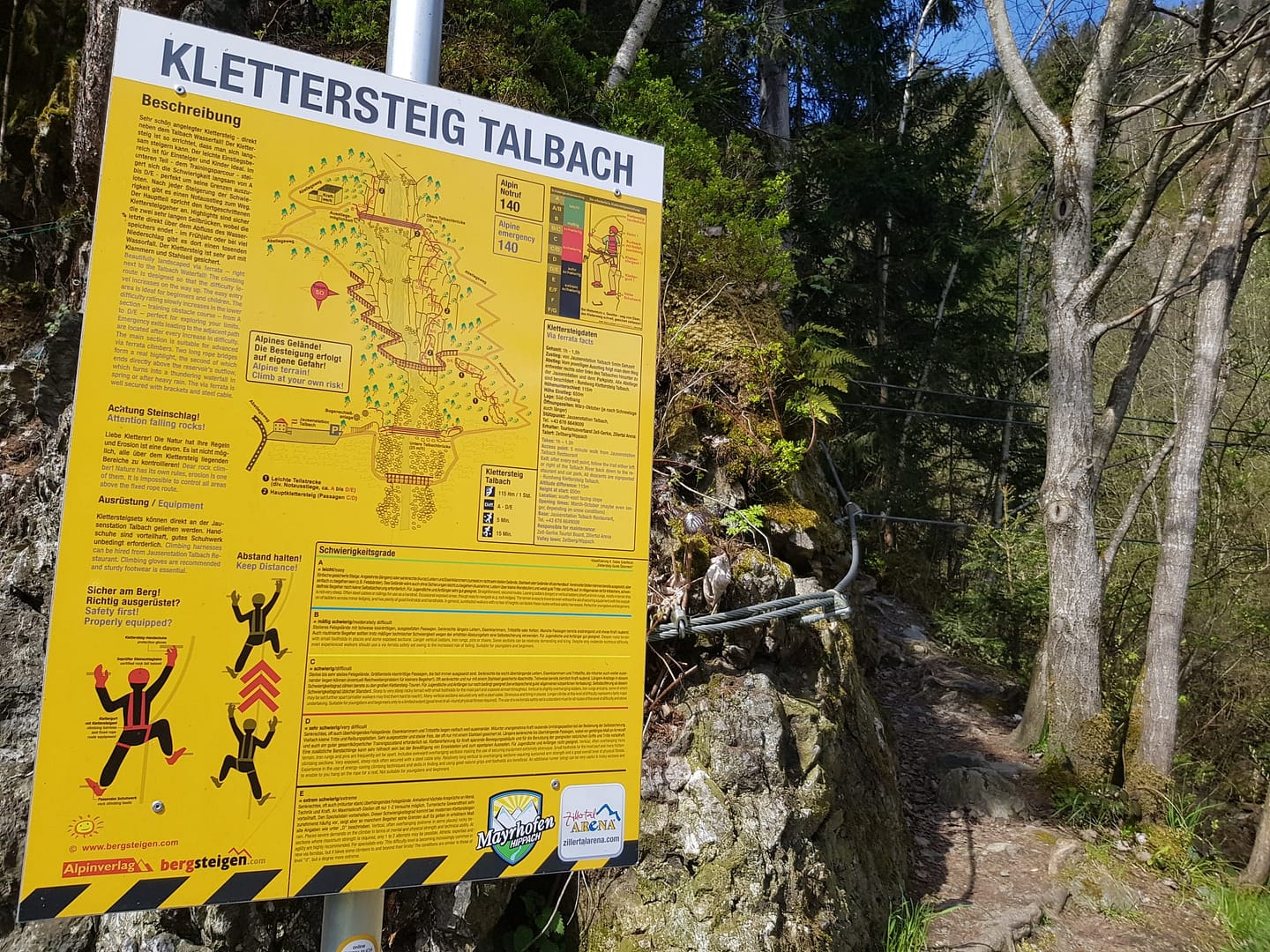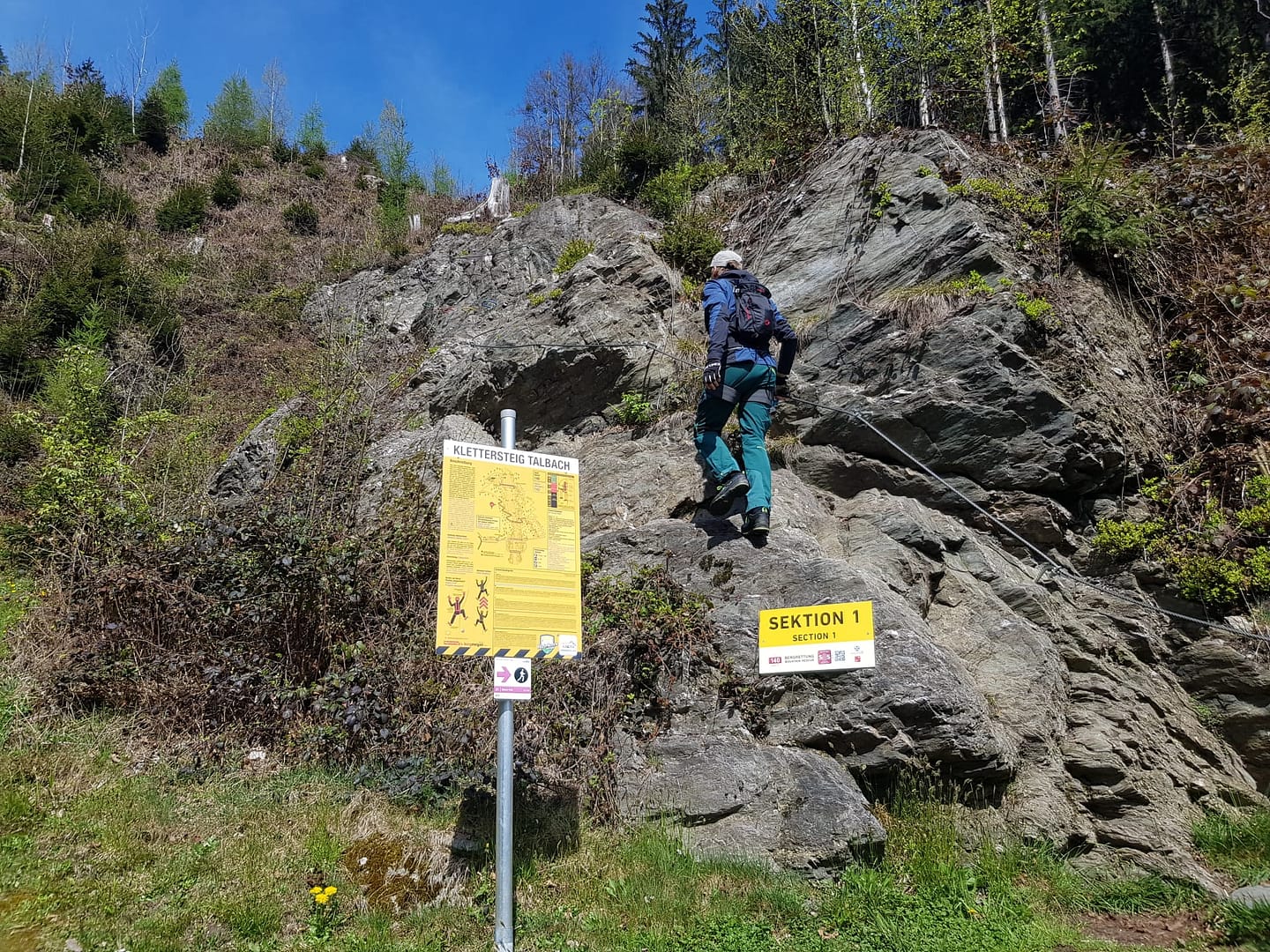 Vom Parkplatz geht man links am Bogenparcour vorbei und gelangt zu Start des Klettersteigs, der direkt mit einer Seilbrücke beginnt. Diese kann man aber auch unten rum über eine Brücke, die über den Talbach verläuft, umgehen, wenn einem dieses Hindernis nicht so liegt.