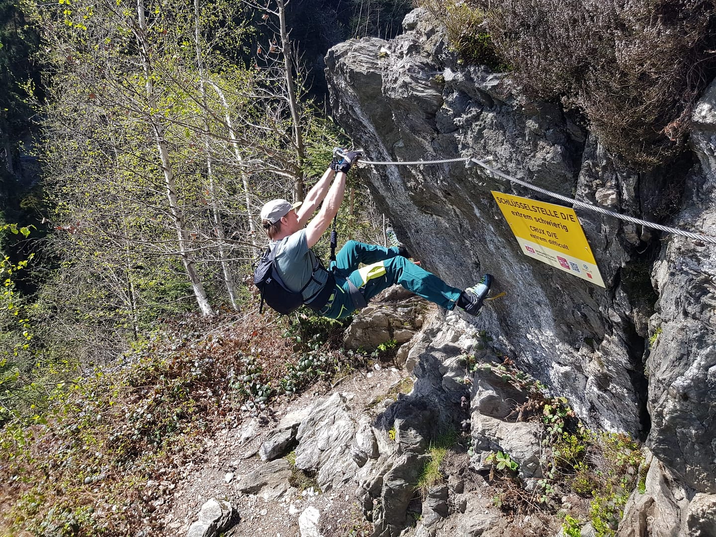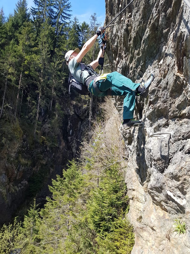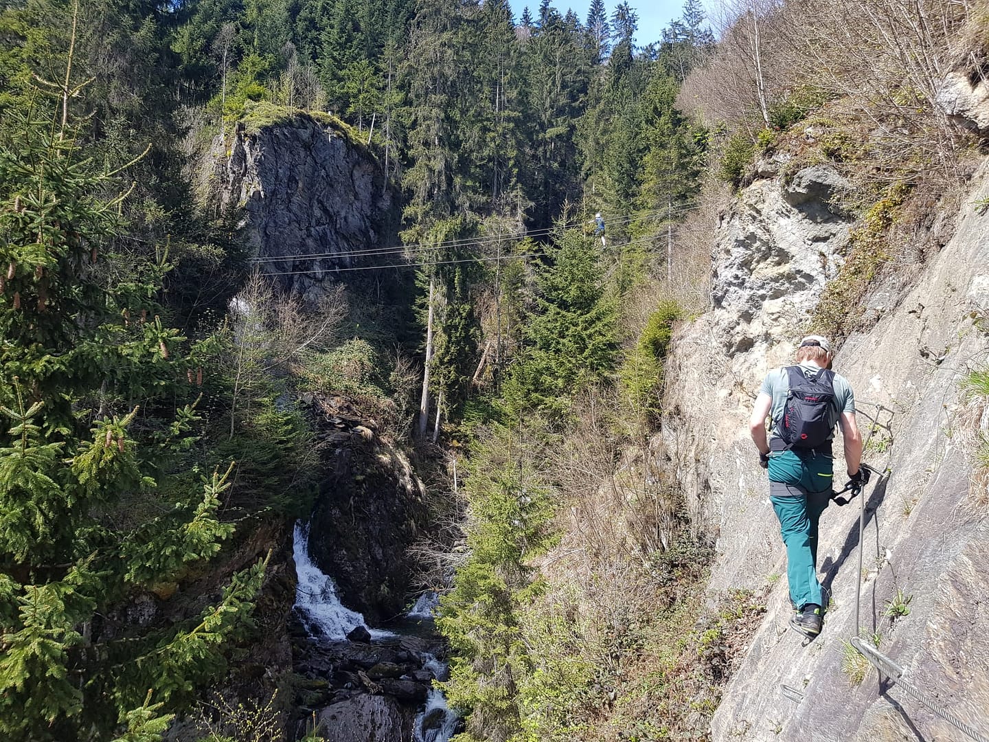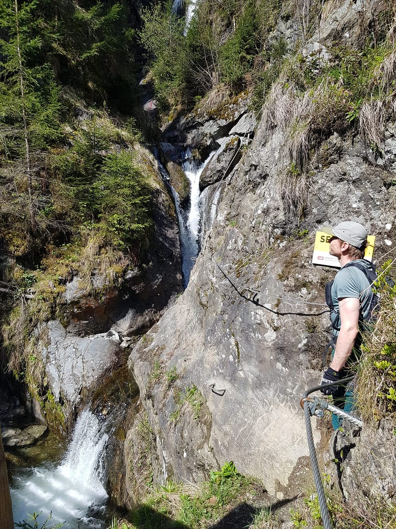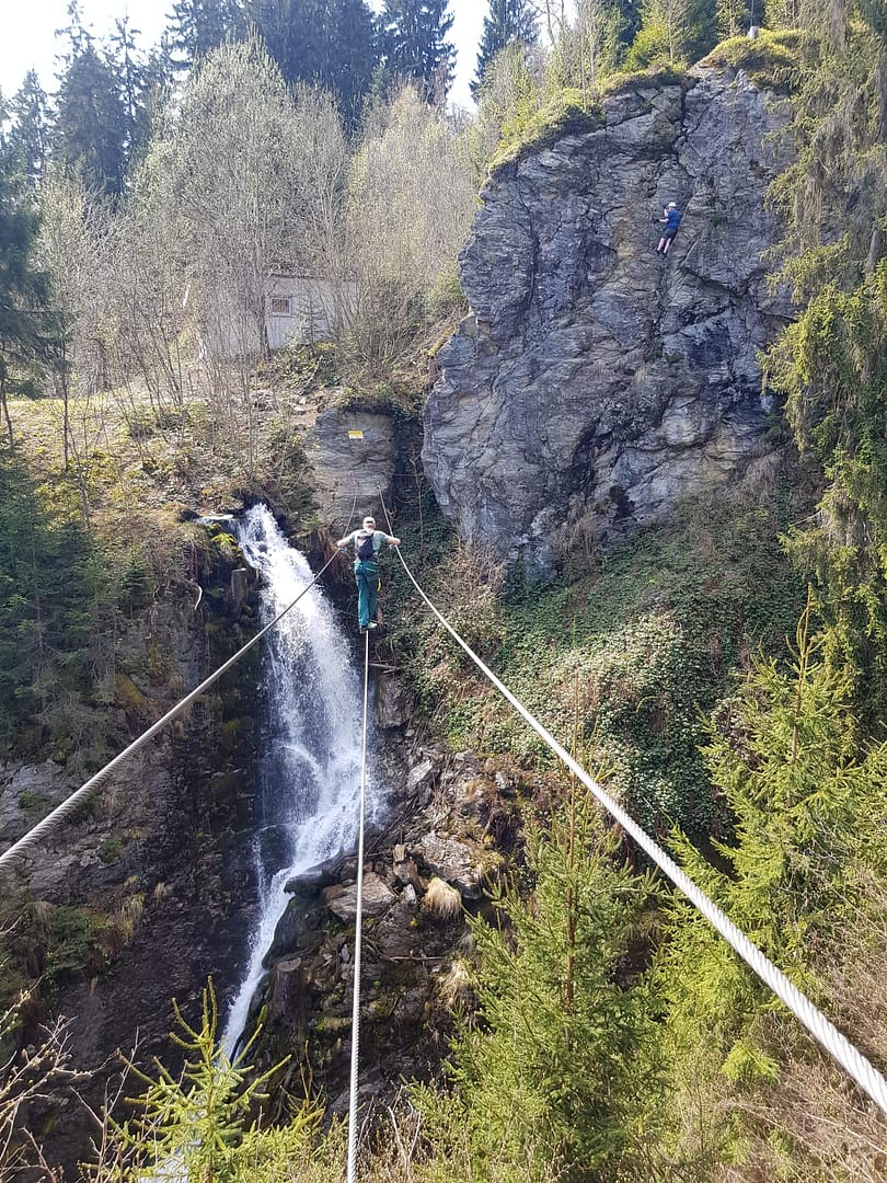 Der zweite Teil, der Hauptklettersteig, liegt im Schwierigkeitsbereich C/D, auch hier gibt es zwei Notausstiege. Das Highlight sind die zwei langen Seilbrücken, die ein wenig schwingen, also sollte man absolut schwindelfrei sein. Der tosende Wasserfall rauscht unter einem durch, was das tolle Erlebnis abrundet.