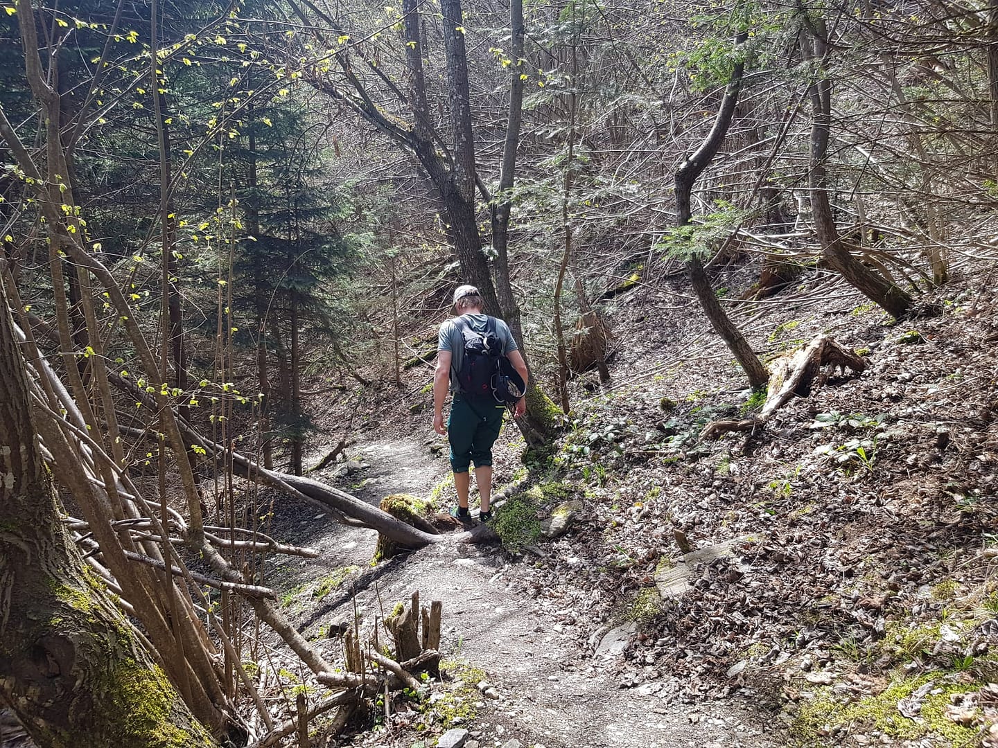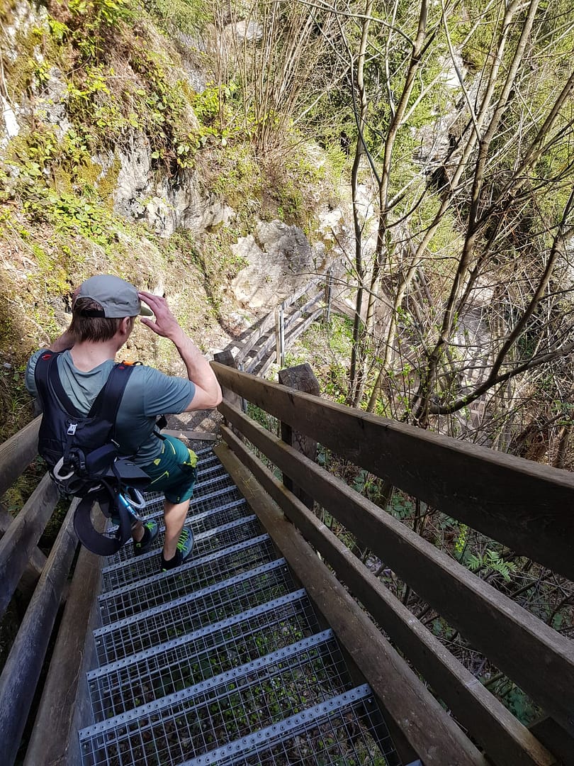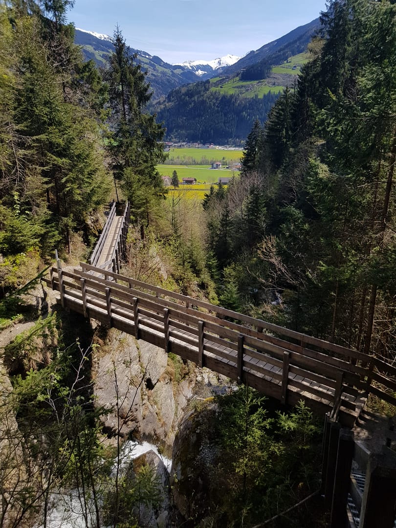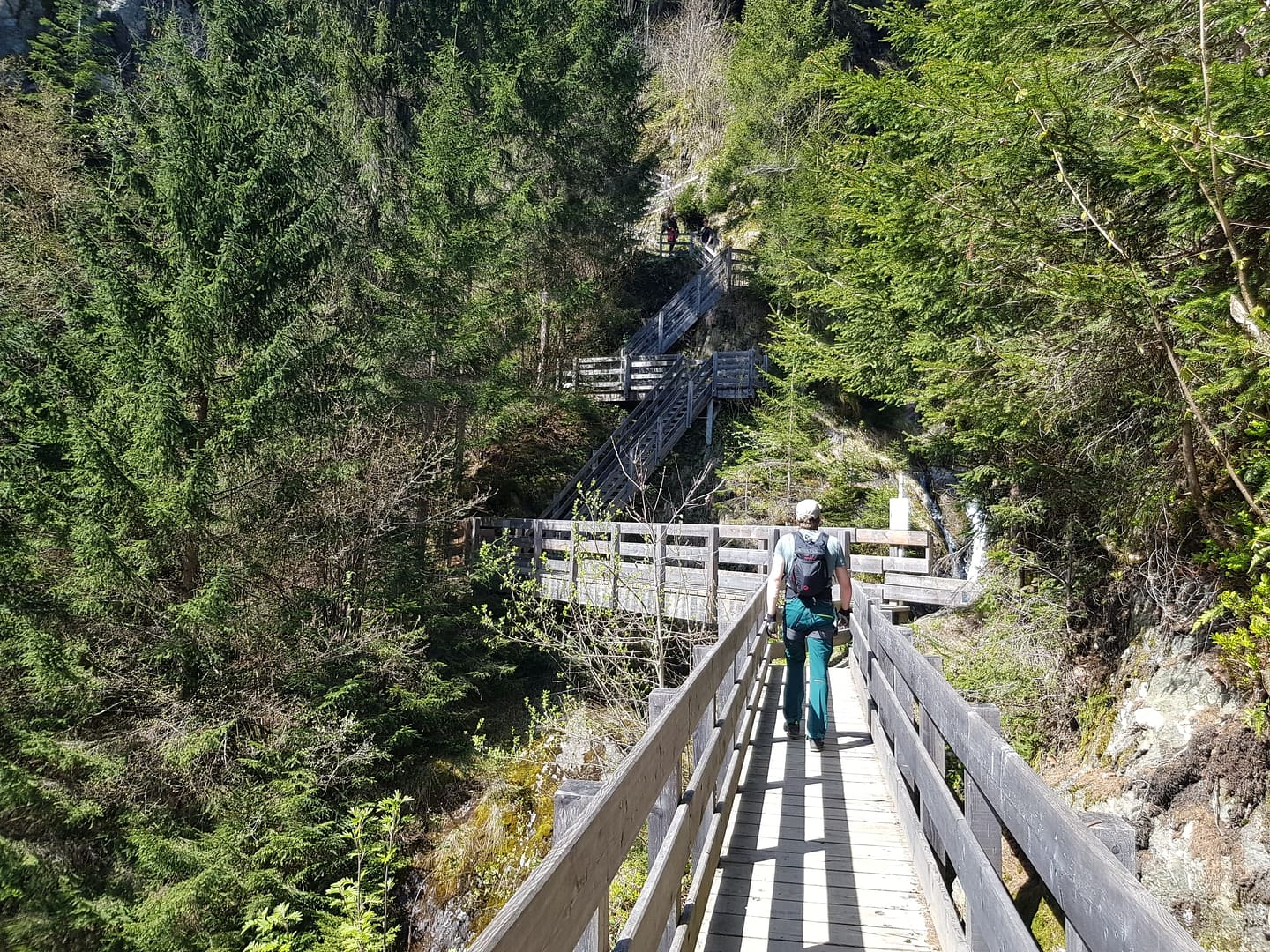 Wir steigen auf dem ausgeschilderten Weg runter zur Jausenstation am Parkplatz wieder ab. Es geht entlang des Wasserfalls über Holzbrücken und Treppen runter.