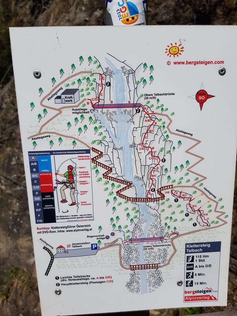 Der Klettersteig ist in zwei Teile unterteilt, der untere Teil ist so errichtet, dass man sich langsam an die Schwierigkeit ran tasten kann und ist für Einsteiger und Kinder ideal erbaut; auch süß gemacht mit den bunten Material. Der Trainingsparcour steigert sich langsam in der Schwierigkeit von A bis D/E, nach jedem Abschnitt kann man austeigen und diese umgehen.