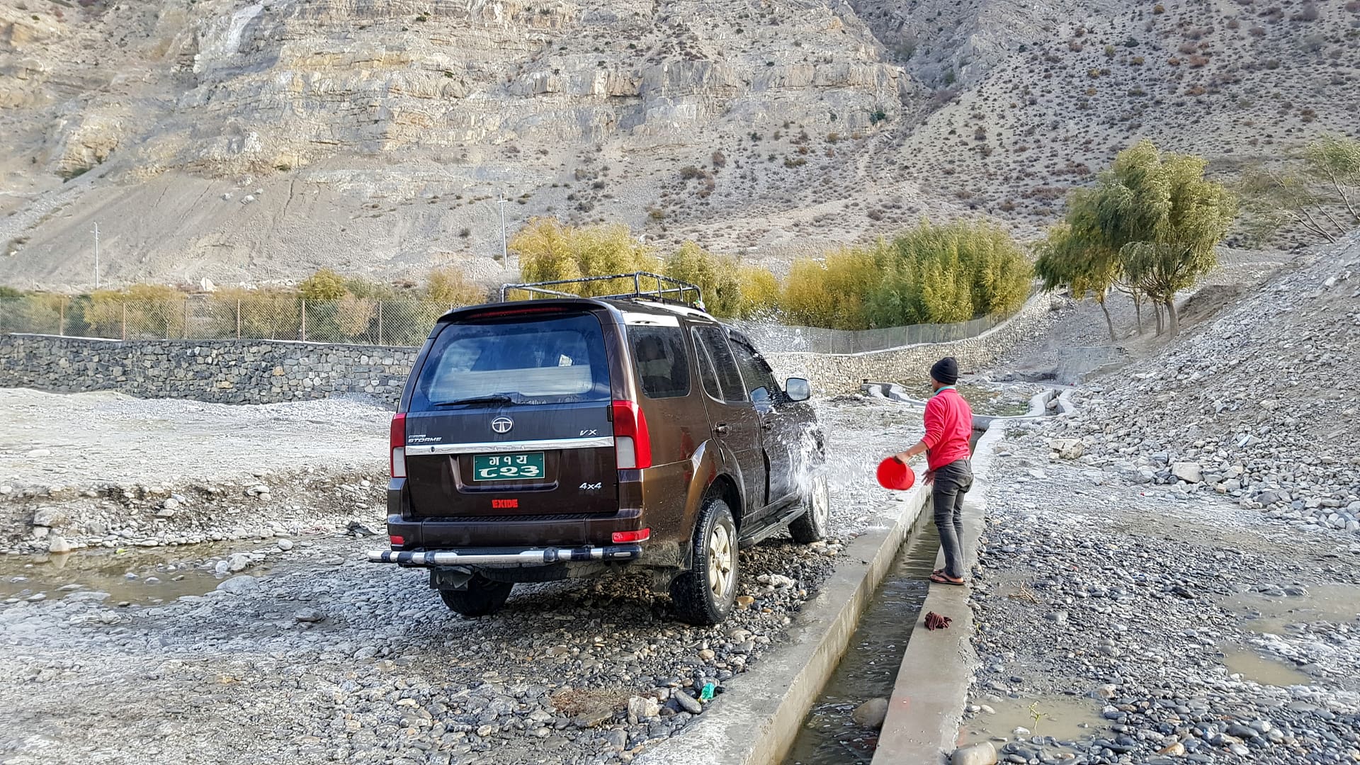 Kurz vor Jomsom hat ein Einheimischer sein Auto gewaschen. Ihr fragt euch was daran spannend wäre? Nun ja, in Nepal gibt es keine Waschstraßen wie in Deutschland, stattdessen wir mit einem Eimer und einem Lappen das Auto sauber gemacht. Unten auf dem letzten Bild seht ihr, wie es gemacht wird. Als erstes Fährt man an solch eine Rinne ran und bespritzt sein Auto zunächst mit dem Wasser raus. Dann heißt es putzen. *hehe* Übrigens weiter kam bereits 20 Meer weiter die nächste Staubwolke angerollte, weil ein Laster in die Straße abgebogen ist. Mir stellt sich die Frage, wie lohnenswert diese Autowäsche ist.