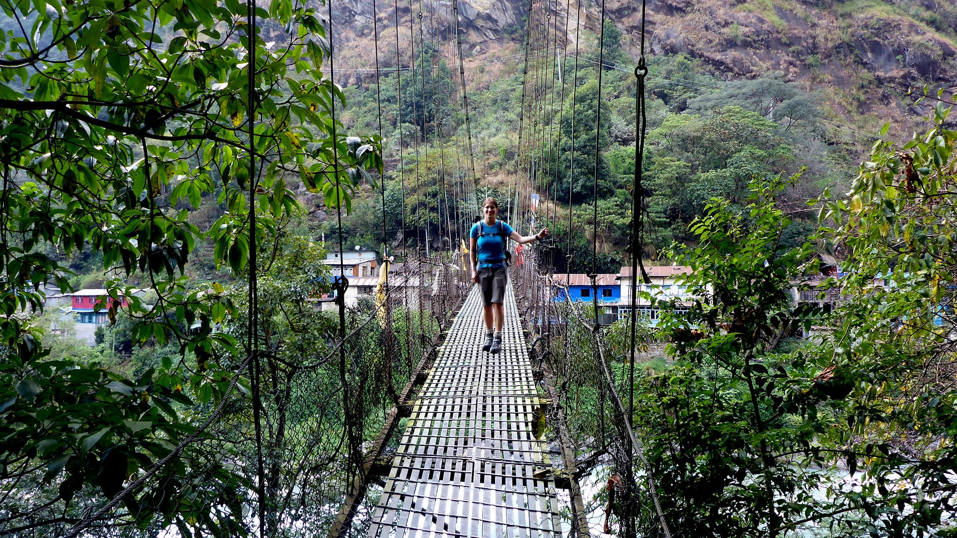 Der restliche Weg nach Jagat war nicht mehr so weit und anstregend. Von Ghermu führte der Pfad runter an den Fluss und über eine Hängebrücke rüber zum anderen Ufer. Ab hier ging es wieder bergauf und wir merkten doch so langsam unsere Beinmuskulatur. Nach einer Kurve konnte man aber unseren Zielort bereits aus weiter Ferne zwischen Bäumen entdecken. So ging der Weg dahin, bis wir endlich in Jagat ankamen.