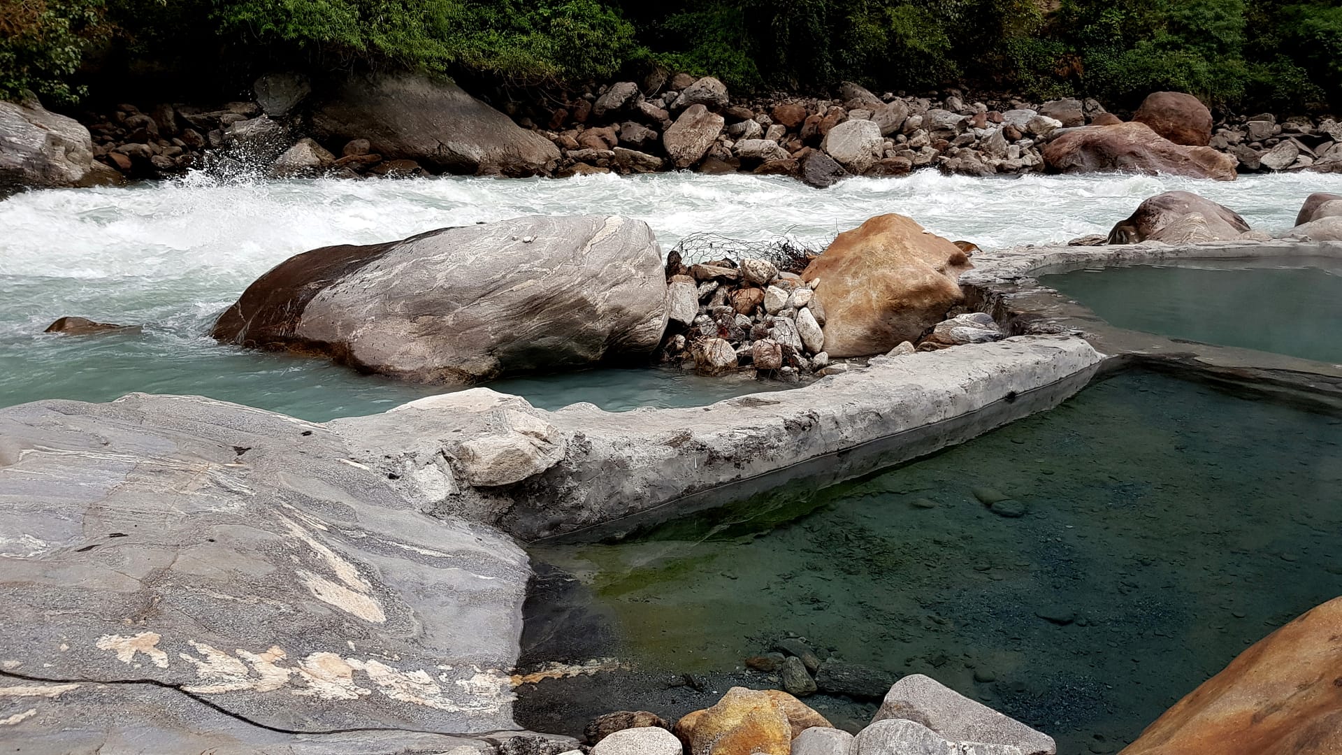 In Jagat gibt es zwei Hot Springs: Eine am Anfang des Ortes und eine Zweite ca. 20 Minuten Fußweg auf der anderen Seite hinter dem Dorf. Der Besitzer der Unterkunft erklärte uns, dass die erste nicht so schön sei wie die Zweite, der einzige Vorteil ist die Nähe. Nach ganz kurzer Überlegung, ob wir wirklich nach einem so heißen Tag in eine heiße Quelle springen wollten, packten wir dann doch unsere Sachen und gingen los. Wir entschieden uns natürlich für die… zweite heiße Quelle!