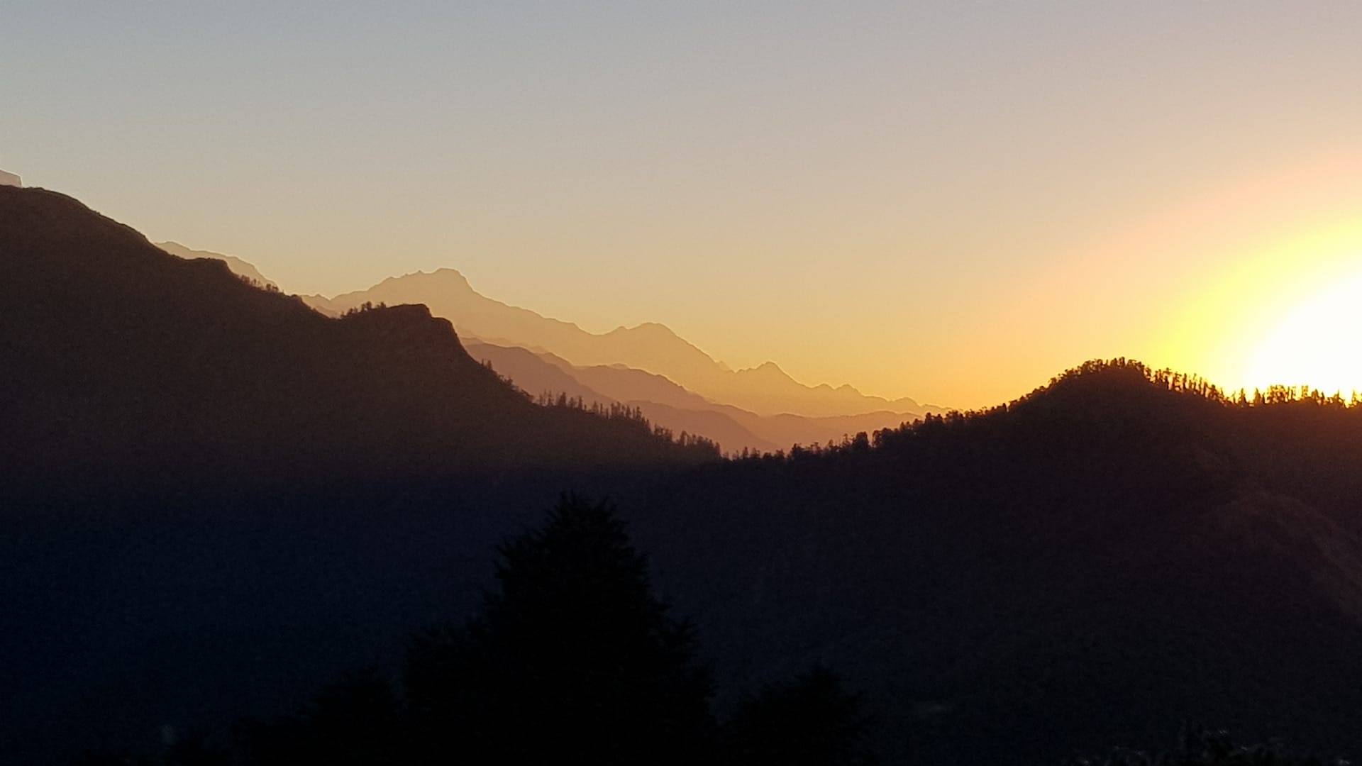 Ungefähr um 6 Uhr morgens ging die Sonne langsam auf, der Himmel färbte sich, die Gipfel wurden in gleißendes Licht eingetaucht und wenig später leuchteten die schneebedeckten Berge im rötlichen Licht. Die Aussicht mit dem Sonnenaufgang war wunderschön.
