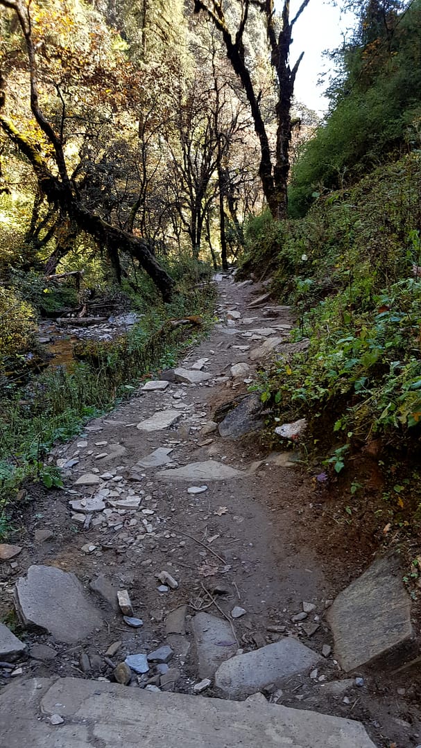 Danach führte der stufige Weg rauf und runter durch wunderschöne Waldstücke / Dschungel und kleinen Dörfern vorbei. Kurz vor Tadapani ggingen wir bis an einen Fluss runter, querten diesen und mussten auf der anderen Seite sehr viele Stufen wieder rauf klettern. Gegen 12 Uhr hatten wir unser Ziel erreicht und genehmigten uns ein leckeres Mittagessen mit traumhaft-schönen Blick in die Berge. In Tadapani gab es nicht viel er tun oder zu erleben, denn das Dorf bestand eigentlich fast nur aus Unterkünften und Verkaufsständen.