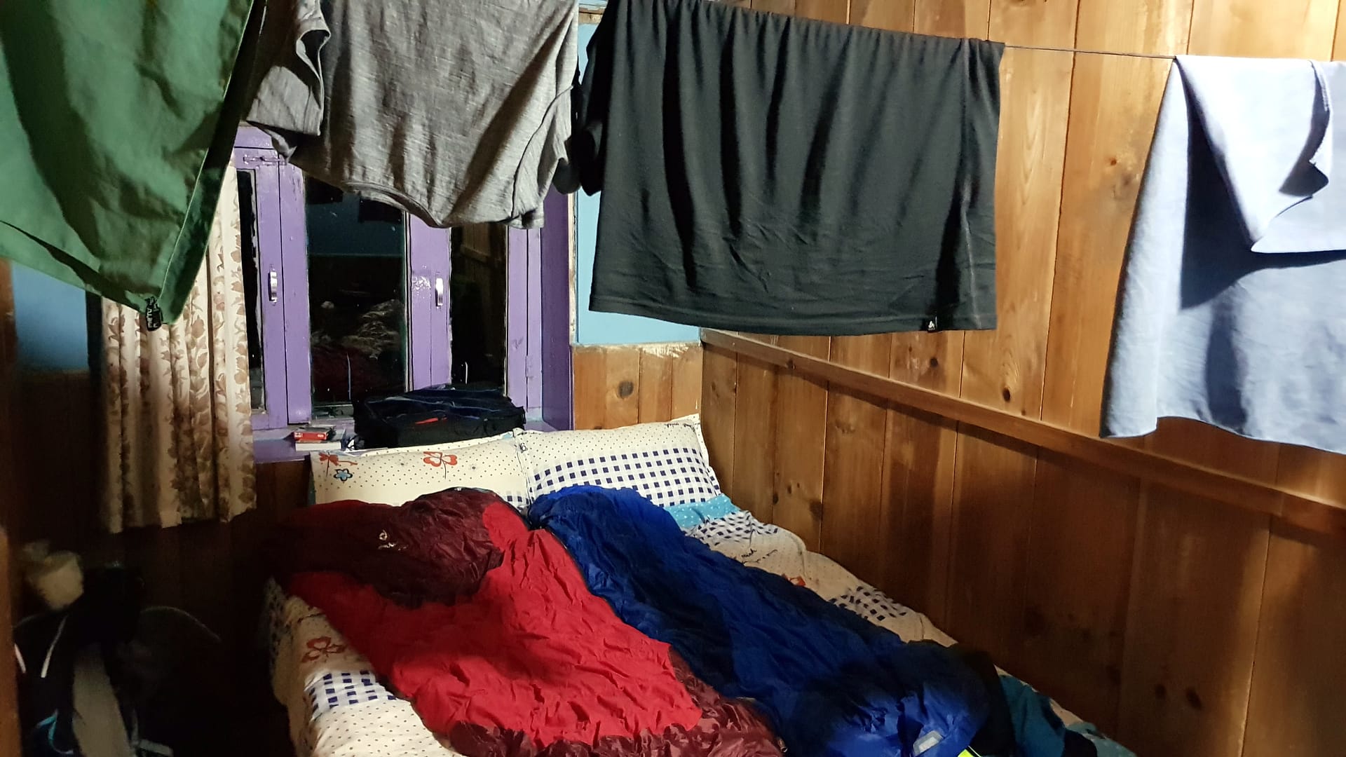 Wegen des heißen Tages und der doch schnell-abkühlenden Luft, wollten wir uns hier eine heiße Dusche genehmigen. Vorher noch schnell ein paar Klamotten gewaschen, die wir aufgrund des Wetters ins Zimmer gehängt hatten, statt nach draußen. Trotz eines großen Schildes, dass es eine heiße Dusche geben sollte, war dies nicht der Fall. Oder der Besitzer von der Unterkunft und ich haben eine gewiss andere Vorstellung von „heiß/warm“. *grins* Nach der eher kälteren Dusche musste ich mich erst einmal in meinem Schlafsack wieder aufwärmen.