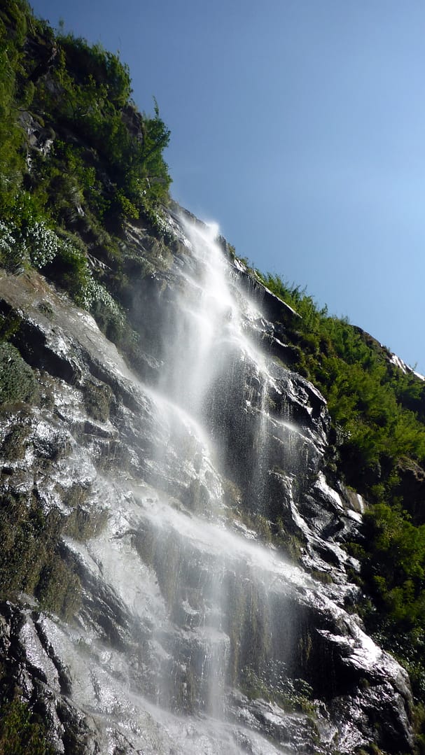 Nach einem leckeren Frühstück um 7 Uhr morgens, machten wir uns eine halbe Stunde später auf den Weg. Das erste Stück der Straße kannten wir bereits von unserem gestrigen Ausflug zur heißen Quelle. Leicht bergab führte die Straße zu einem kleinen Dorf von wo ein Pfad rechts von der Straße abzweigte. Durch Bambushaine und kleine Waldstücke schlängelte sich der Weg durch eine grüne (aber auch teilweise staubige) Oase so dahin. Immer wieder tauchten kleinere bis größere Wasserfälle am Rande des Tales auf, so dass man sich über kleine Spritzer an dem warmen, sonniger Tag erfreuen konnte.