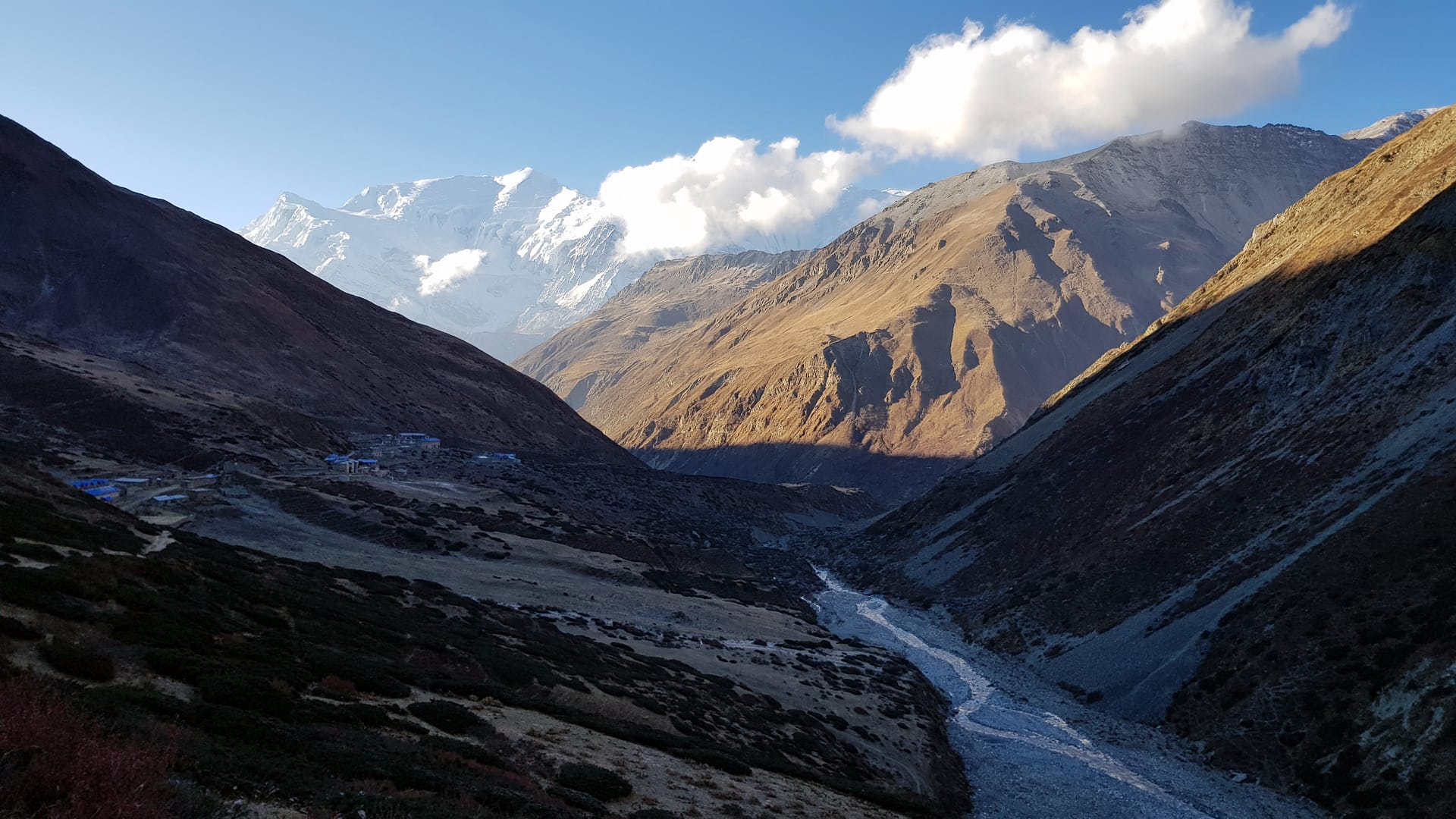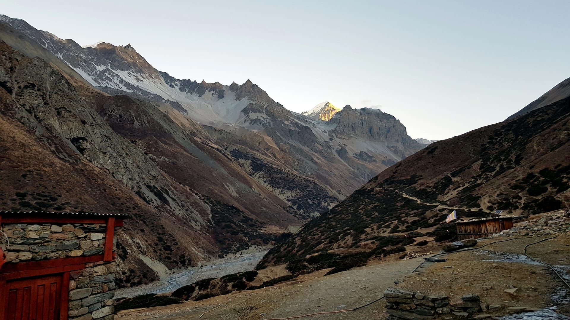 Im schattigen Tal startete unser Tag, erst haben wir ein paar Höhenmeter gewonnen, die wir dann aber wieder bei der Querung einer Hängebrücke wieder verloren hatten. Danach ging es bergauf an einer Yak Herde vorbei bis zum Ende vom Tal zum Thorung La Base Camp. Um diese Uhrzeit war das Thorung La Base Camp bereits wie ausgestorben, weil die Trekker so früh wie möglich ihren Weg über den Pass antraten. Steile Serpentinen säumten die letzten Höhenmeter des Weges, und kurz darauf sahen wir bereits die ersten Gebäude vom High Camp.