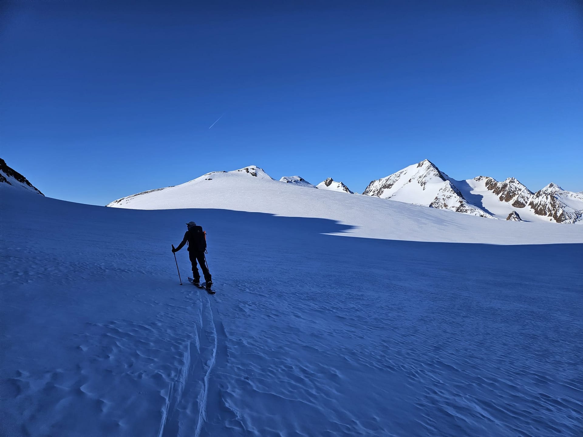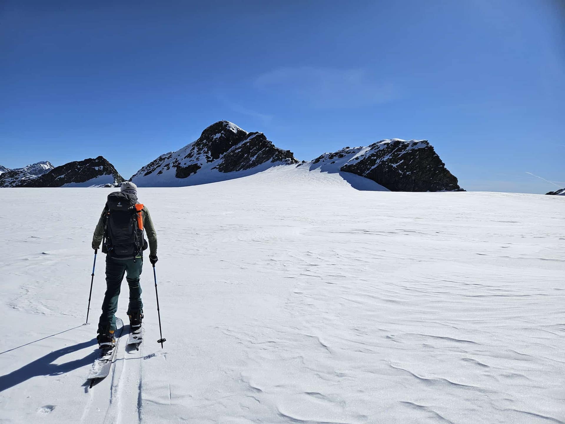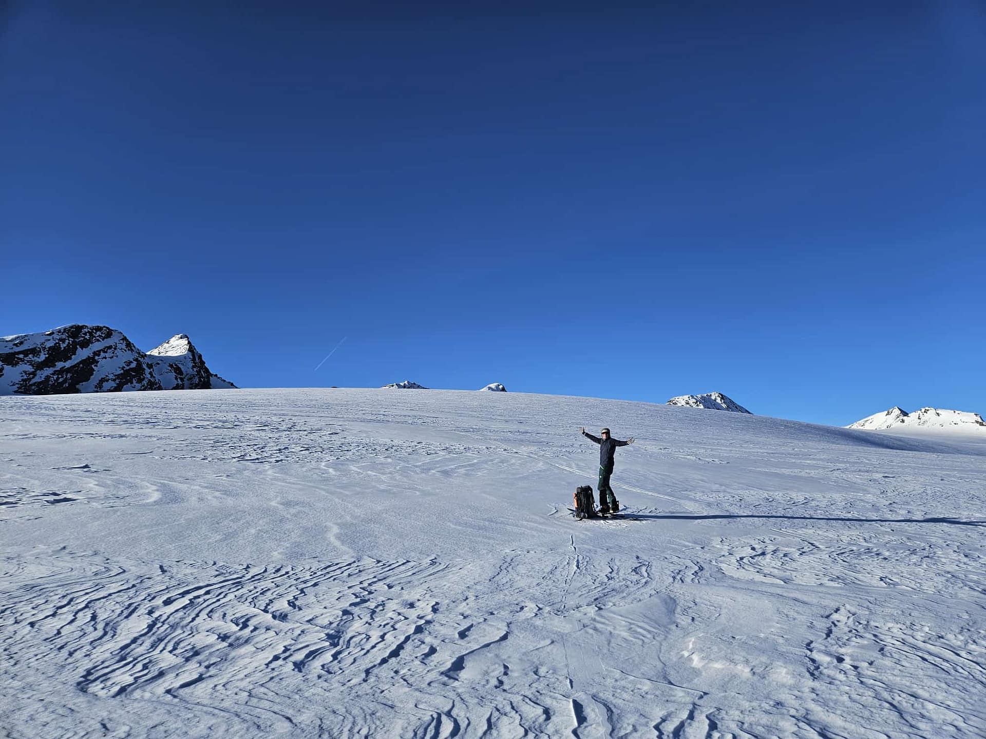 Wir starten am Brandenburger Haus und fahren zunächst einige Höhenmeter bis auf den Gletscher ab. Dort wechseln wir in den Aufstiegsmodus. Unsere Hochtourenausrüstung haben wir tatsächlich im Winterraum gelassen, da die Schneedecke auf dem Gletscher noch ausreichend tragfähig war. In südlicher Richtung gehen wir in einem leichten Rechtsbogen mit moderater Steigung an den Hintereisspitzen entlang. Die Hintere Hintereisspitze umrunden wir und steigen anschließend auf die Hochvernaglwand auf. Oben angekommen erwartet uns ein traumhafter 360°-Ausblick auf die umliegenden Gletscher und Gipfel.