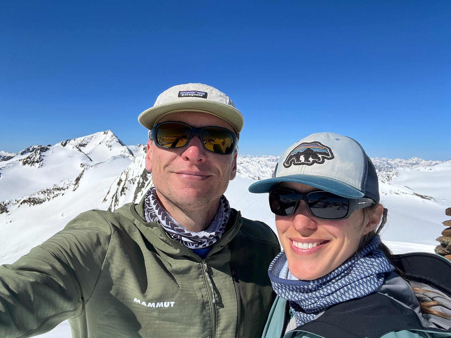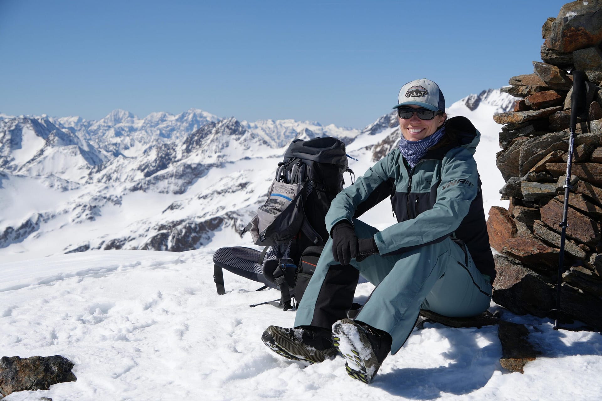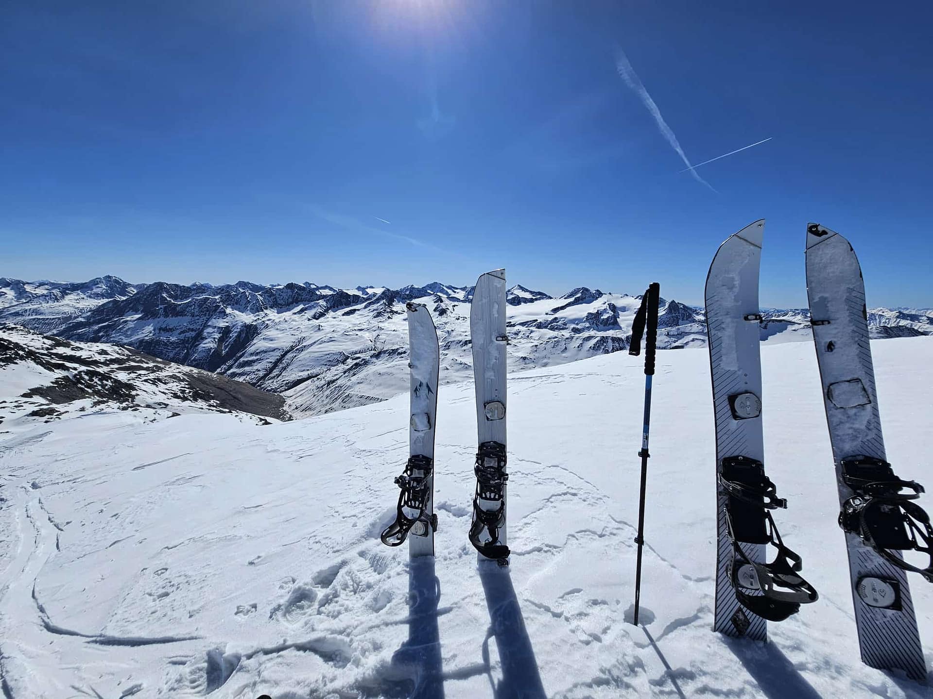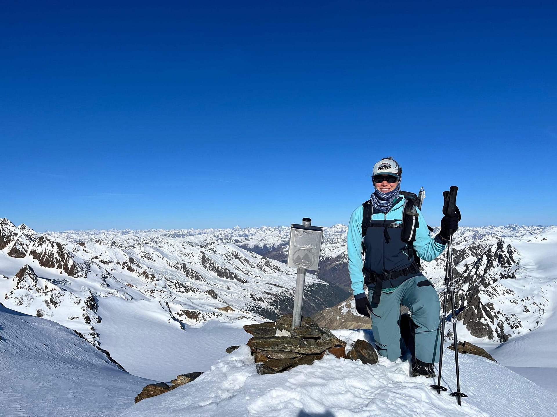 Wir starten am Brandenburger Haus und fahren zunächst einige Höhenmeter bis auf den Gletscher ab. Dort wechseln wir in den Aufstiegsmodus. Unsere Hochtourenausrüstung haben wir tatsächlich im Winterraum gelassen, da die Schneedecke auf dem Gletscher noch ausreichend tragfähig war. In südlicher Richtung gehen wir in einem leichten Rechtsbogen mit moderater Steigung an den Hintereisspitzen entlang. Die Hintere Hintereisspitze umrunden wir und steigen anschließend auf die Hochvernaglwand auf. Oben angekommen erwartet uns ein traumhafter 360°-Ausblick auf die umliegenden Gletscher und Gipfel.