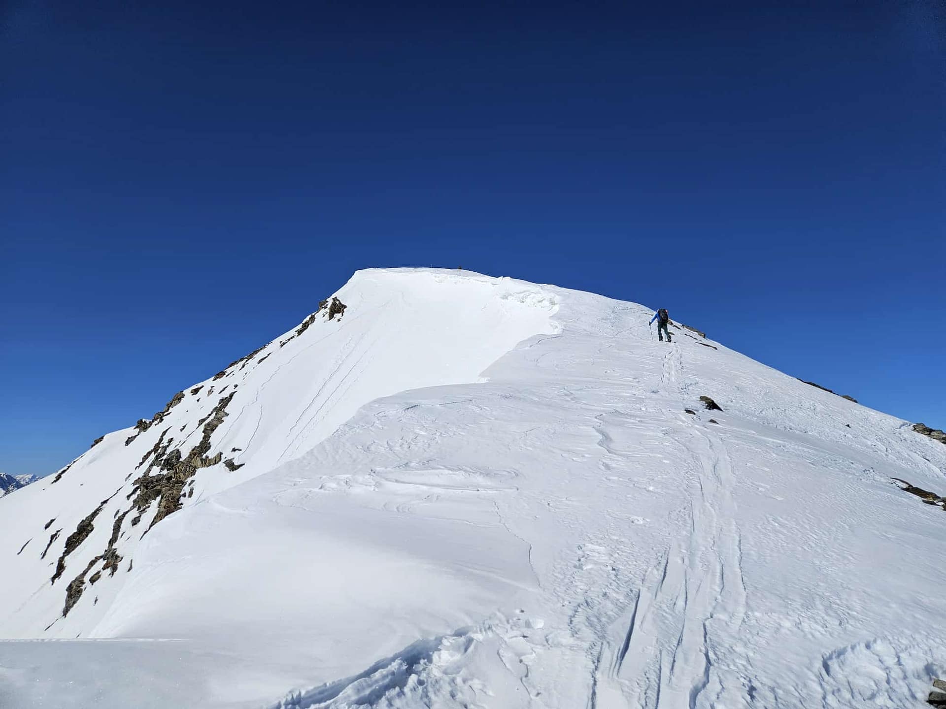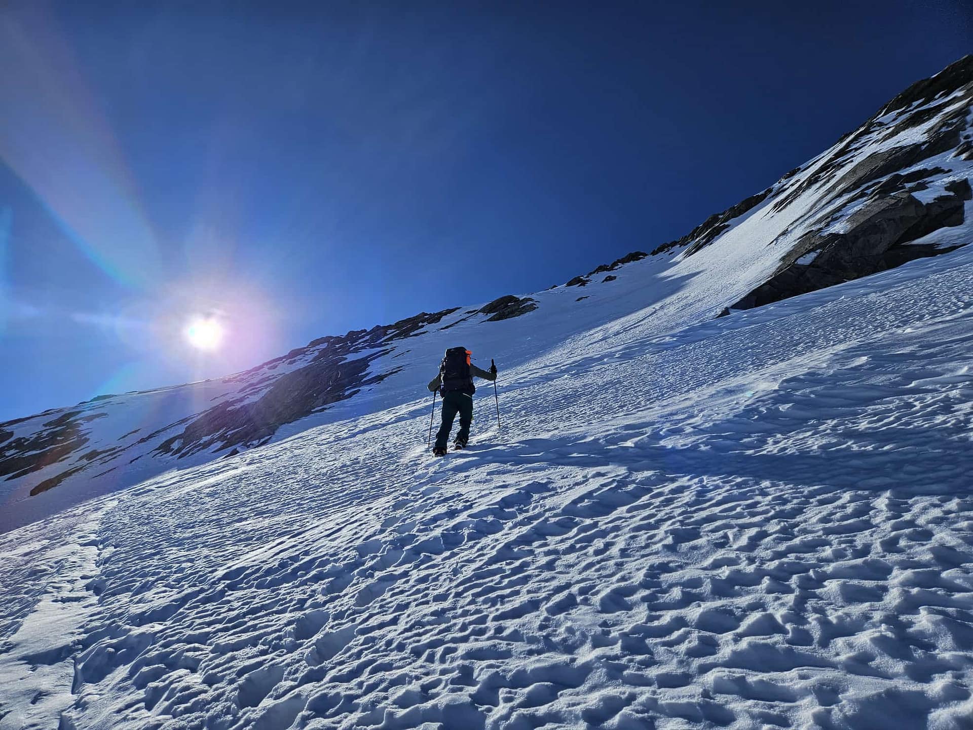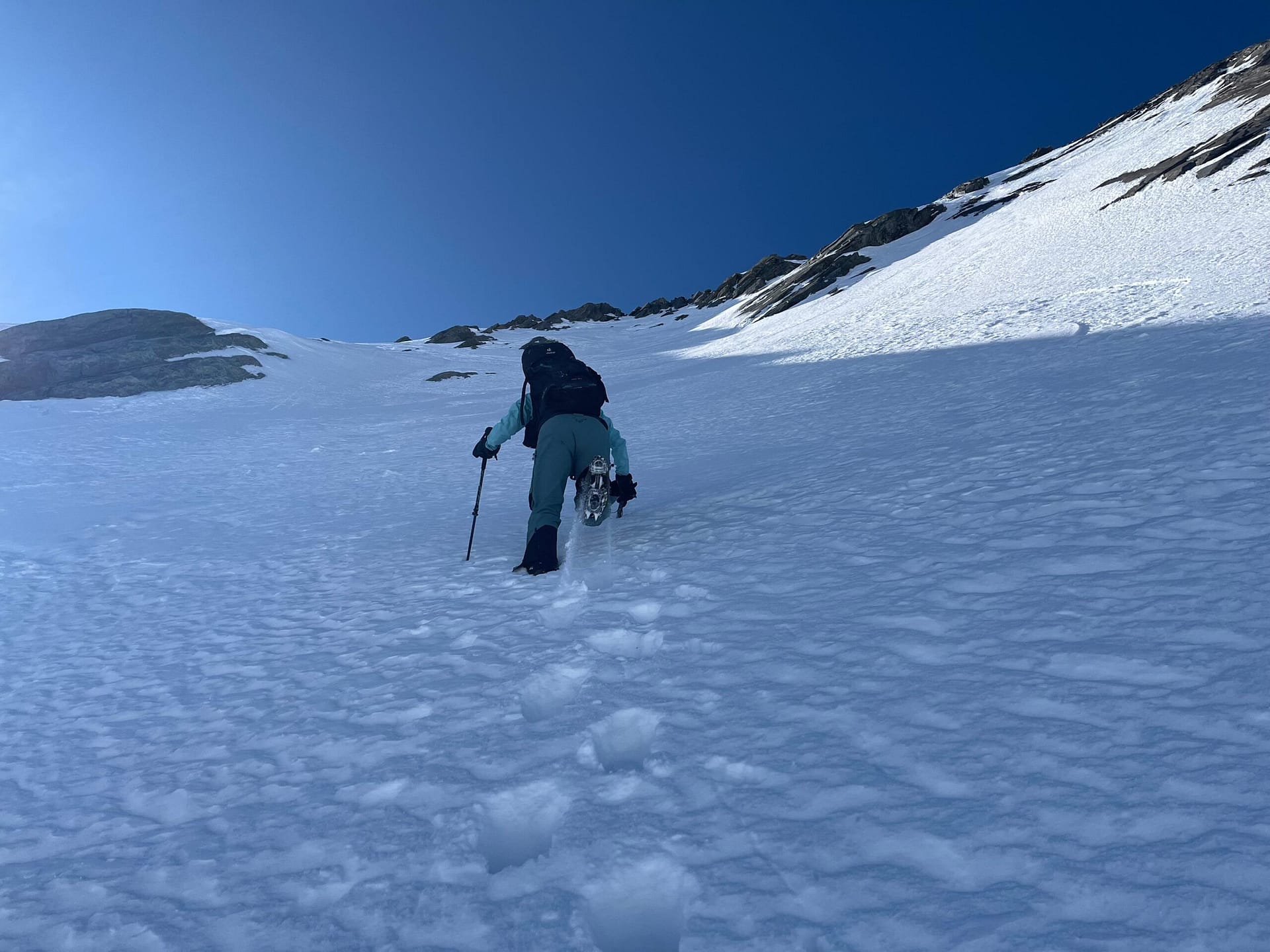 Im steilen Nordwesthang (ca. 40–45°) entdecken wir Aufstiegsspuren und entscheiden uns, diesen Weg zu versuchen, da uns die eigentliche Aufstiegsroute beim Hinweg nicht ganz überzeugt hatte. Mit Ski kommen wir jedoch nicht weiter, weshalb wir auf Steigeisen wechseln und den Hang zu Fuß aufsteigen. Auf etwa 3.445 m ist schließlich Schluss: Wir sinken bis zur Hüfte im Schnee ein und finden trotz Steigeisen keinen Halt mehr. Daraufhin brechen wir den Versuch ab und kehren zu unserem Skidepot zurück.