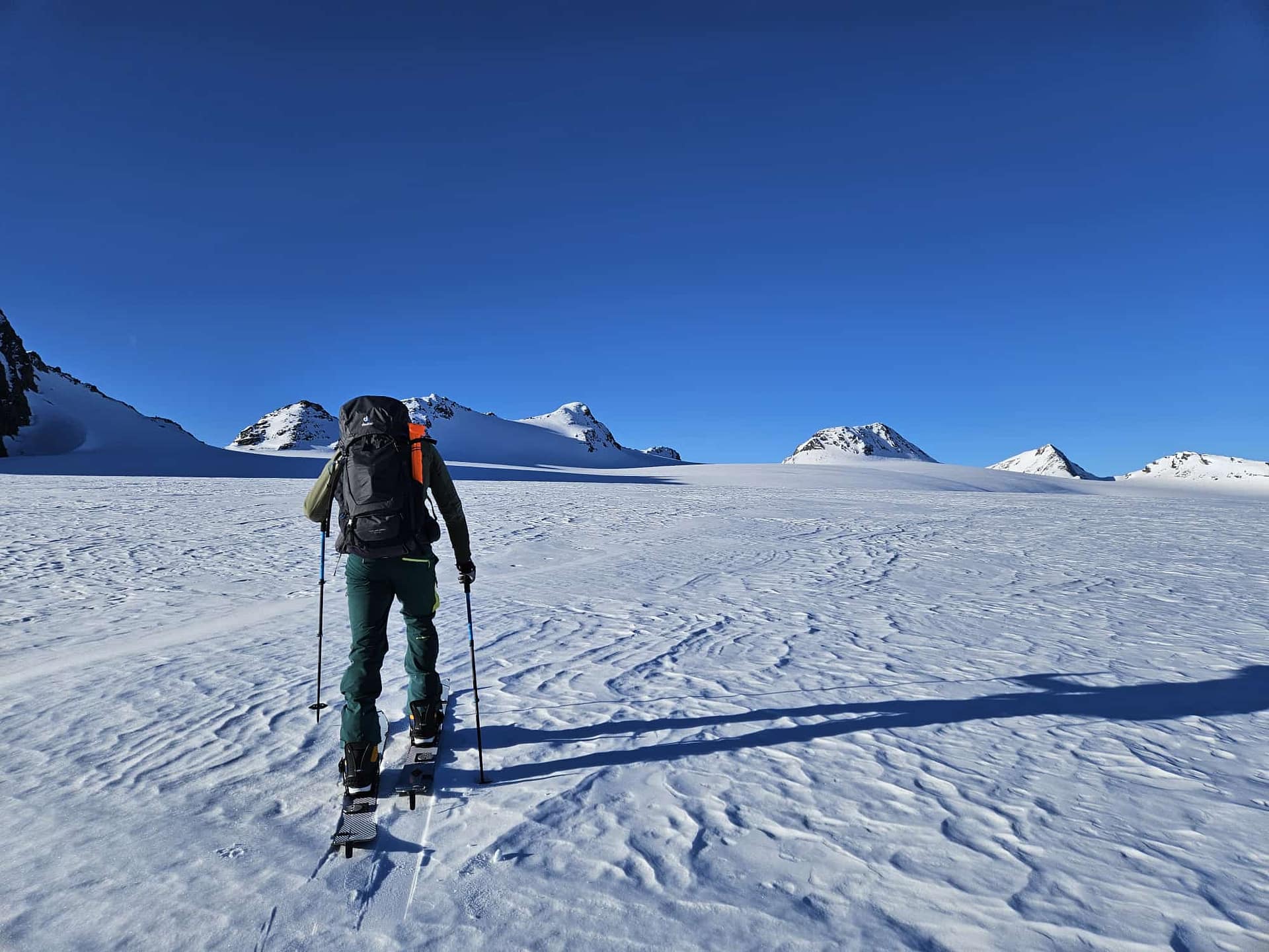 Für den nächsten Abschnitt fahren wir wieder in Richtung Hintere Hintereisspitze ab. Die Neigung ist zunächst moderat, sodass wir bald wieder in den Aufstiegsmodus wechseln müssen und leicht bergauf weitergehen.