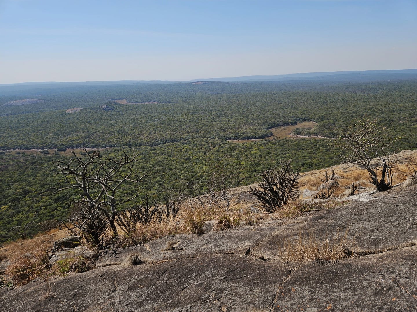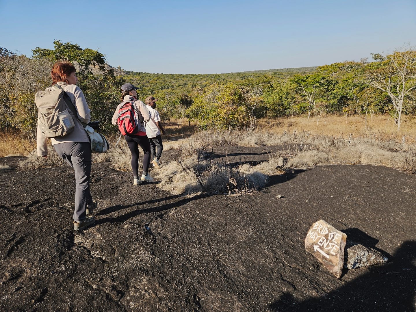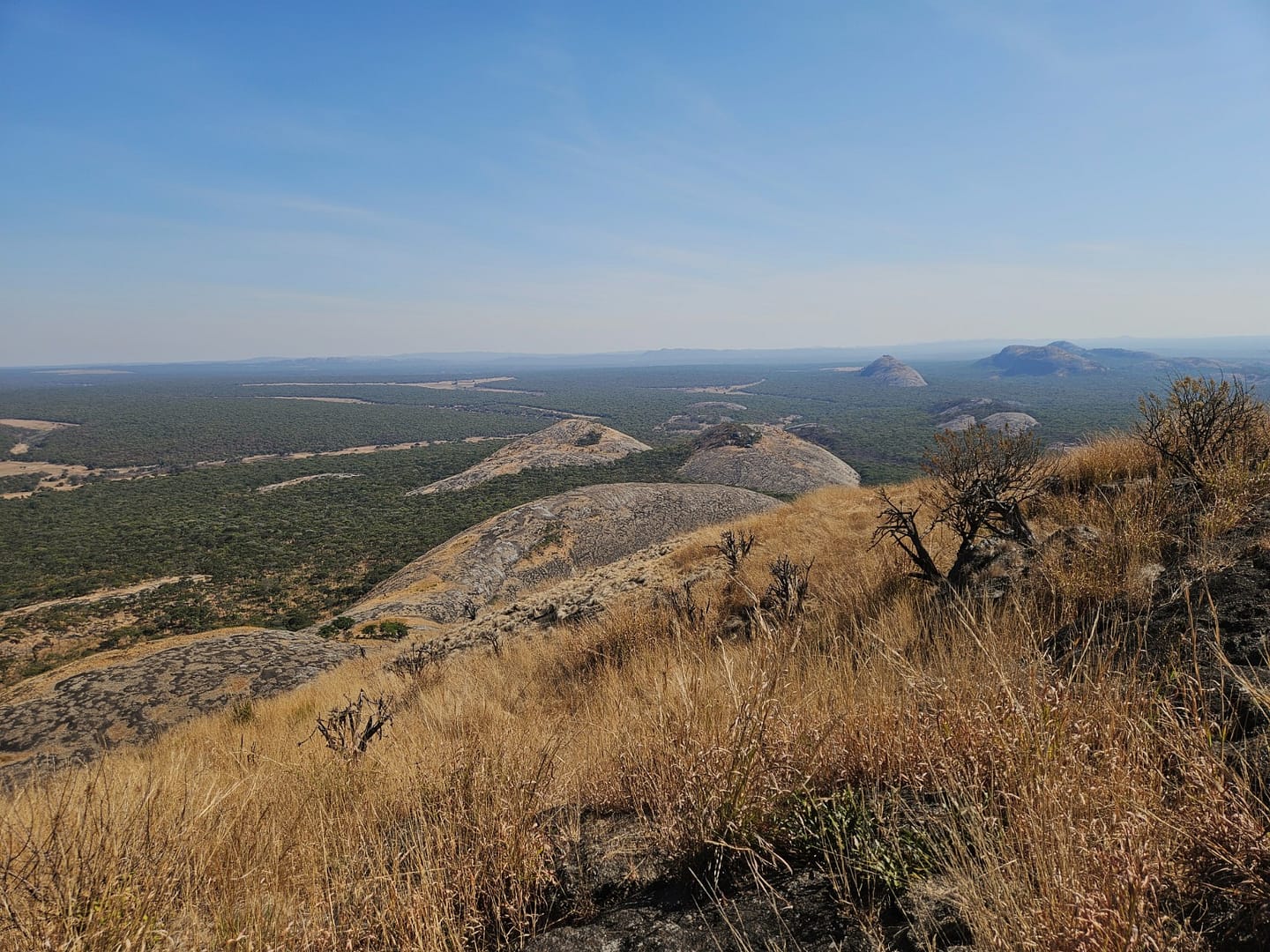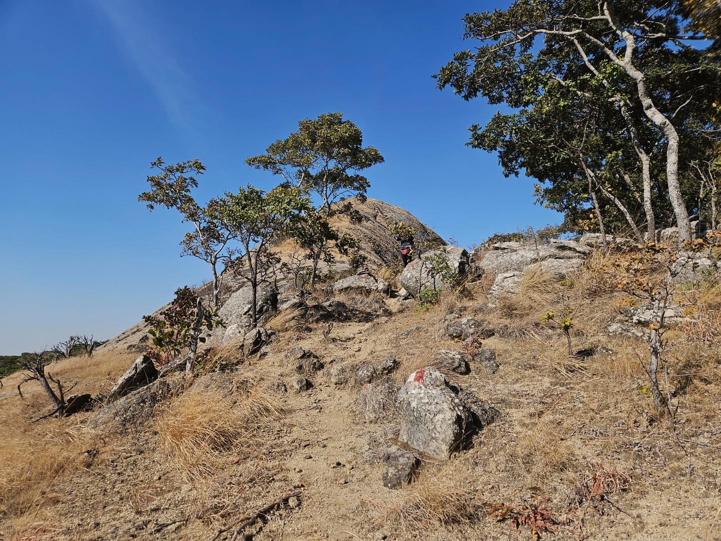 Nach etwa 3,6 Kilometern erreichen wir den Fuß des Berges, und von hier an wird der Aufstieg deutlich steiler. Zahlreiche rote Punkte weisen uns den Weg – Überbleibsel der Bergläufe, die hier vor Jahren regelmäßig stattfanden. Oben angekommen eröffnet sich ein atemberaubender Rundumblick: endlose Miombo-Wälder breiten sich bis zum Horizont aus, durchbrochen von markanten Granitkuppen, den sogenannten Inselbergen sowie den grünen Feuchtgebieten – den „Dambos“.