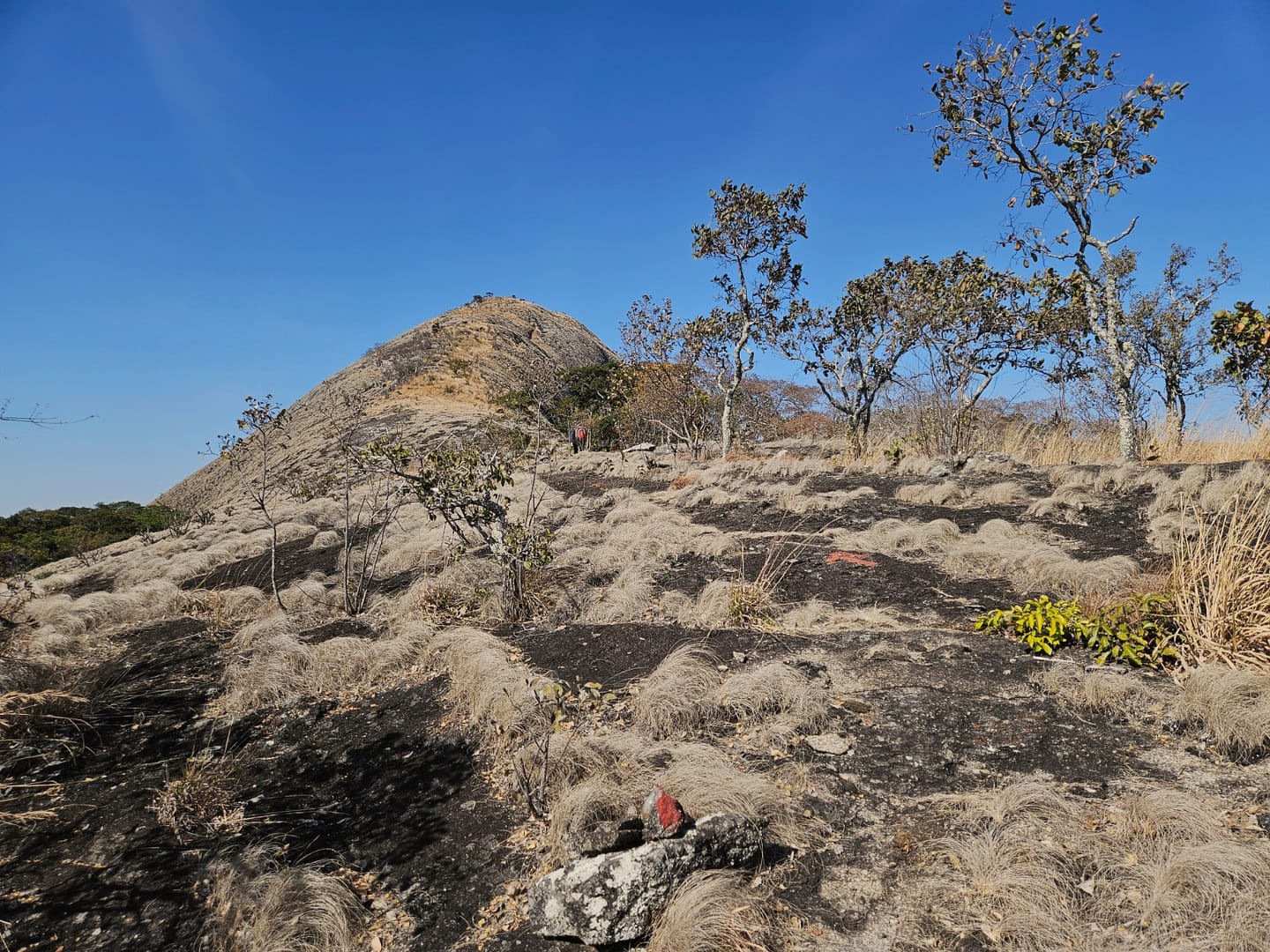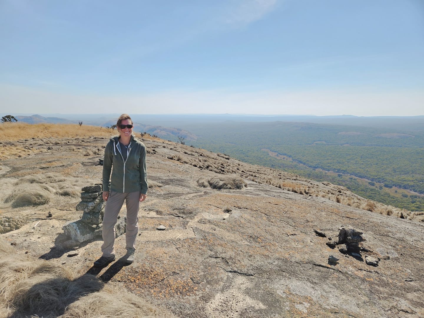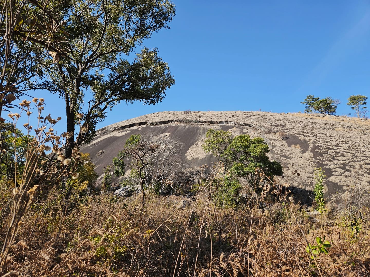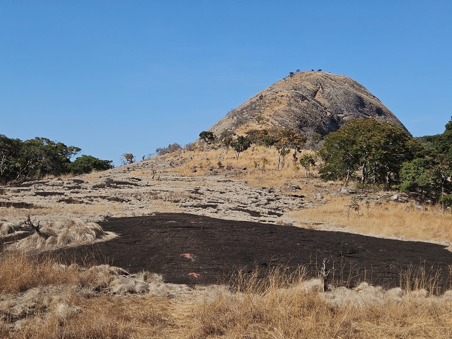 Nach etwa 3,6 Kilometern erreichen wir den Fuß des Berges, und von hier an wird der Aufstieg deutlich steiler. Zahlreiche rote Punkte weisen uns den Weg – Überbleibsel der Bergläufe, die hier vor Jahren regelmäßig stattfanden. Oben angekommen eröffnet sich ein atemberaubender Rundumblick: endlose Miombo-Wälder breiten sich bis zum Horizont aus, durchbrochen von markanten Granitkuppen, den sogenannten Inselbergen sowie den grünen Feuchtgebieten – den „Dambos“.