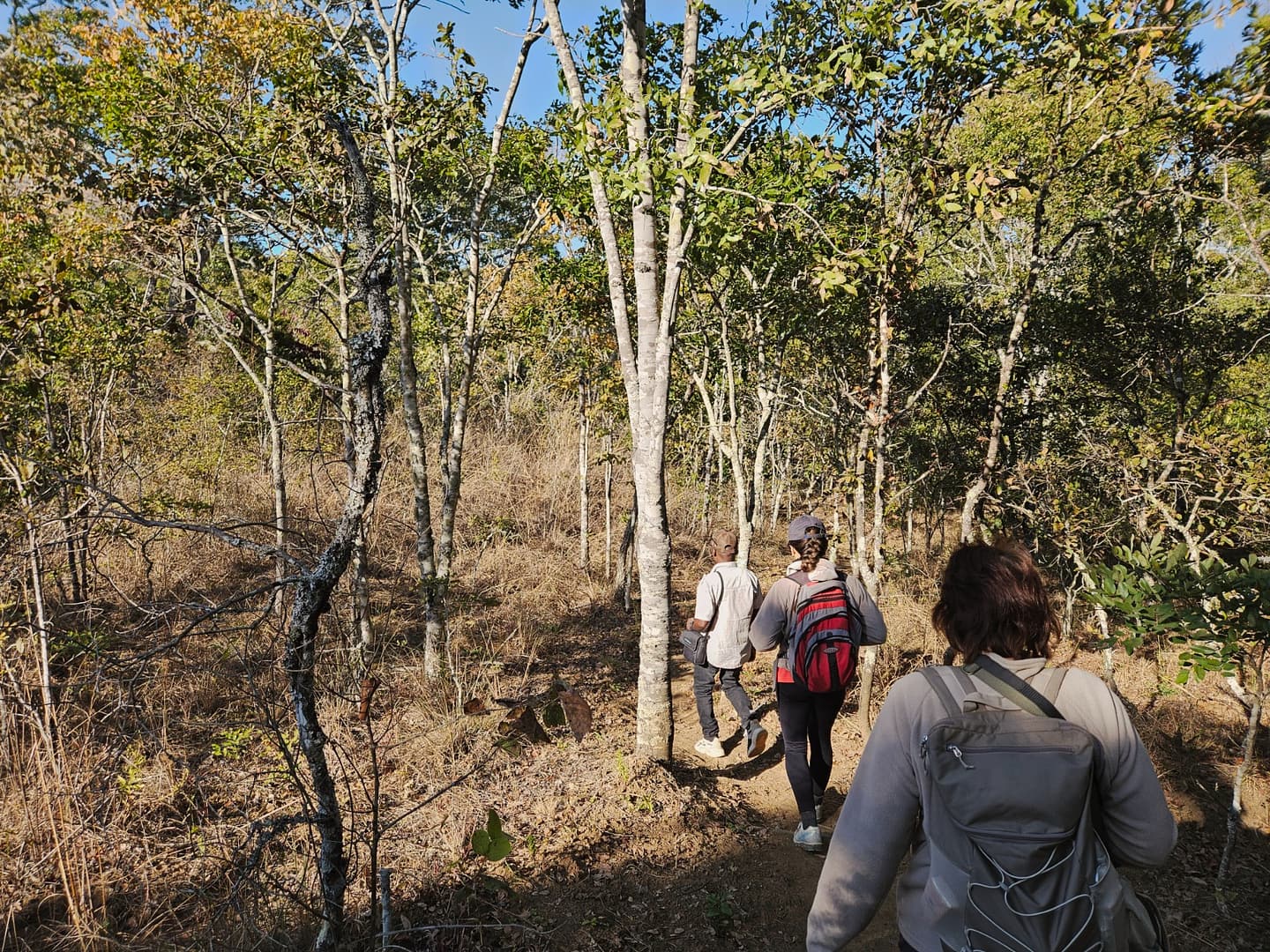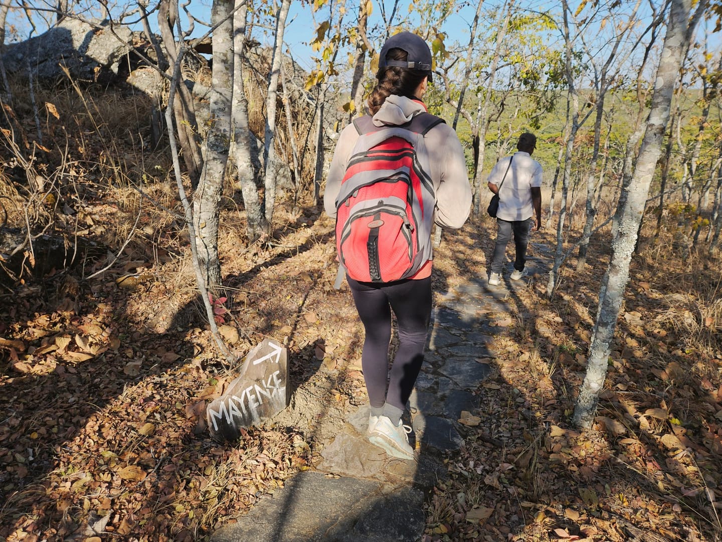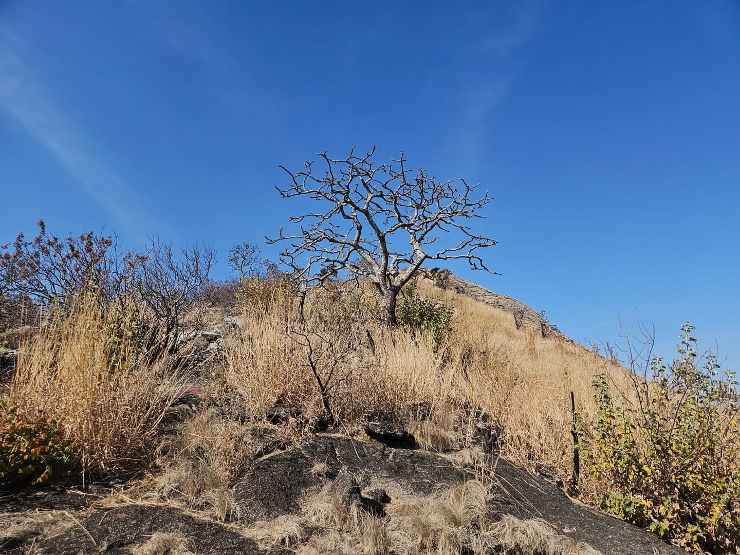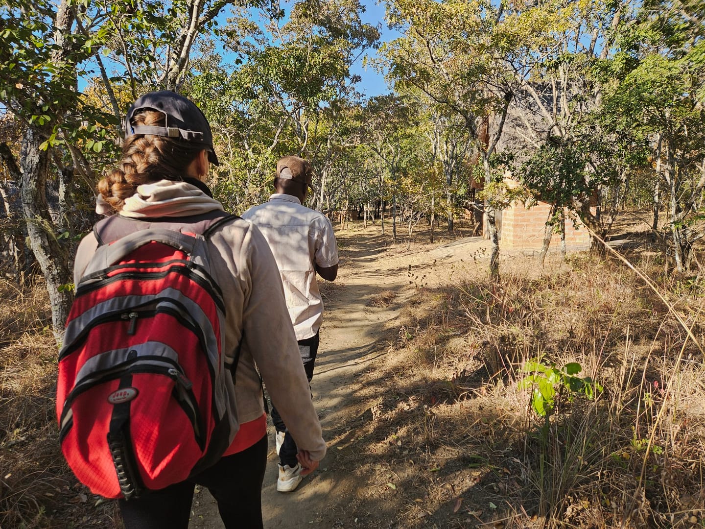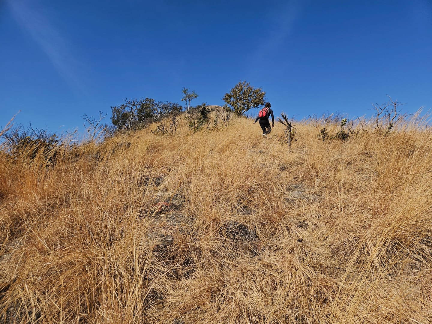 Nach etwa 3,6 Kilometern erreichen wir den Fuß des Berges, und von hier an wird der Aufstieg deutlich steiler. Zahlreiche rote Punkte weisen uns den Weg – Überbleibsel der Bergläufe, die hier vor Jahren regelmäßig stattfanden. Oben angekommen eröffnet sich ein atemberaubender Rundumblick: endlose Miombo-Wälder breiten sich bis zum Horizont aus, durchbrochen von markanten Granitkuppen, den sogenannten Inselbergen sowie den grünen Feuchtgebieten – den „Dambos“.