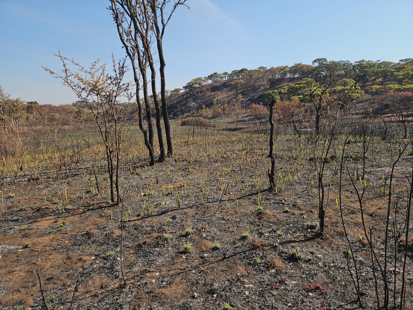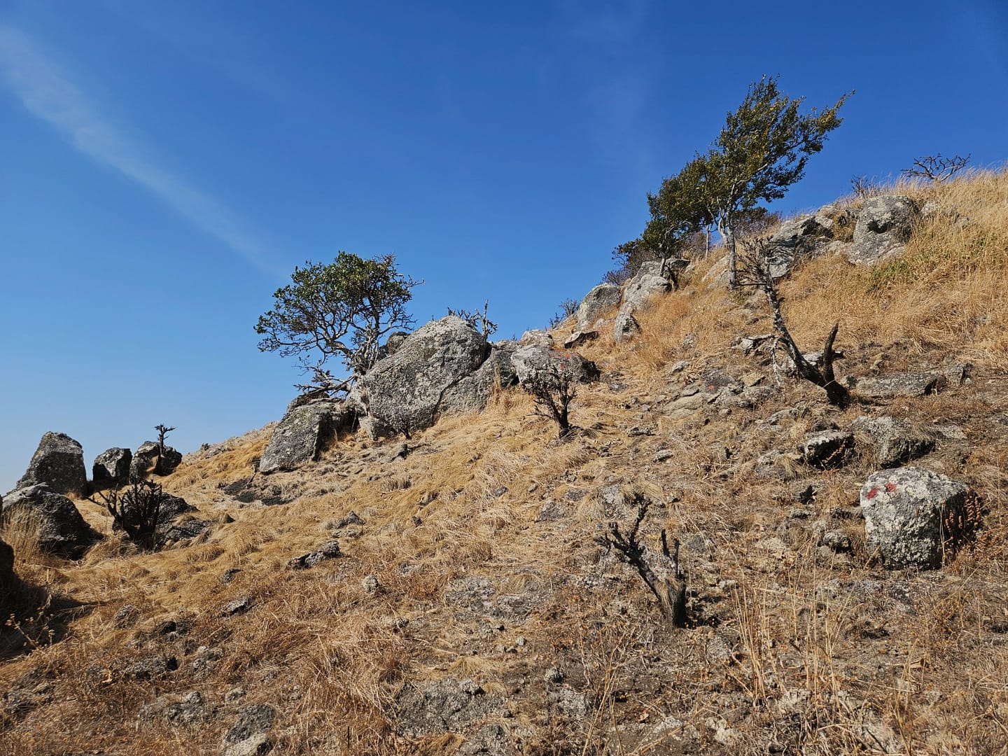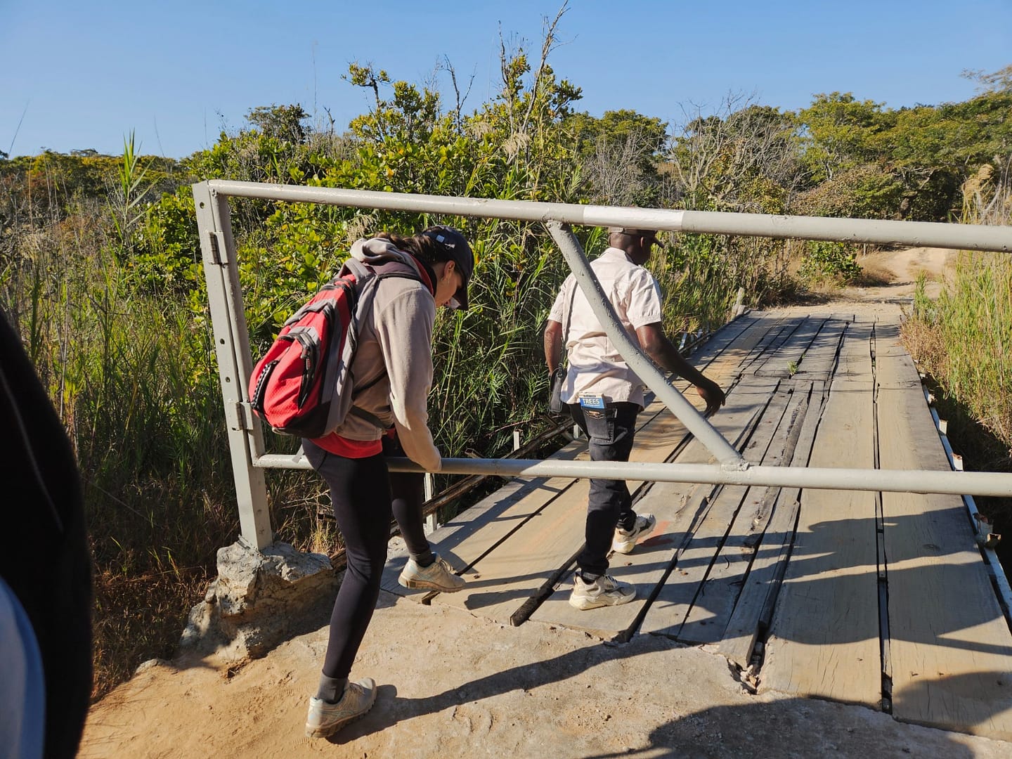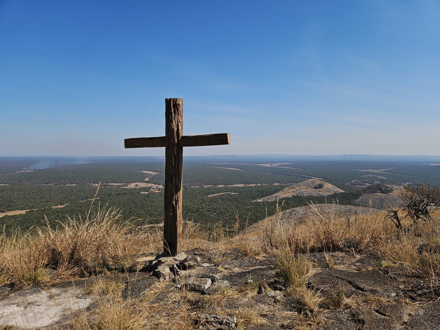 Nach etwa 3,6 Kilometern erreichen wir den Fuß des Berges, und von hier an wird der Aufstieg deutlich steiler. Zahlreiche rote Punkte weisen uns den Weg – Überbleibsel der Bergläufe, die hier vor Jahren regelmäßig stattfanden. Oben angekommen eröffnet sich ein atemberaubender Rundumblick: endlose Miombo-Wälder breiten sich bis zum Horizont aus, durchbrochen von markanten Granitkuppen, den sogenannten Inselbergen sowie den grünen Feuchtgebieten – den „Dambos“.