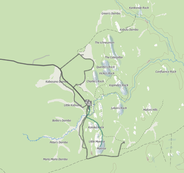 Der Kartenausschnitt zeigt die Motinondo-Berge, unsere Jeep-Route und den Gipfel Mayense, den wir bestiegen haben.