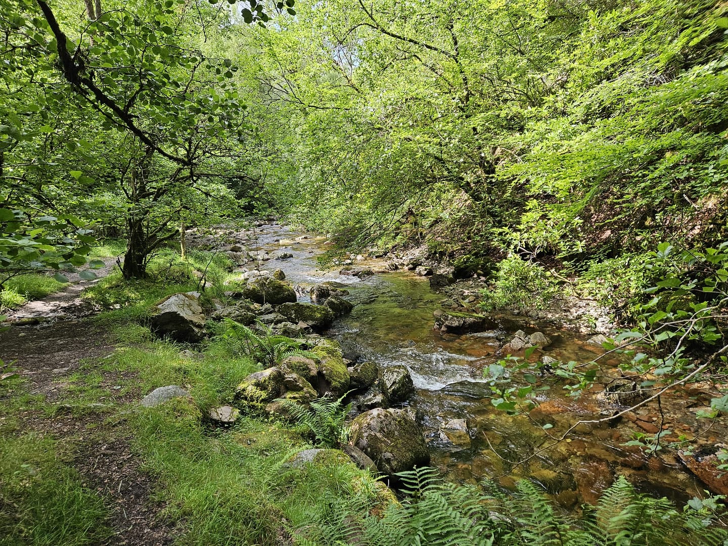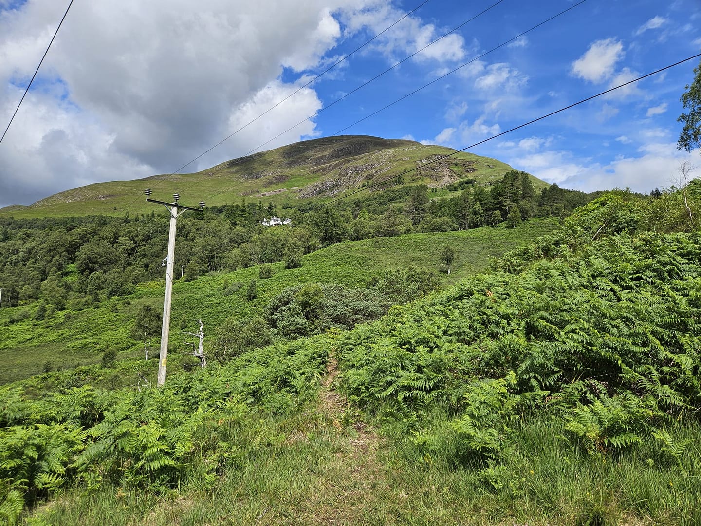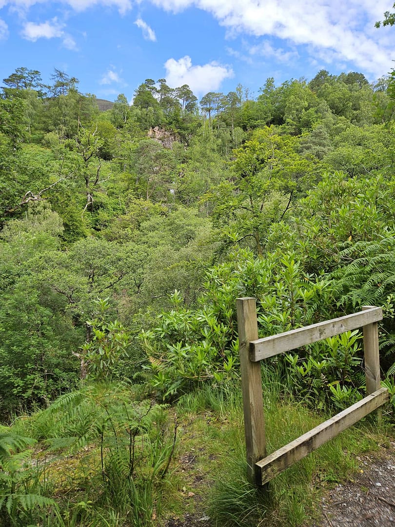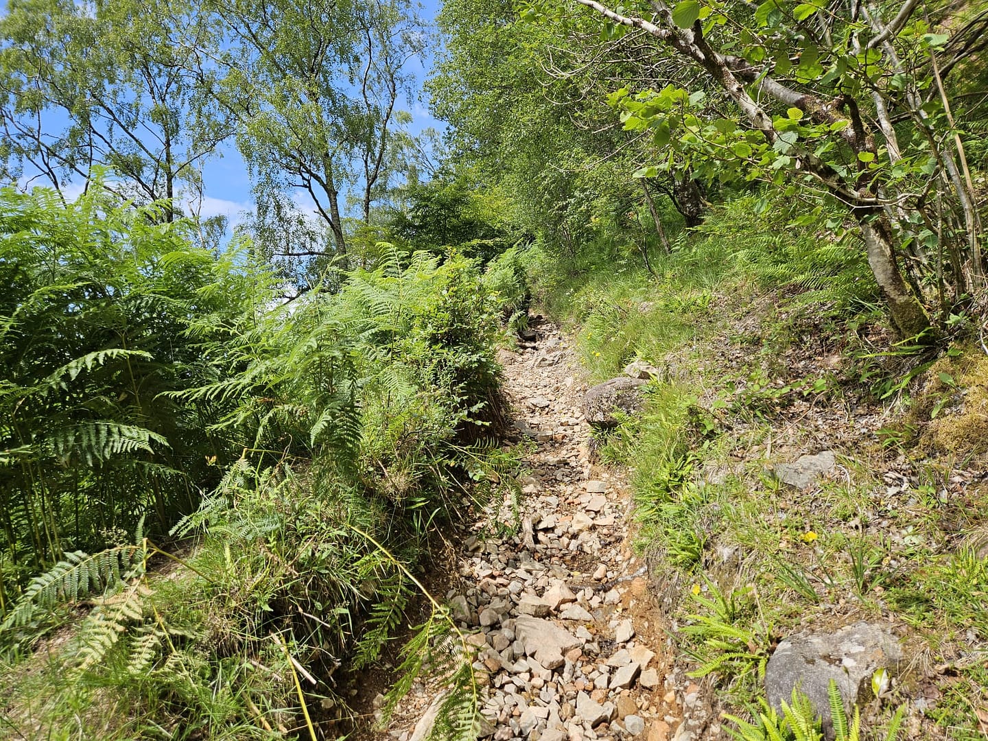 Vom Wasserfall aus folgten wir dem steileren Wanderweg weiter bergauf. Auf etwa 120 m Höhe war für uns jedoch Schluss: Eigentlich wollten wir bis zur Mamore Lodge weiterwandern und dann über die alte Militärstraße einen Rundweg zurücklegen. Doch wie schon auf anderen Touren hatte hier der Farn die Oberhand gewonnen. Da wir uns nicht erneut zahlreiche Zecken einfangen wollten, entschieden wir uns zur Umkehr.