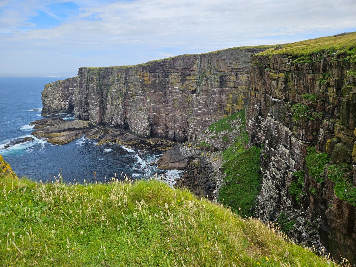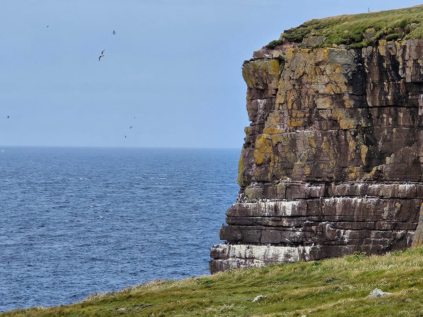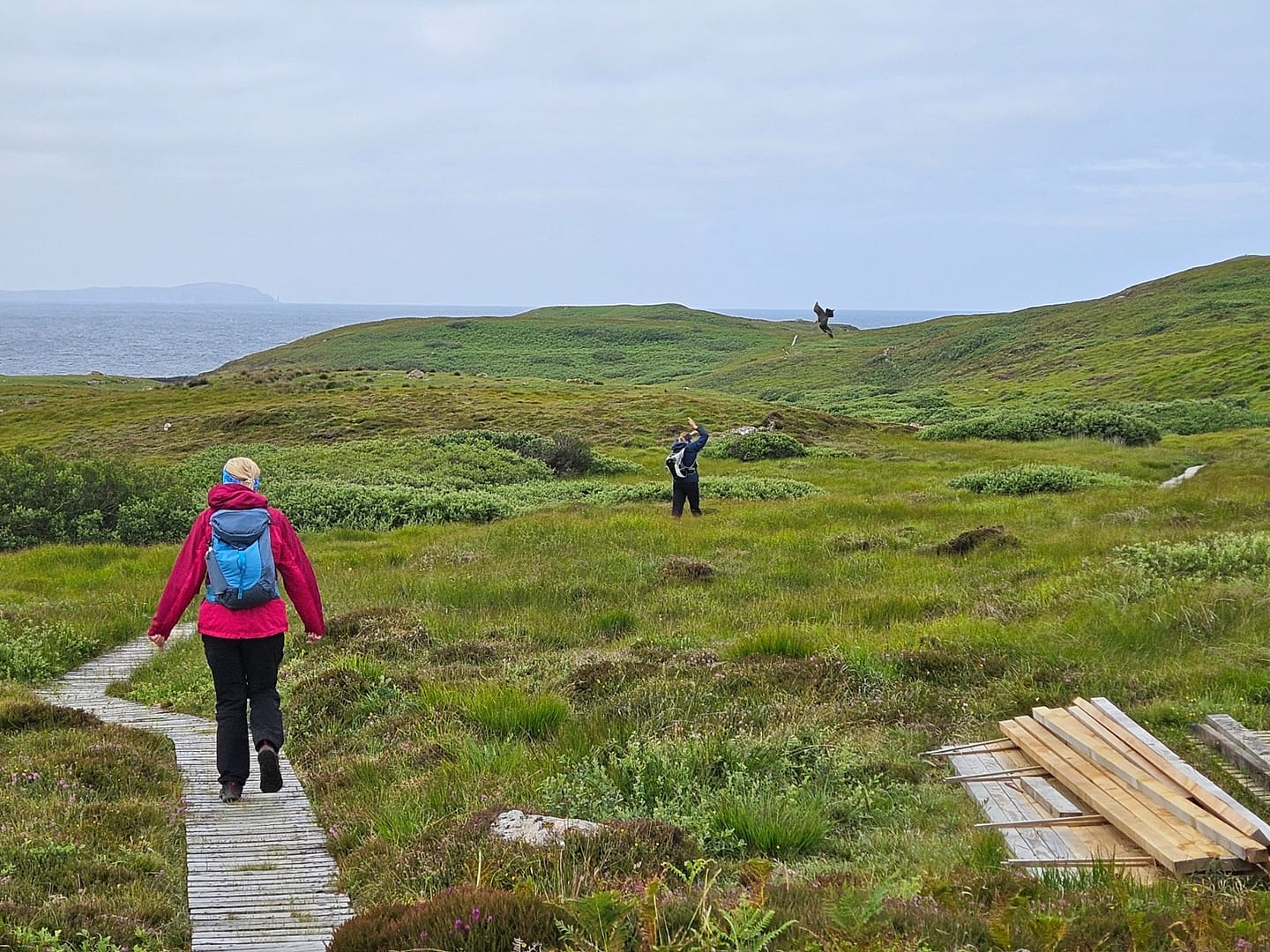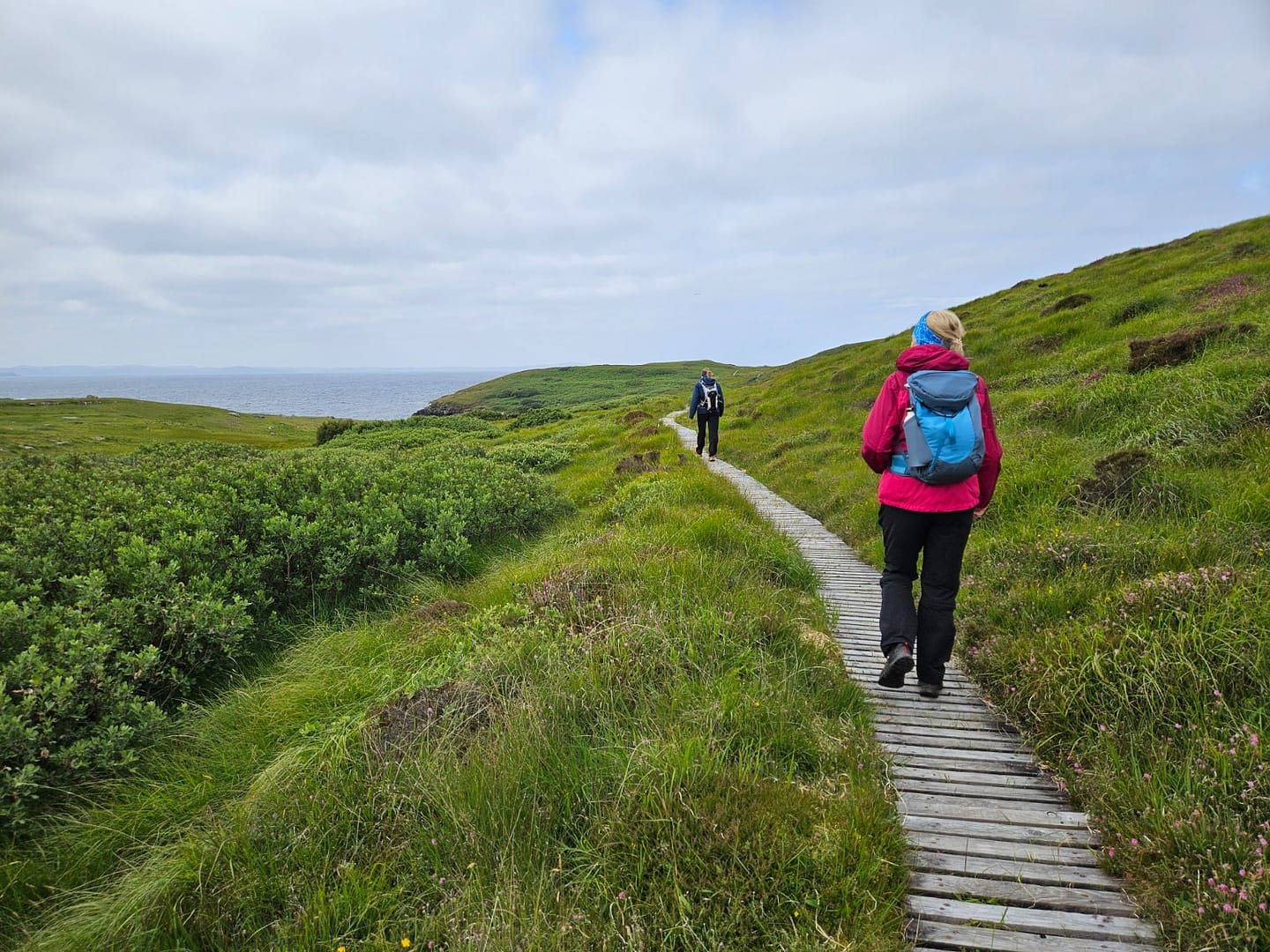 Das Inselinnere ist geprägt von weiten Heidelandschaften, Feuchtgebieten und Moorflächen, während die Küste mit dramatischen Klippen und beeindruckenden Meeressäulen einen starken Kontrast bildet. Es gibt einen festgelegten Rundweg mit nur wenigen Ausweichmöglichkeiten, um die Natur bestmöglich zu erhalten. Über angelegte Pfade, teilweise als Holzstege ausgeführt, ging es im Uhrzeigersinn zu den Aussichtspunkten und Vogelkolonien.