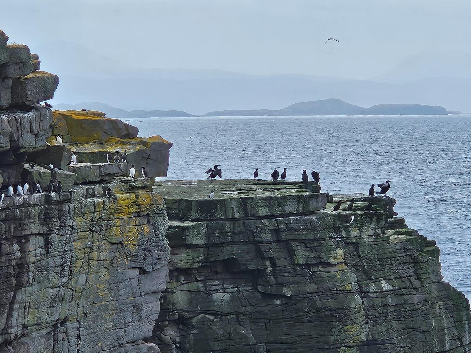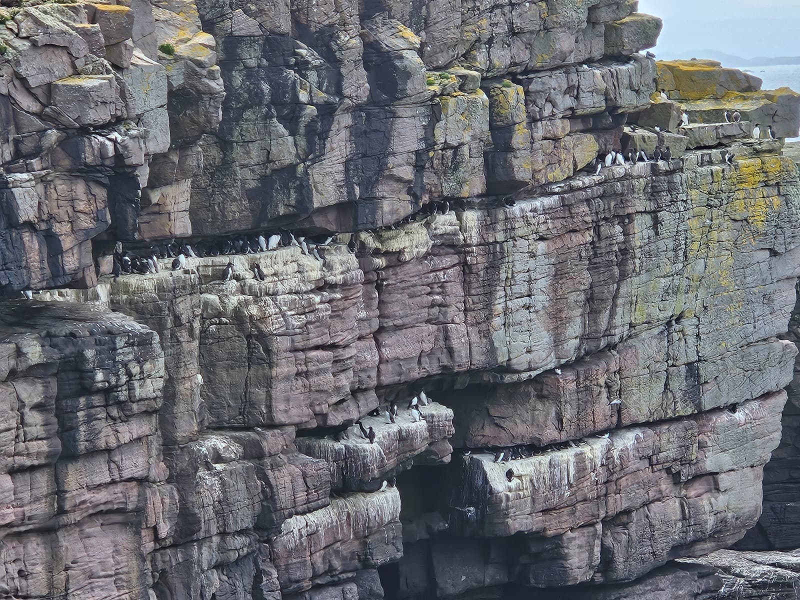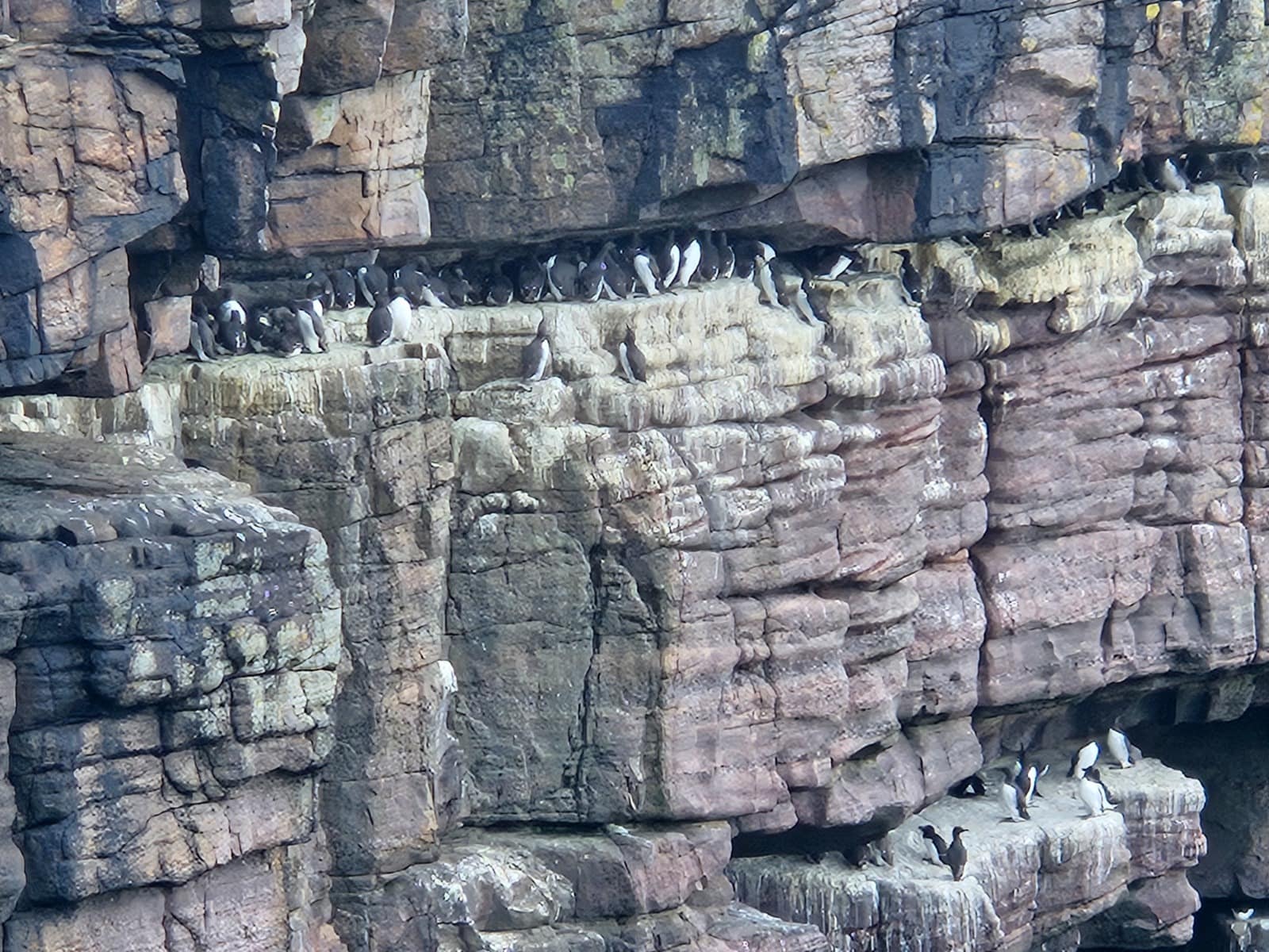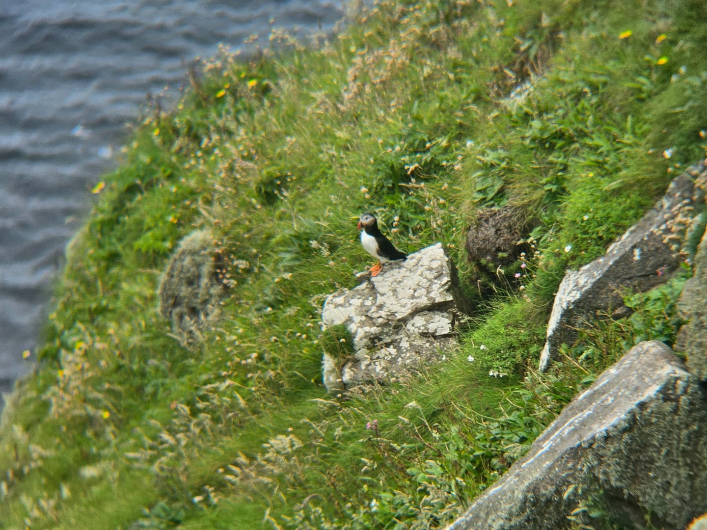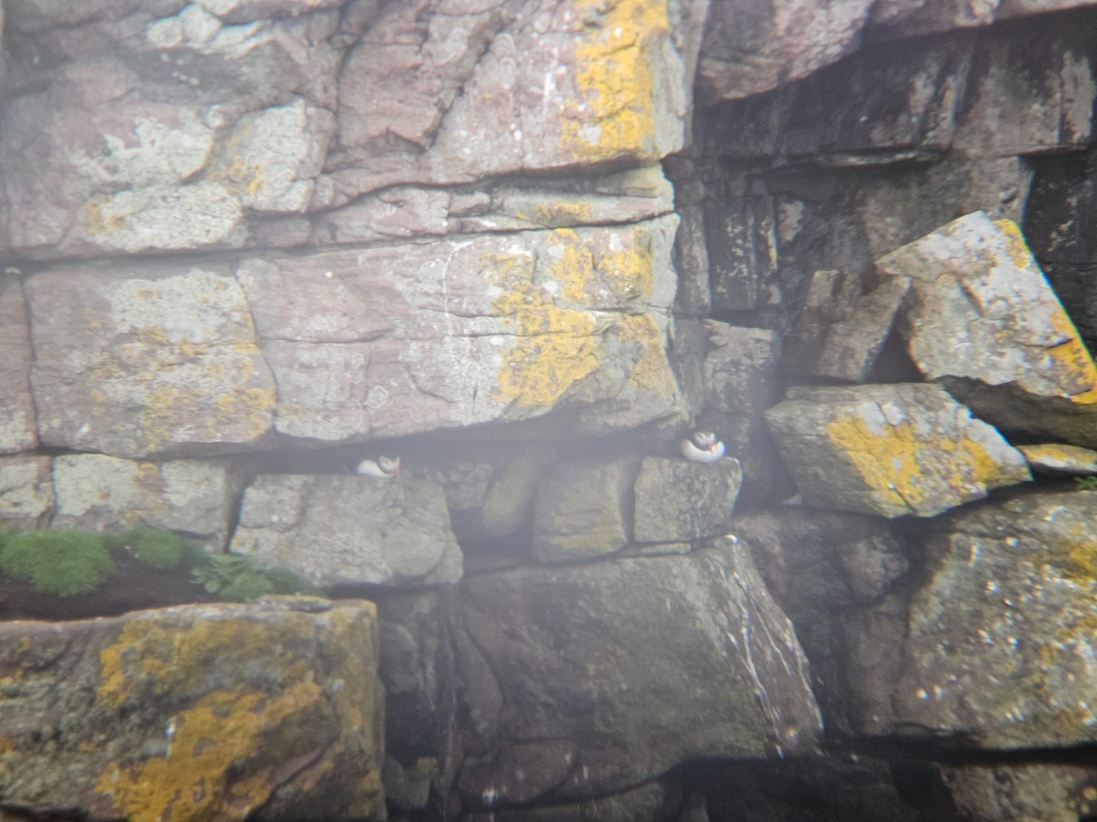 Dabei konnten wir zahlreiche Seevögel beobachten, darunter Trottellummen (eine der größten Kolonien im Vereinigten Königreich), Austernfischer, Tordalken, Dreizehenmöwen, Eissturmvögel, Papageientaucher und Skuas (Große Raubmöwen). Handa Island ist außerdem bekannt für mögliche Sichtungen von Meeressäugern wie Delfinen, Robben, Zwergwalen (Minky-Walen) und gelegentlich sogar Riesenhaien. Diese blieben uns zwar verborgen, doch in der Boulder Bay hatten wir Glück und konnten zwei Robben im Meer beobachten.