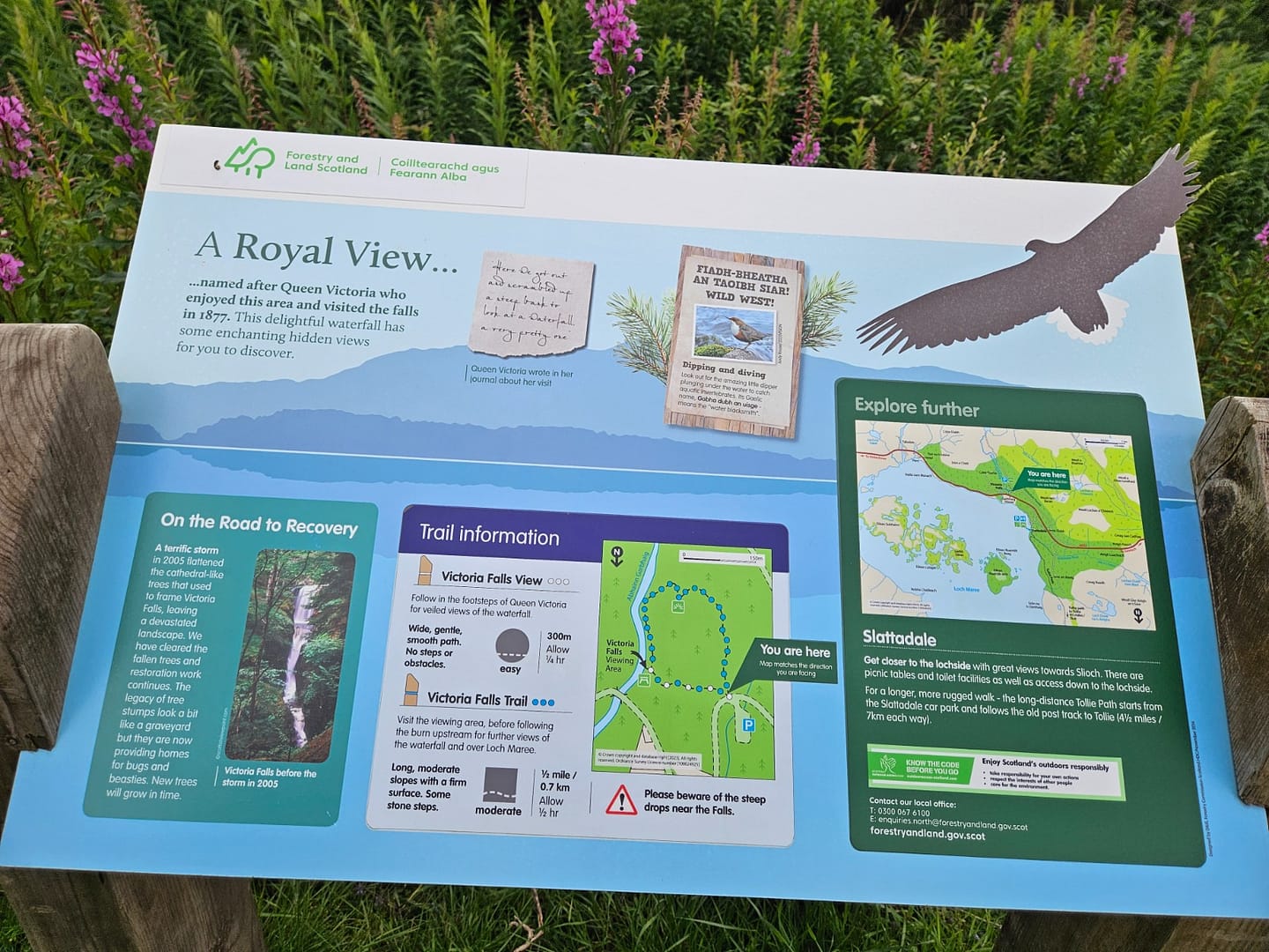 Vom Parkplatz aus erreicht man den Wasserfall in nur wenigen Minuten über einen gut ausgeschilderten, leicht begehbaren Pfad. Direkt am Wasserfall befindet sich eine Aussichtsplattform, von der aus sich das Naturschauspiel in Ruhe genießen lässt. Gespeist wird der Wasserfall vom Abhainn Garbhaig, einem kleinen Fluss, der vom Loch Garbhaig hinunter zum Loch Maree fließt.