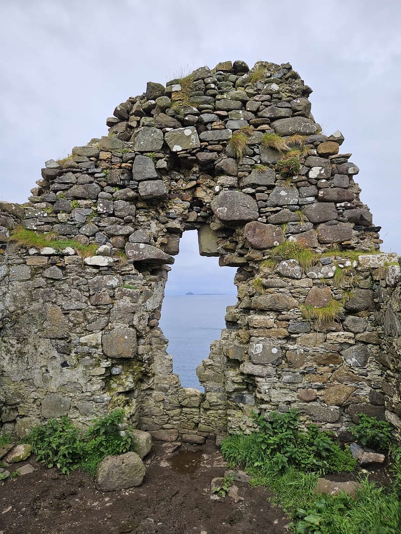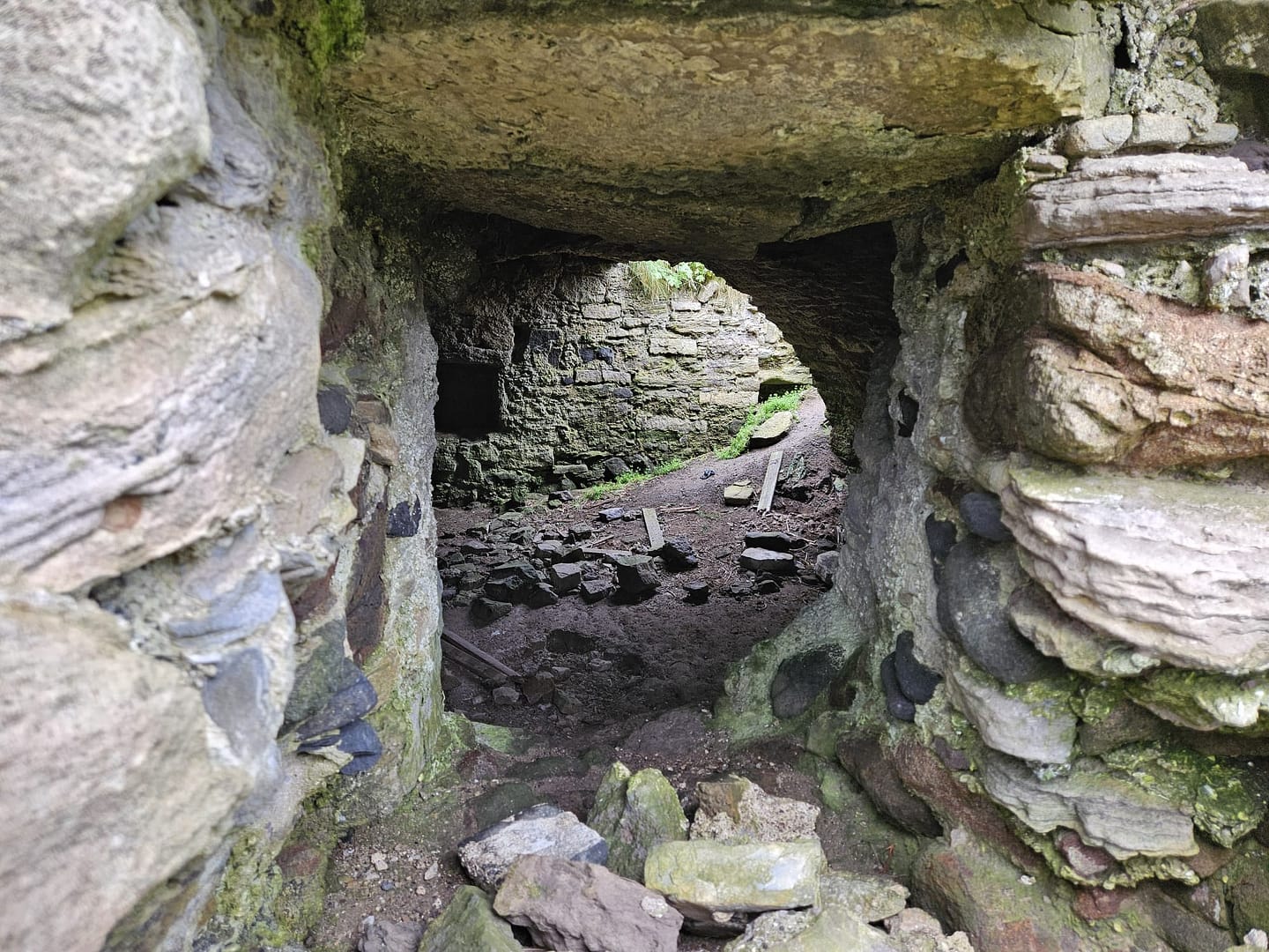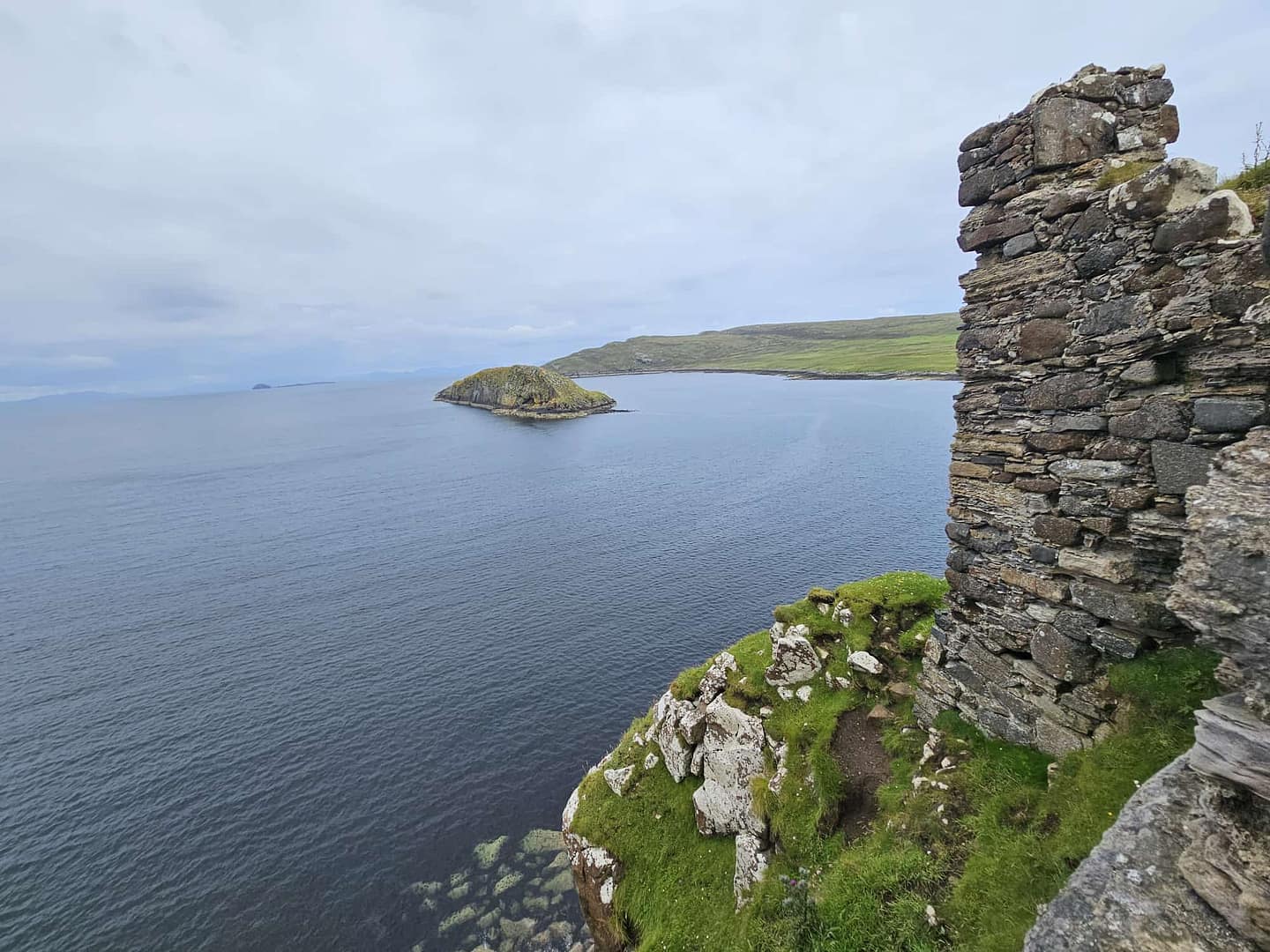 Ein gut begehbarer Küstenpfad führt wenige hundert Meter vom Straßenrand zur Ruine, die einst eine mittelalterliche Spornburg war – also auf einem vorspringenden Felsrücken errichtet, mit steil abfallenden Klippen auf drei Seiten. Die Burg wurde im 14. und 15. Jahrhundert erbaut und strategisch klug positioniert.